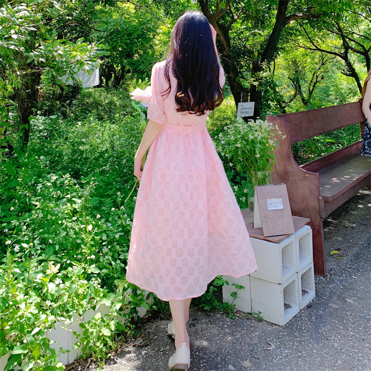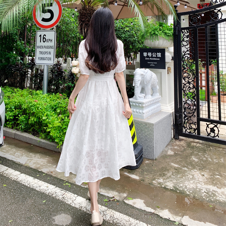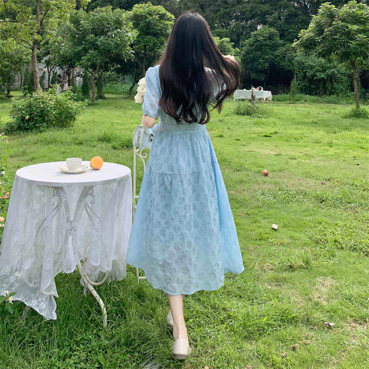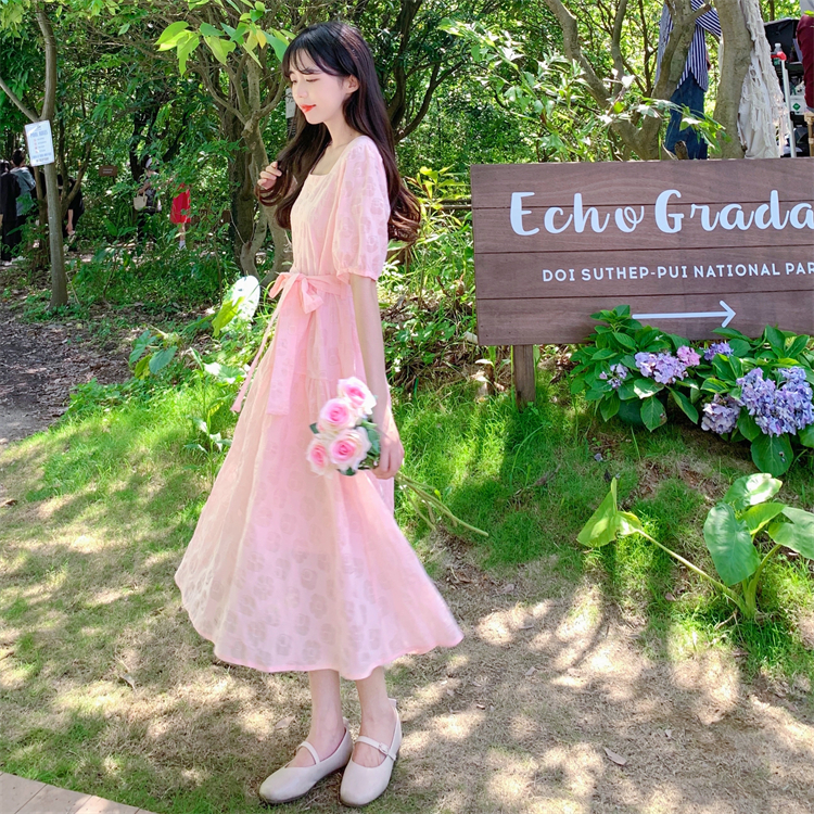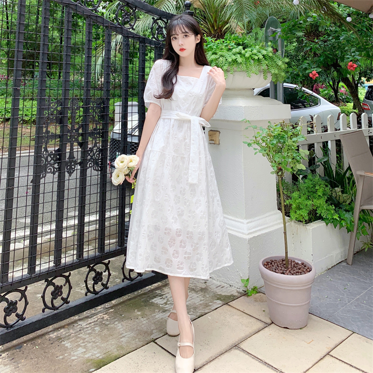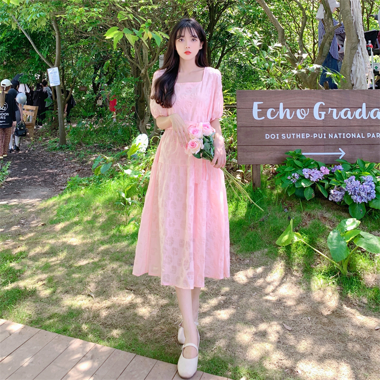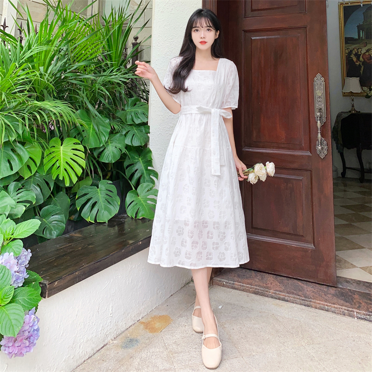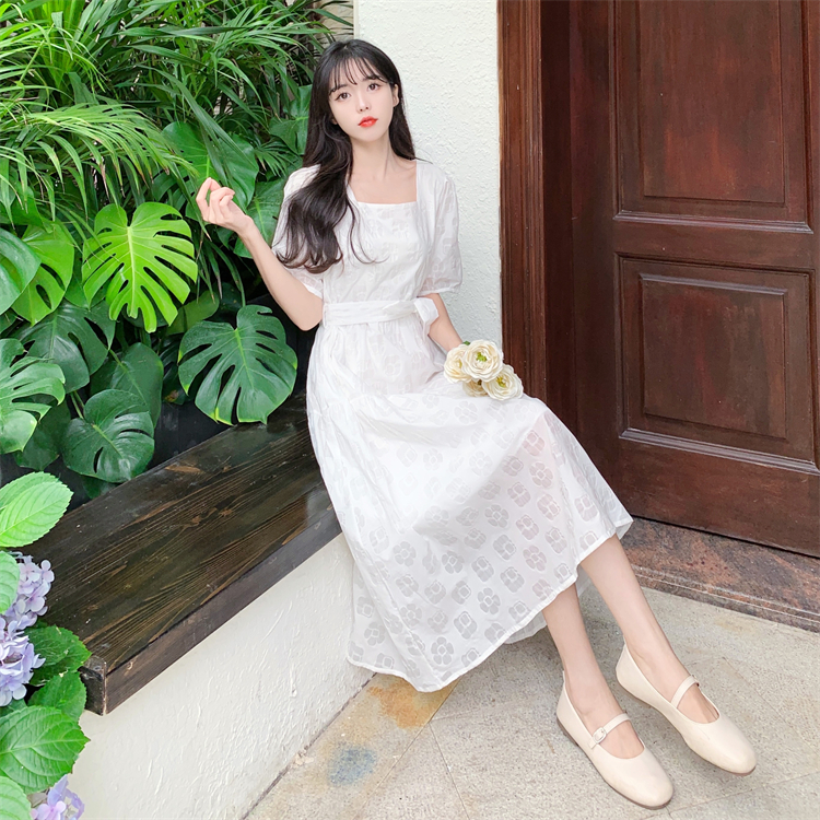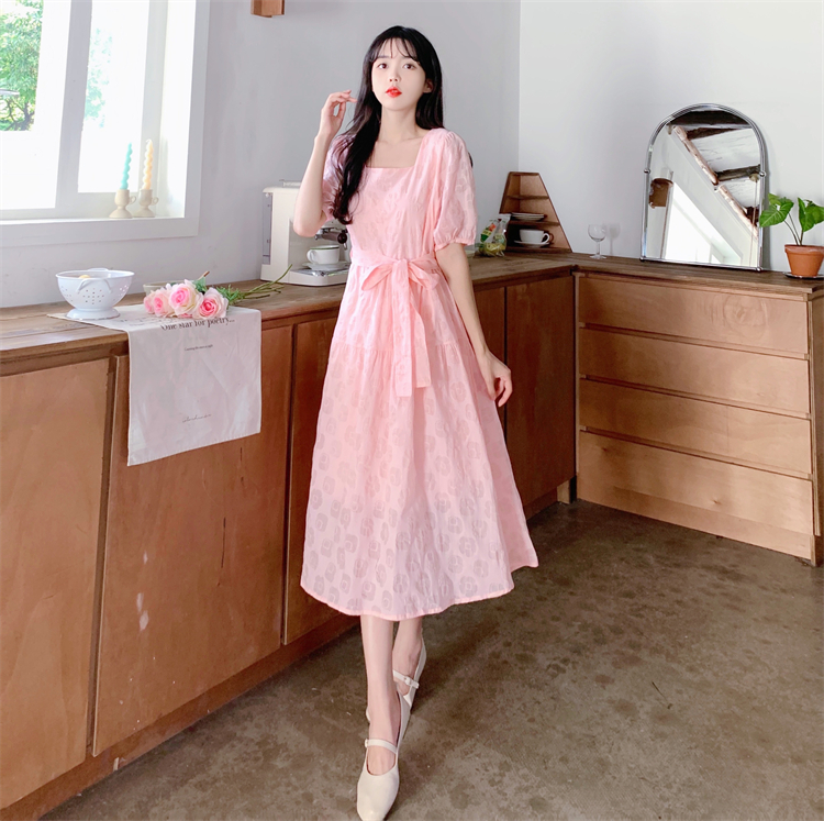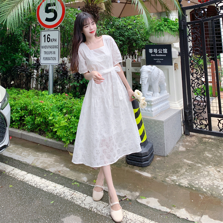 RM13688#大码女装夏小众设计高级感法式方领泡泡袖气质收腰系带a字连衣裙
