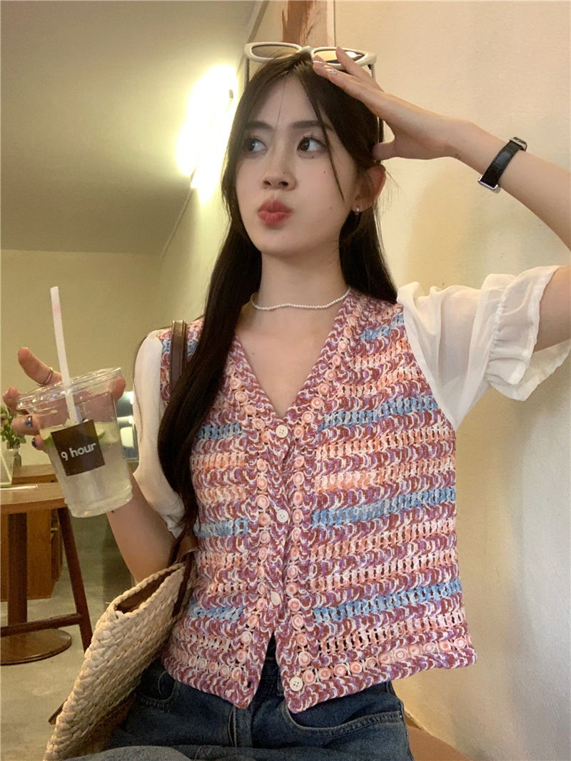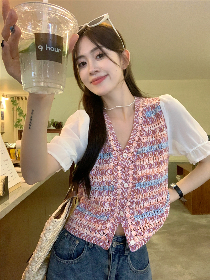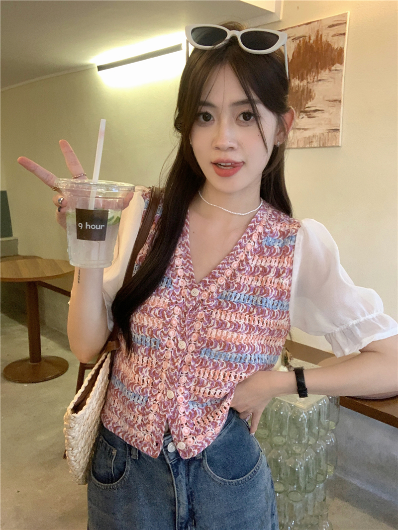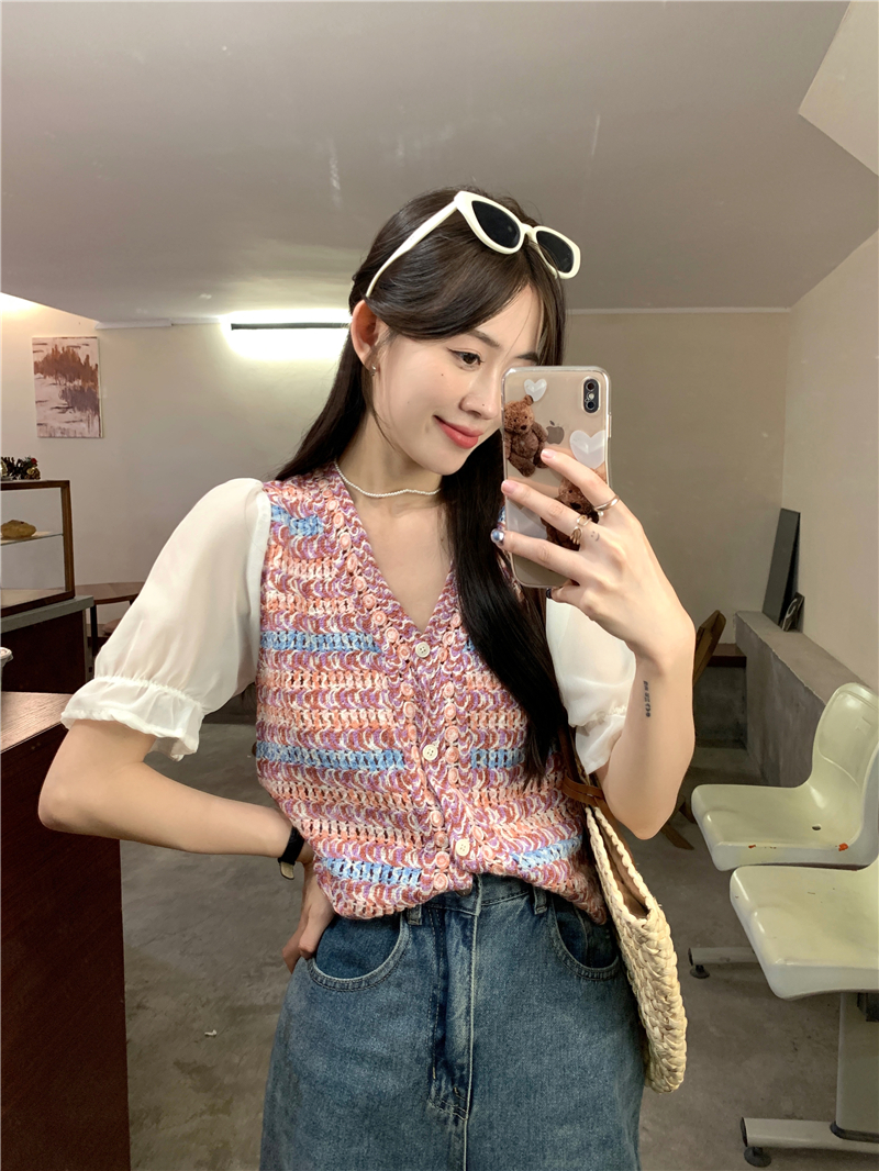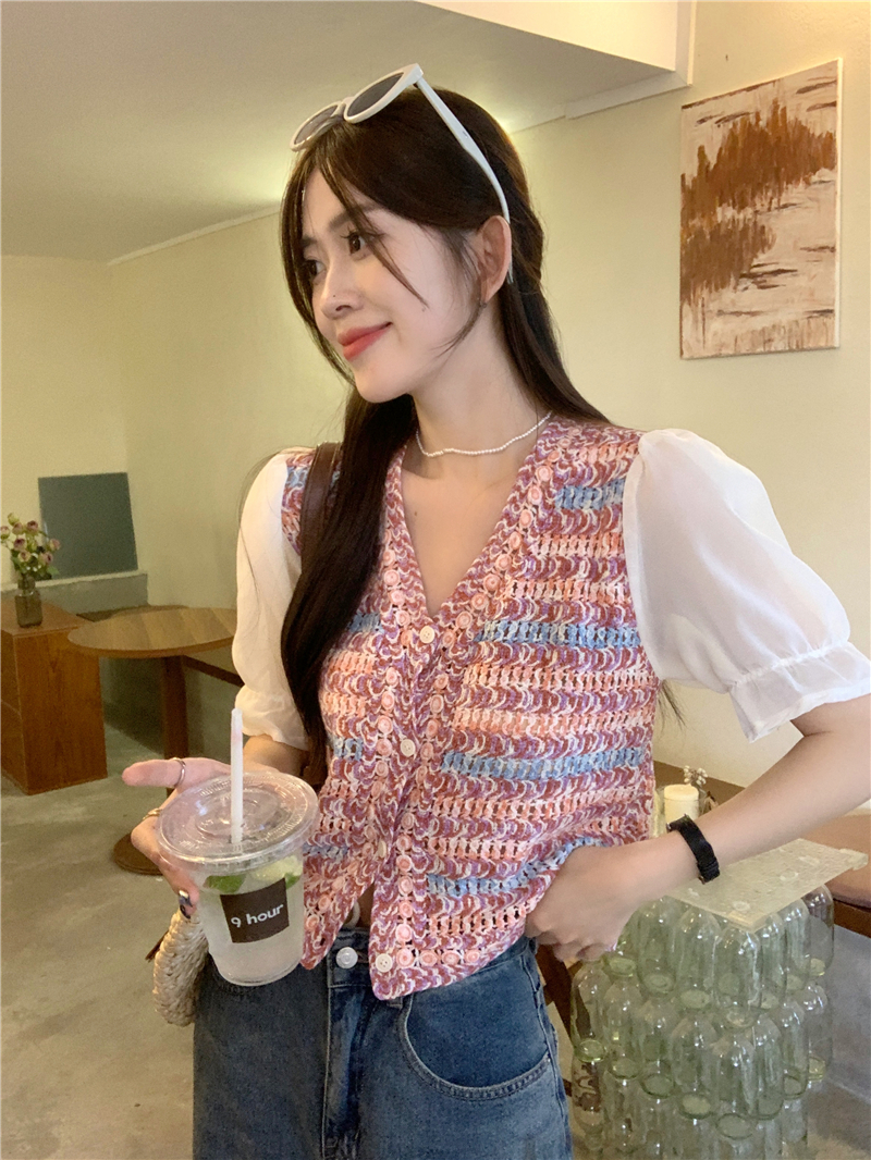 RM13748#泡泡袖拼接镂空针织衫设计感拼色甜美减龄单排扣短袖上衣