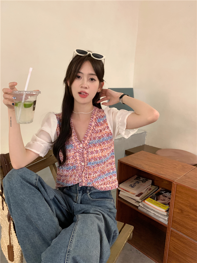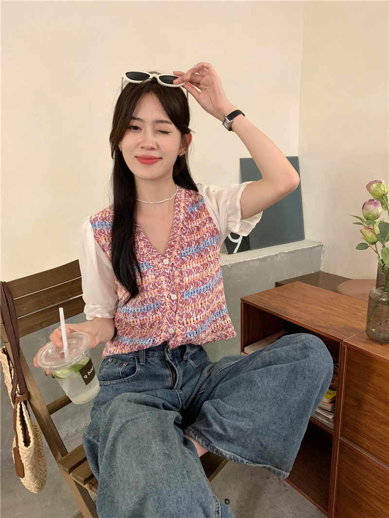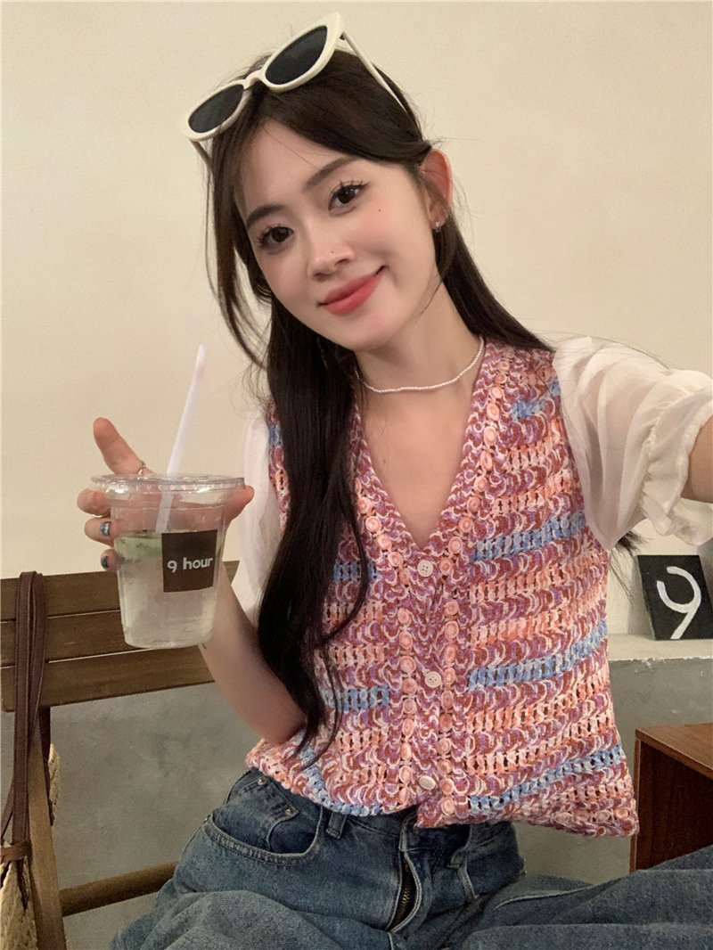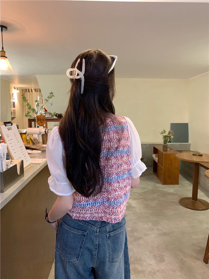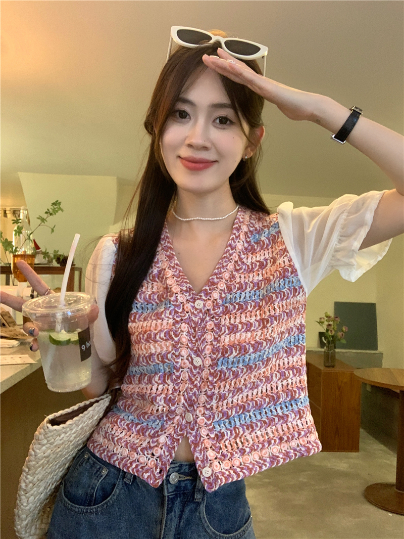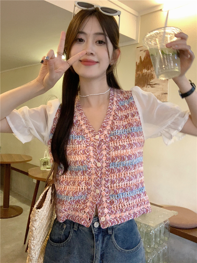 RM13748#泡泡袖拼接镂空针织衫设计感拼色甜美减龄单排扣短袖上衣