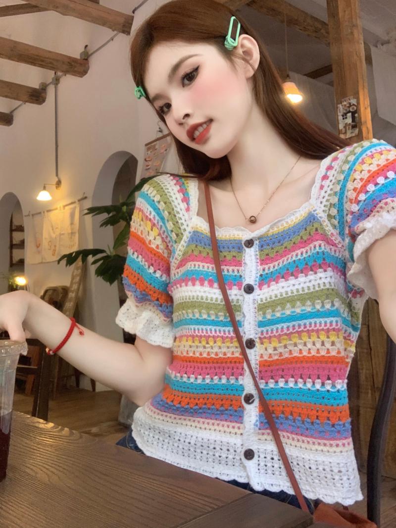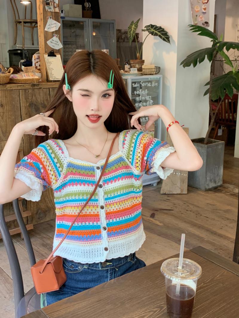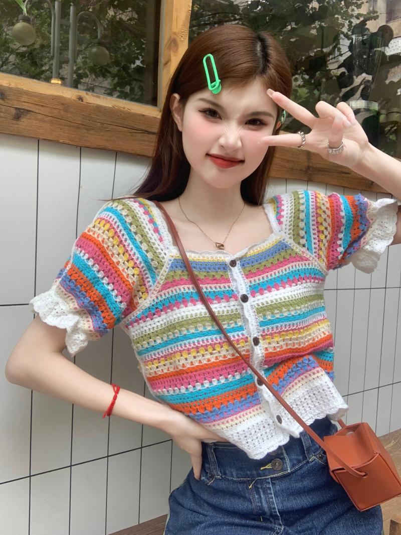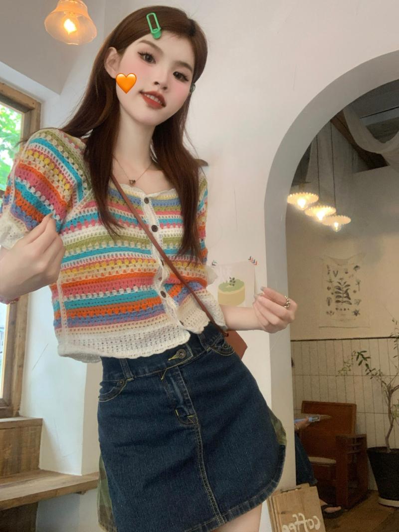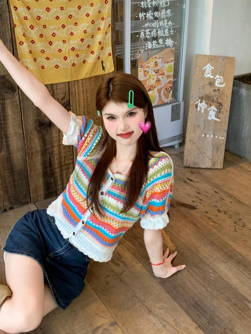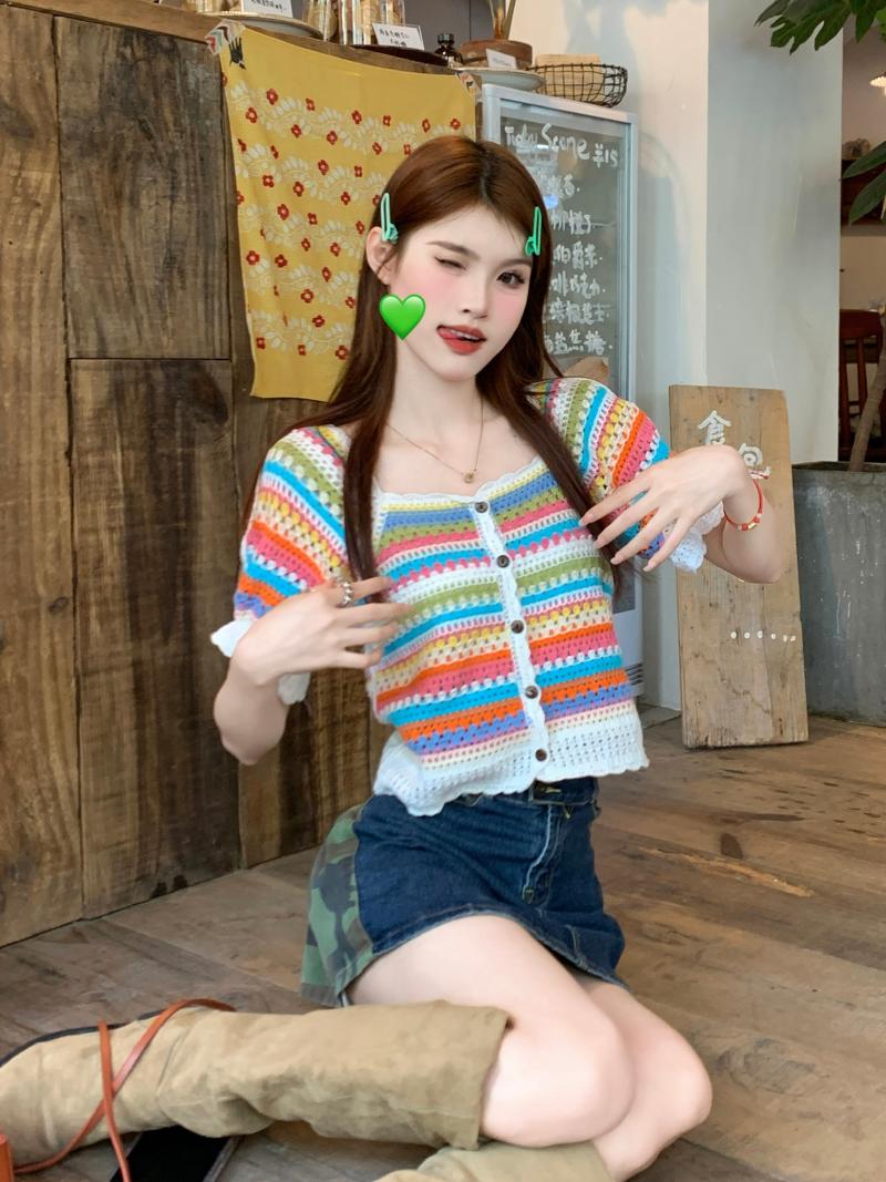 RM13749#彩虹色条纹方领针织开衫女夏季韩版显瘦网红超火小上衣