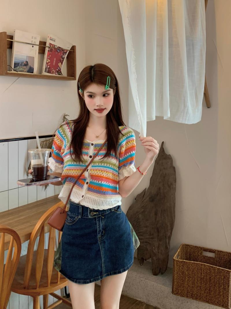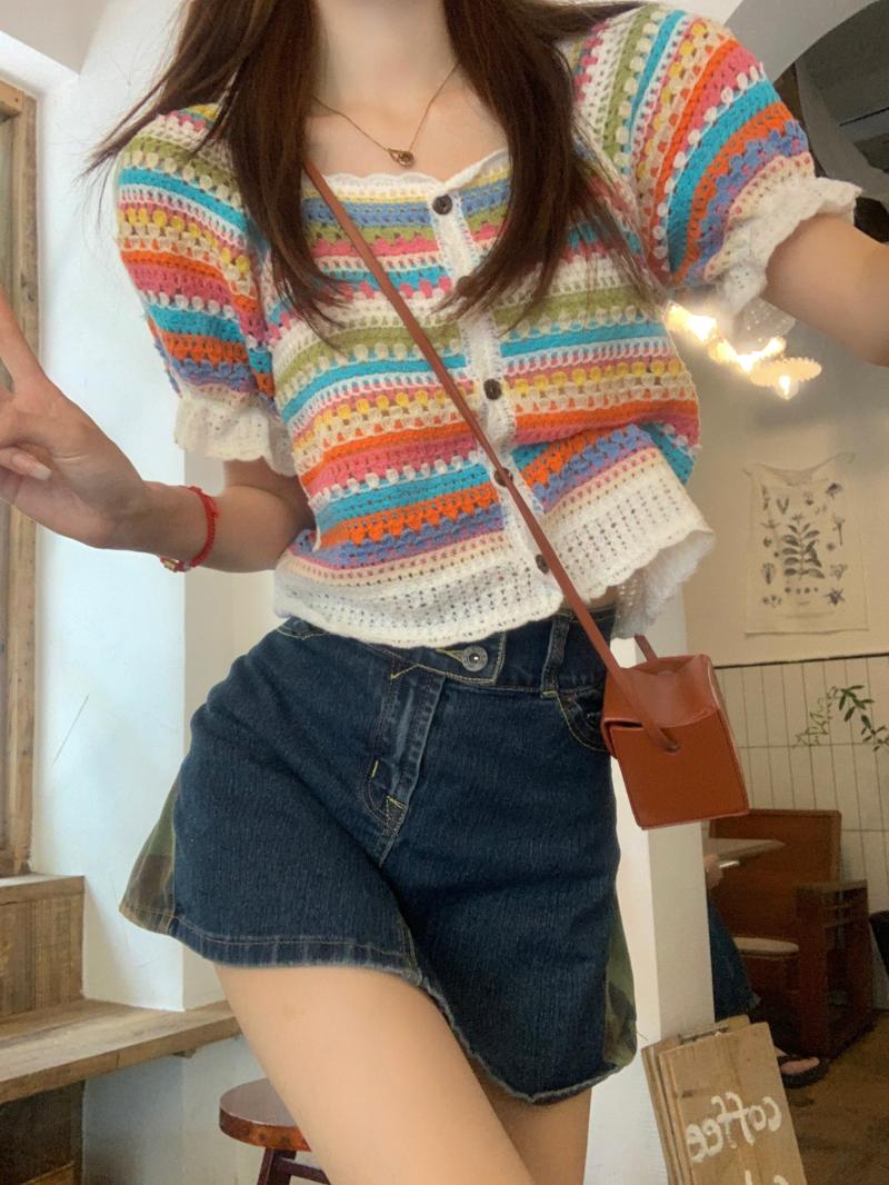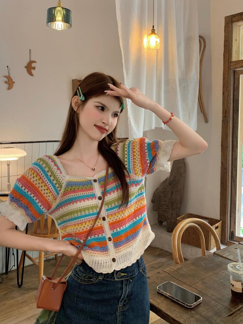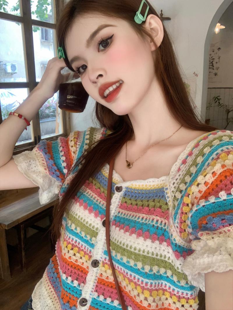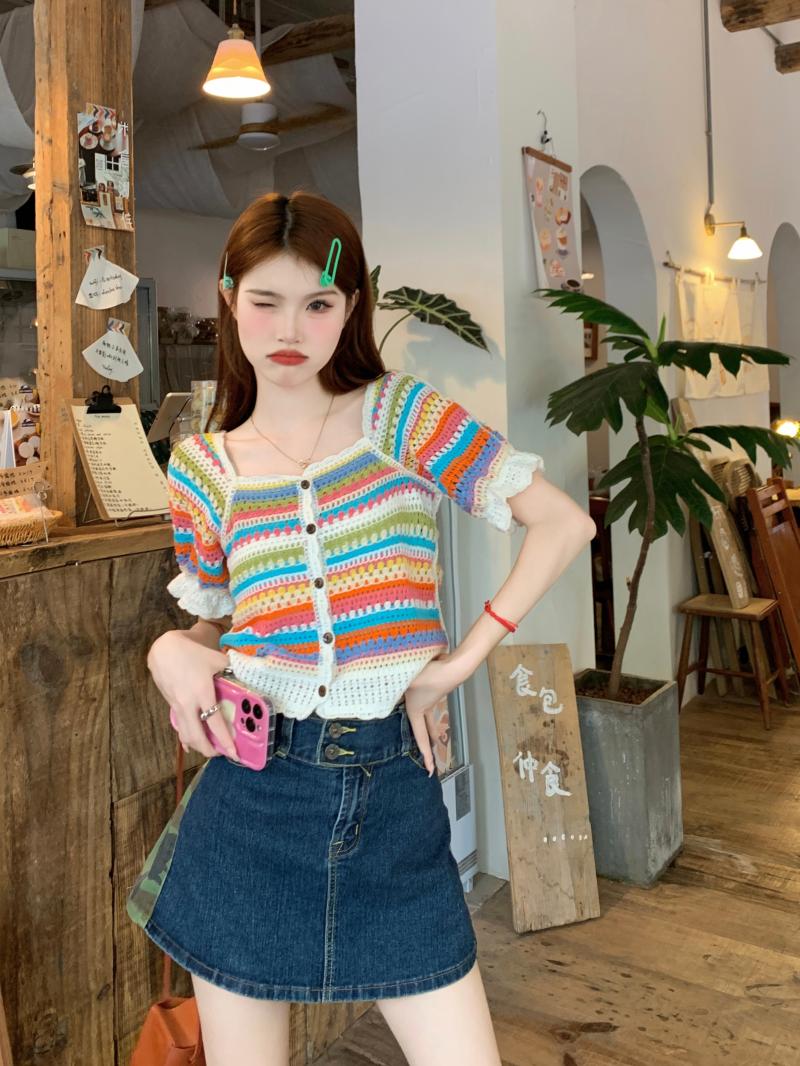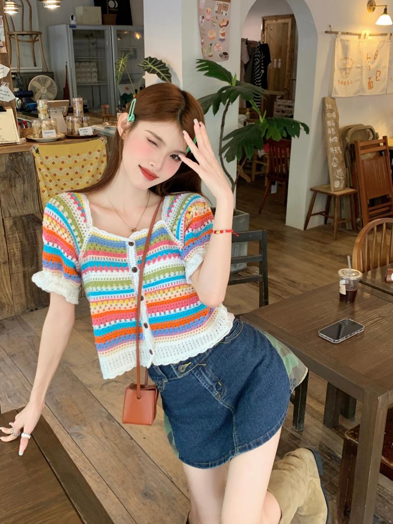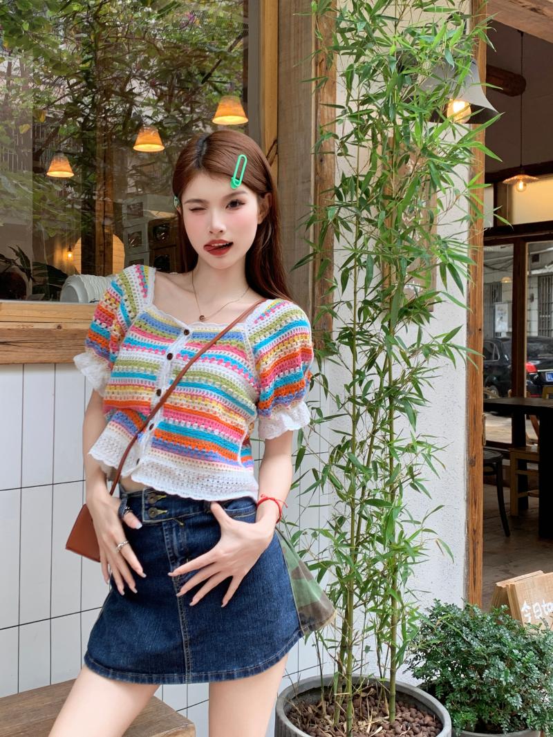 RM13749#彩虹色条纹方领针织开衫女夏季韩版显瘦网红超火小上衣