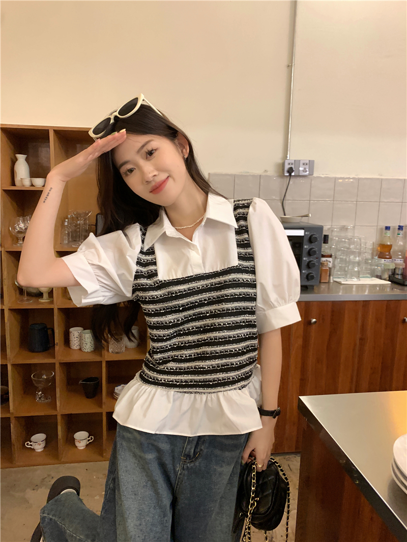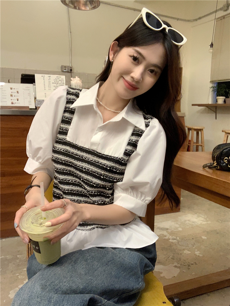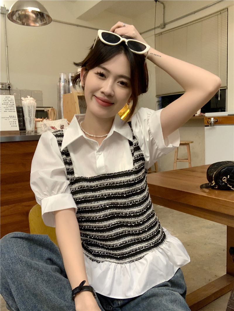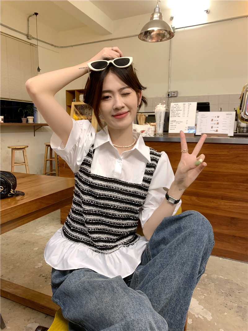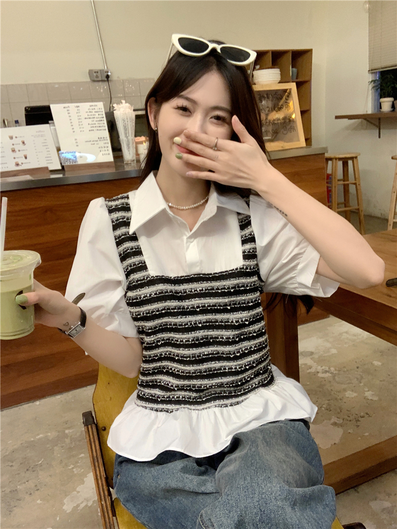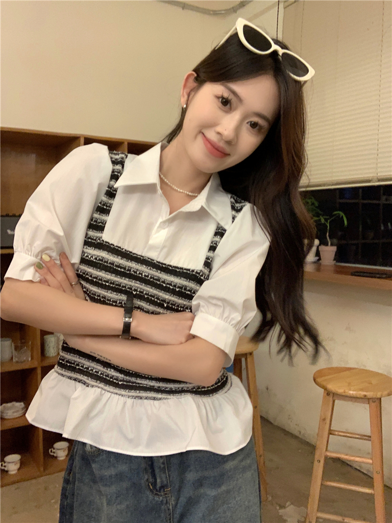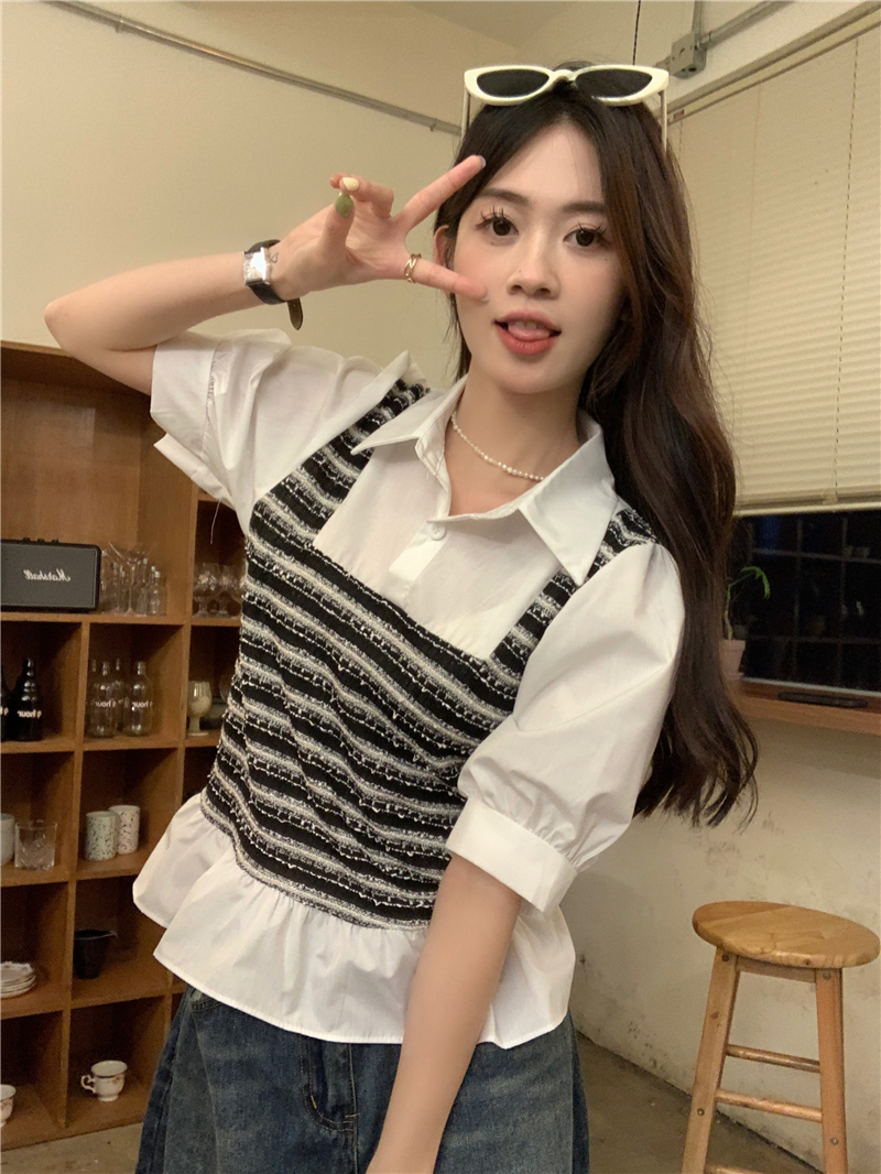 RM13757#夏季衬衫女设计感格拼接假两件短款气质法式短袖上衣