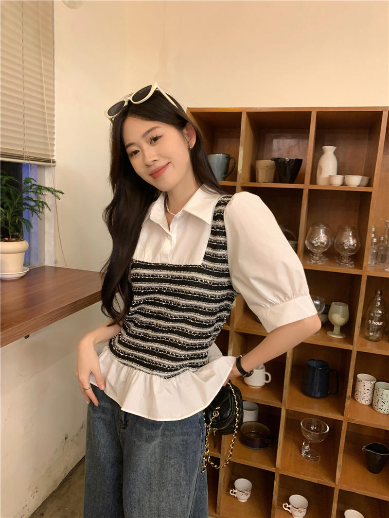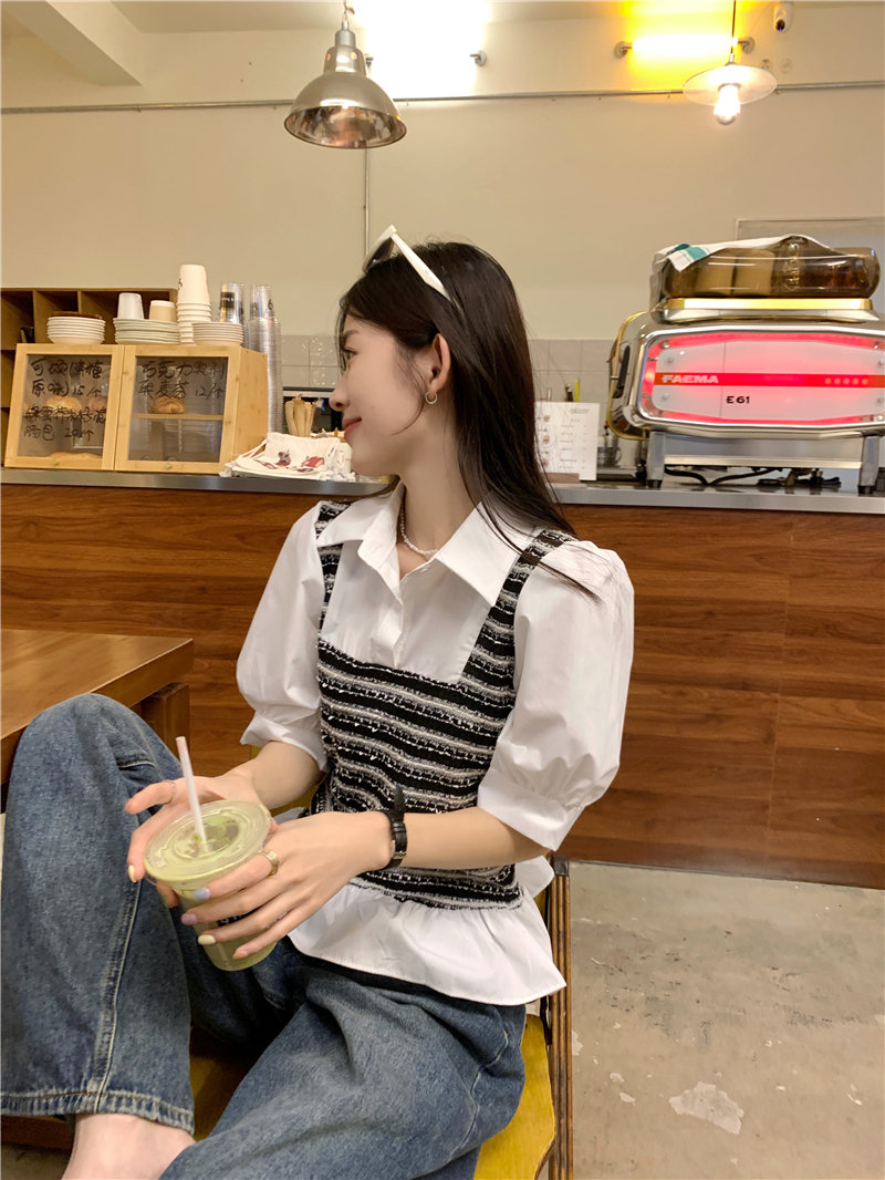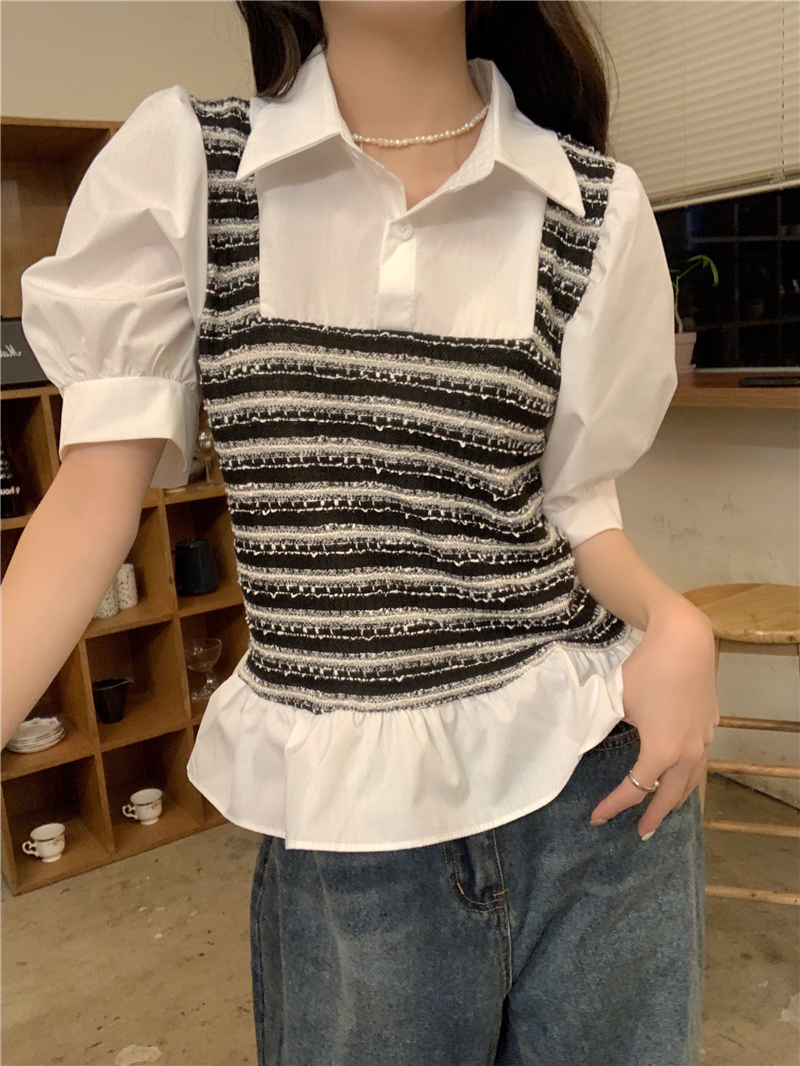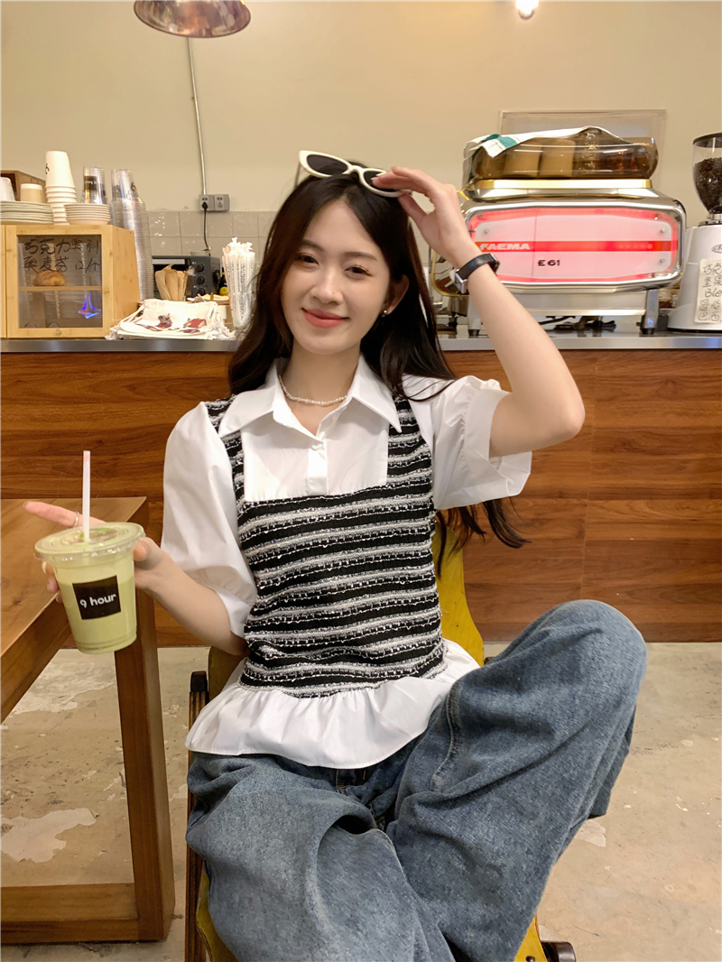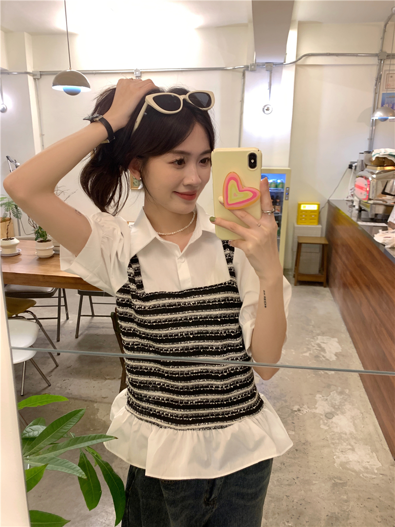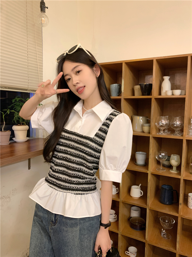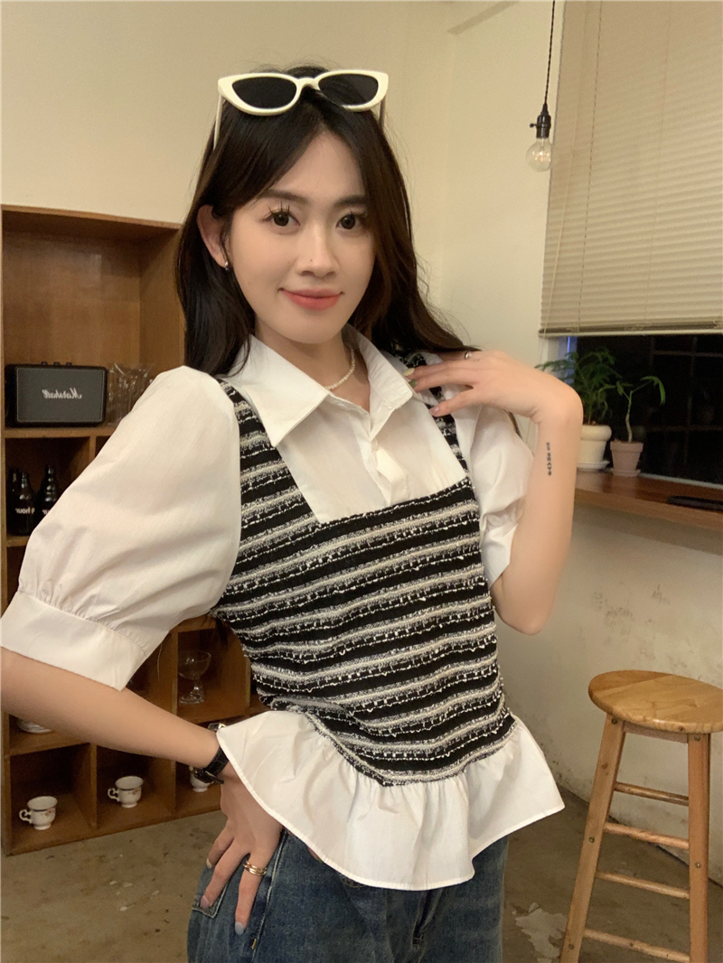 RM13757#夏季衬衫女设计感格拼接假两件短款气质法式短袖上衣
