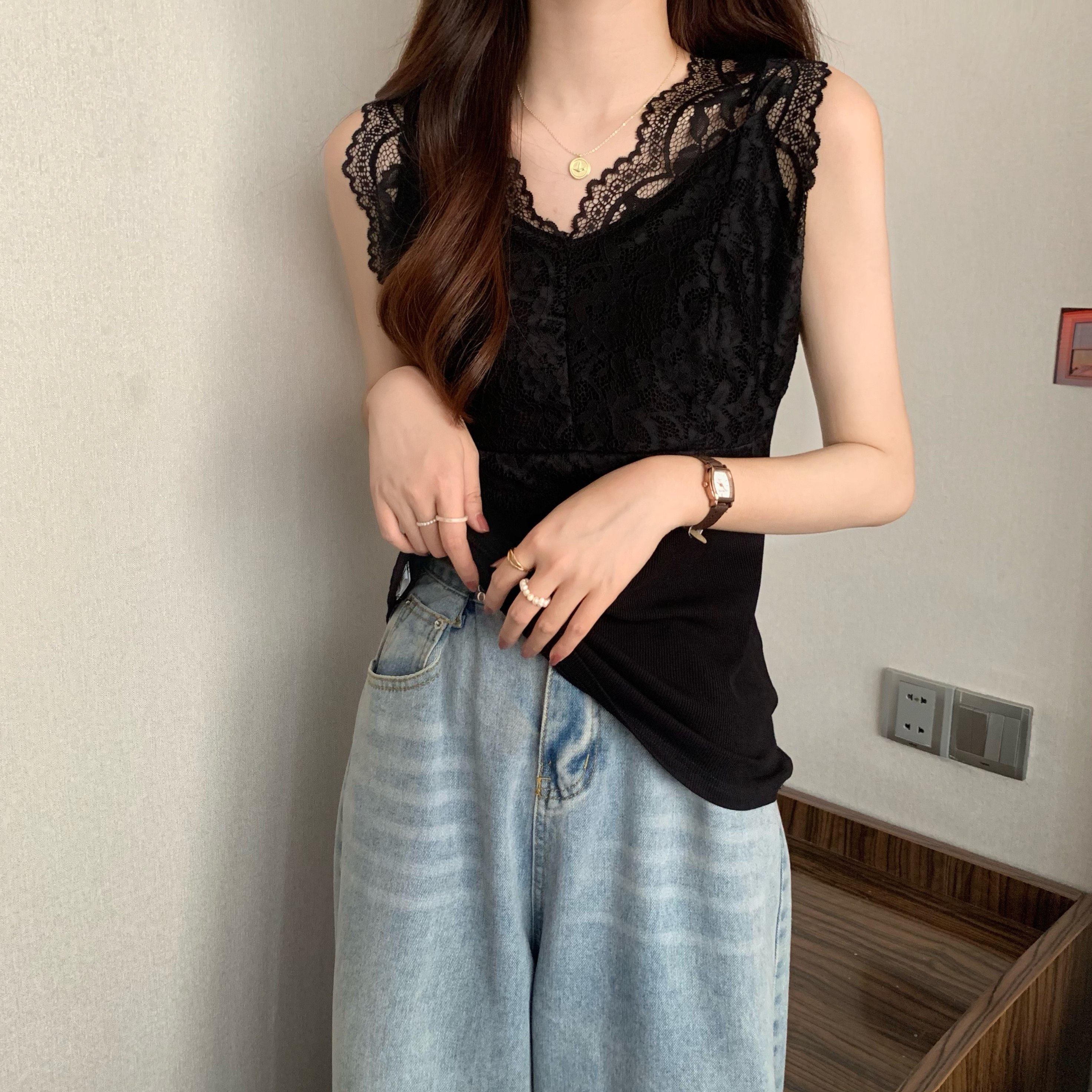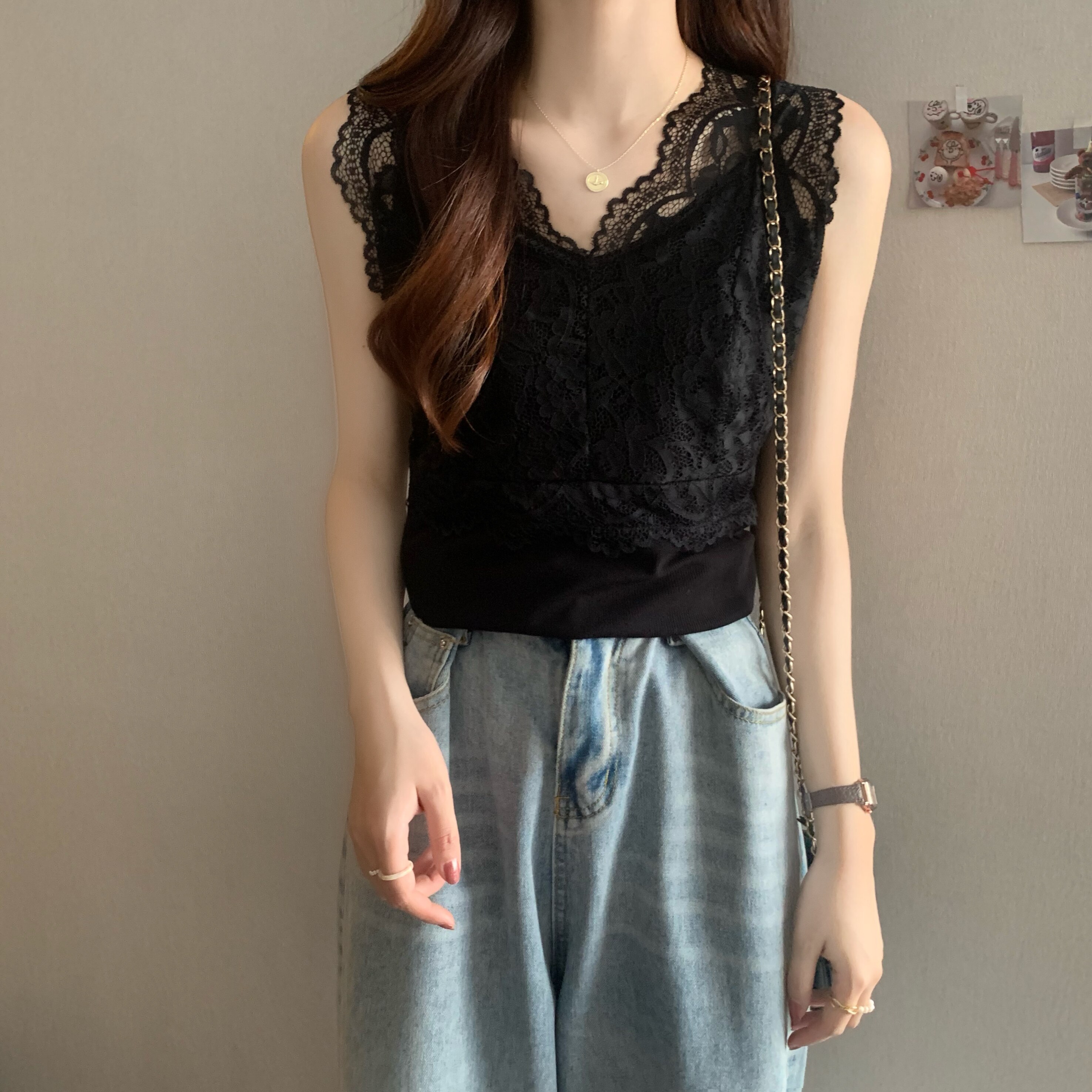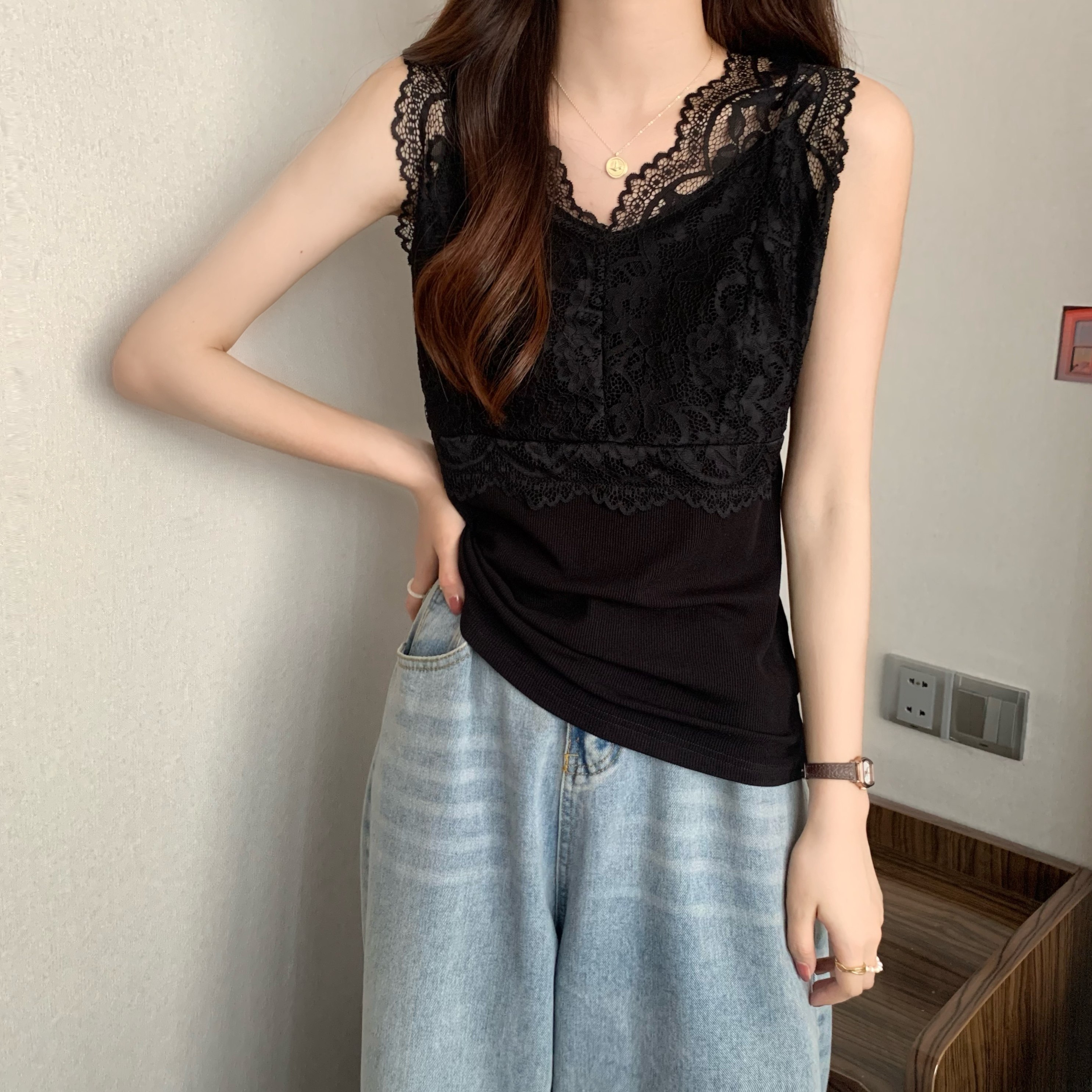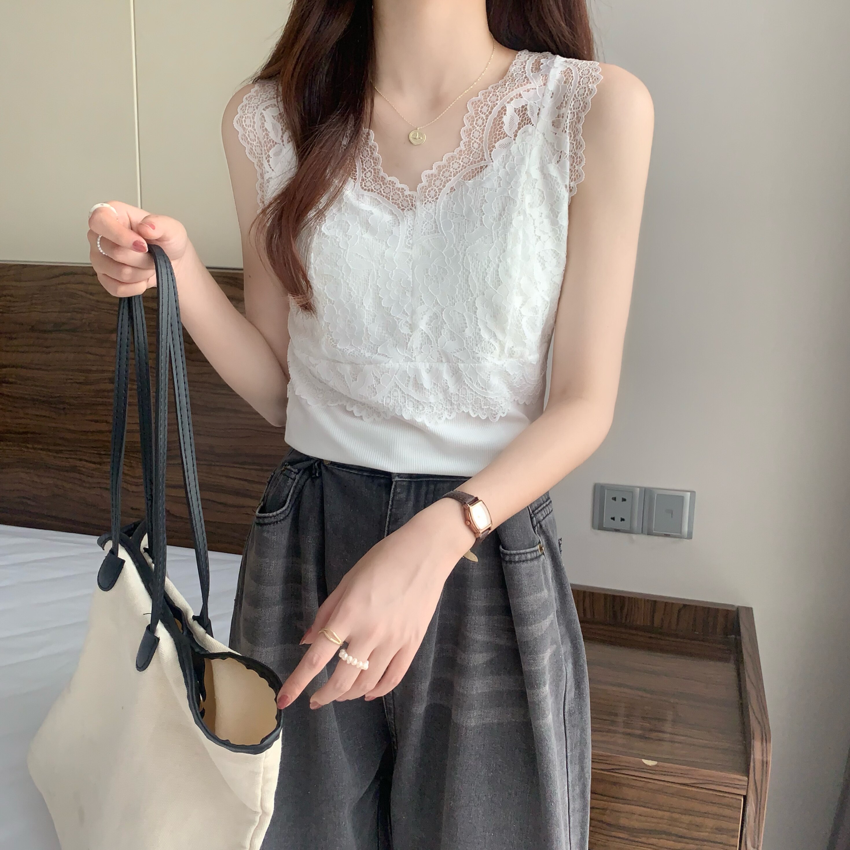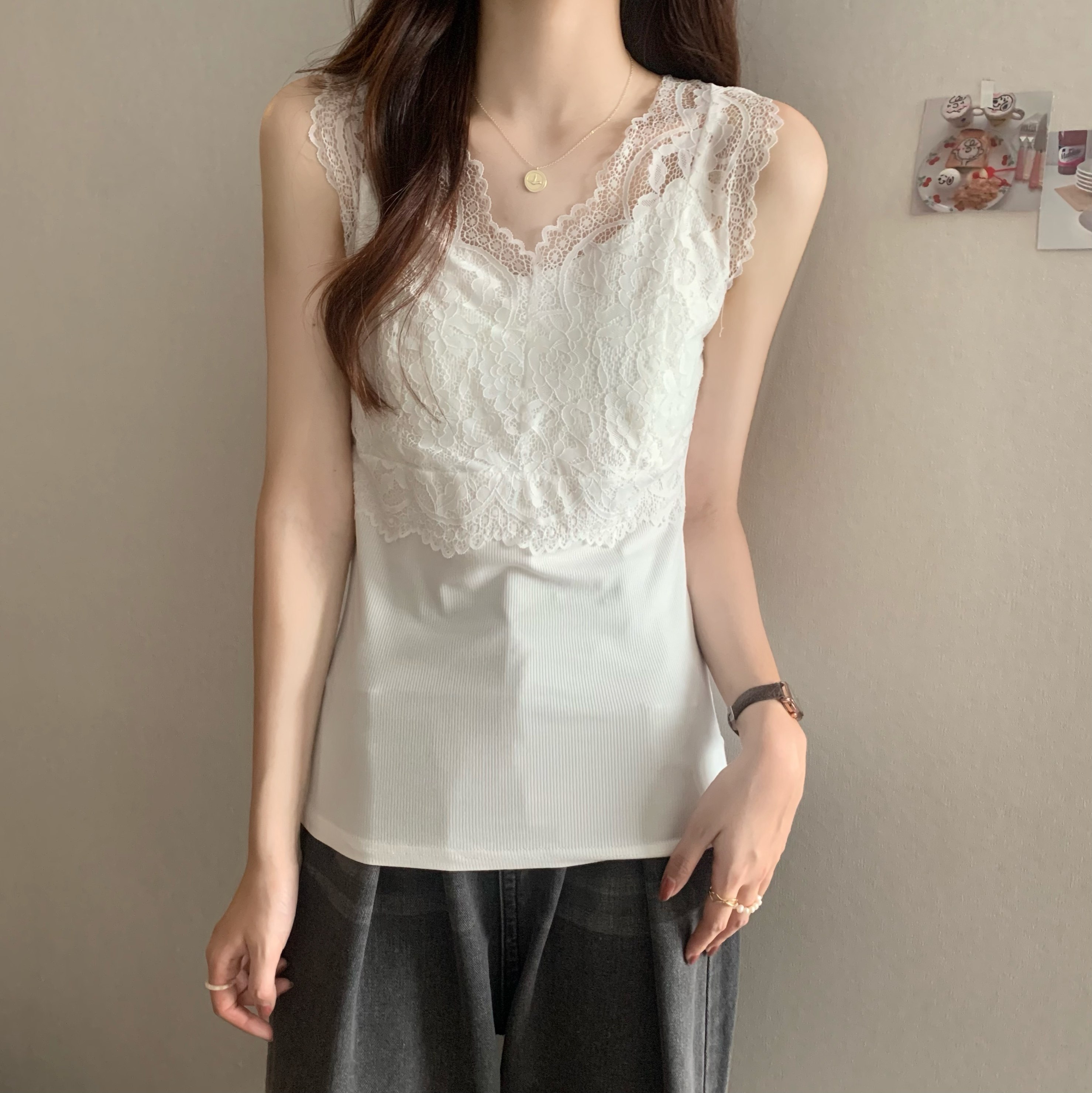 RM13951#大码夏季蕾丝拼接内搭吊带显瘦遮肚罗文纯色背心女