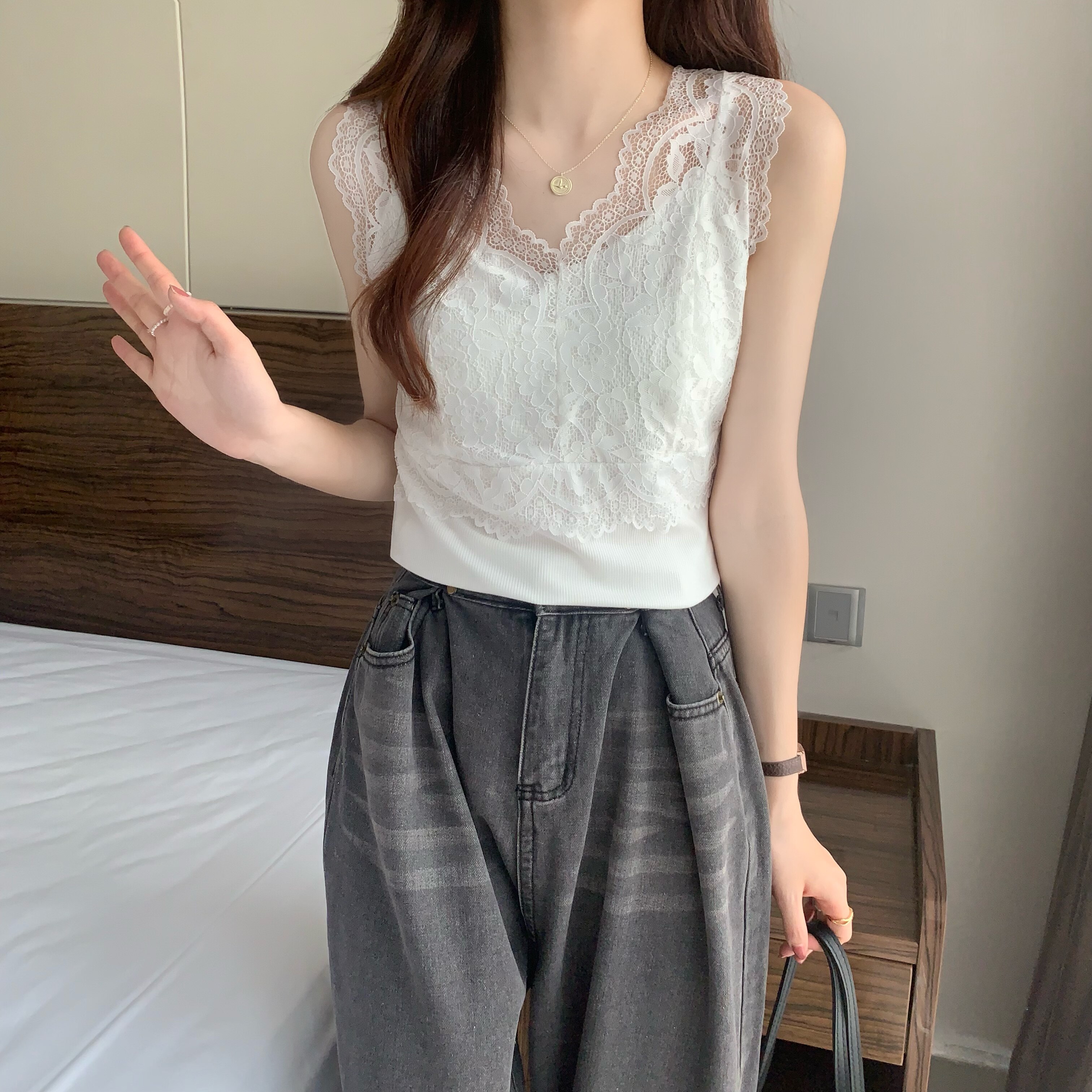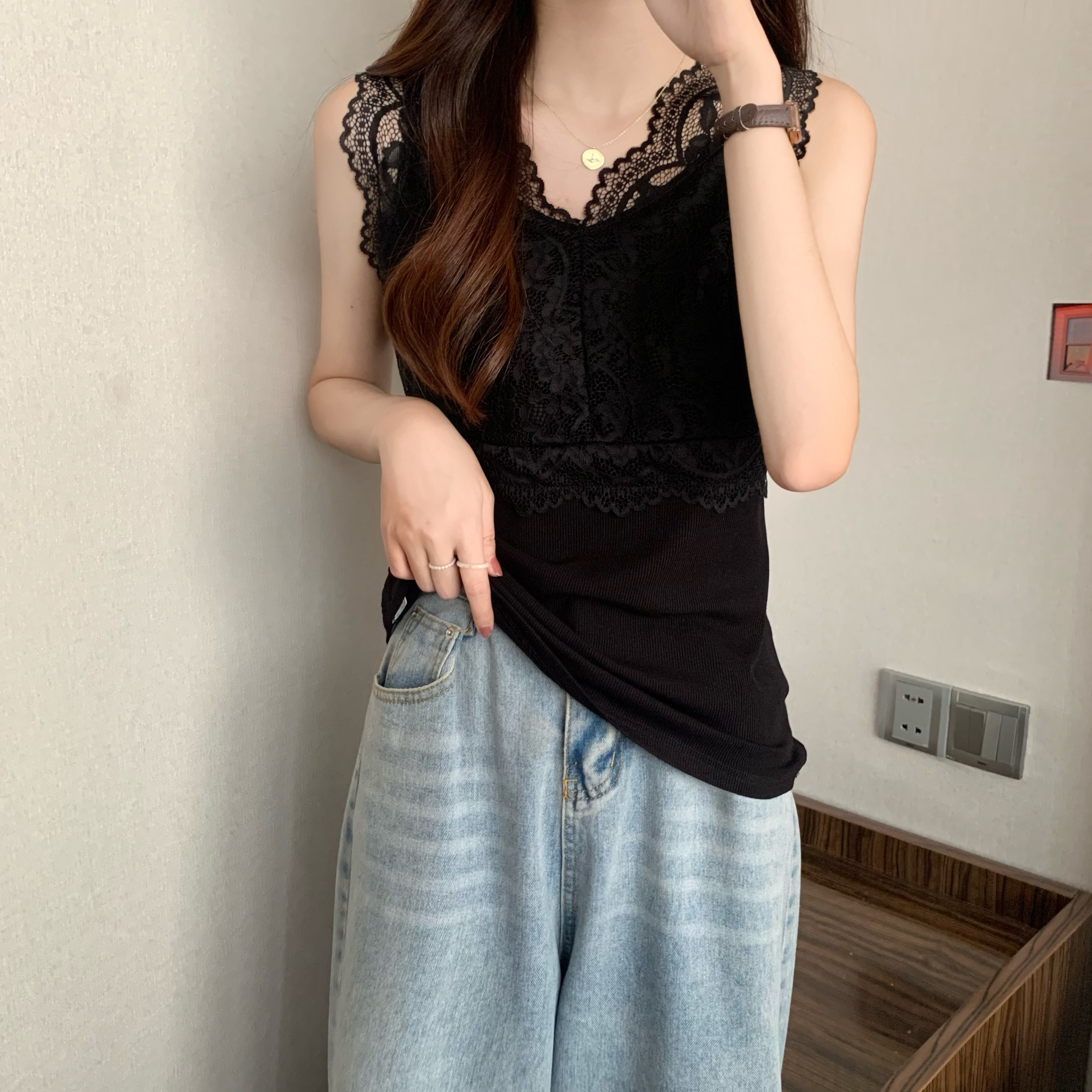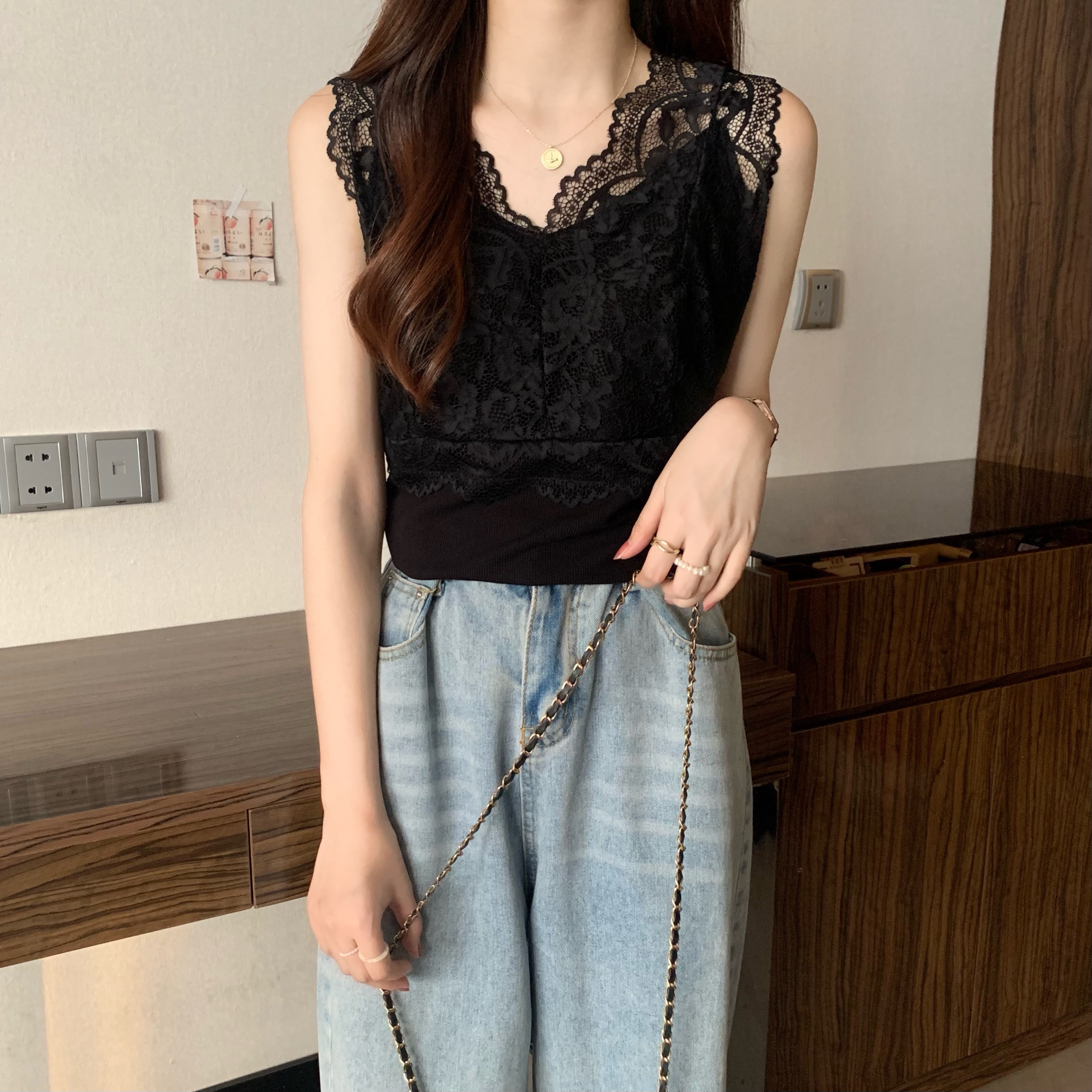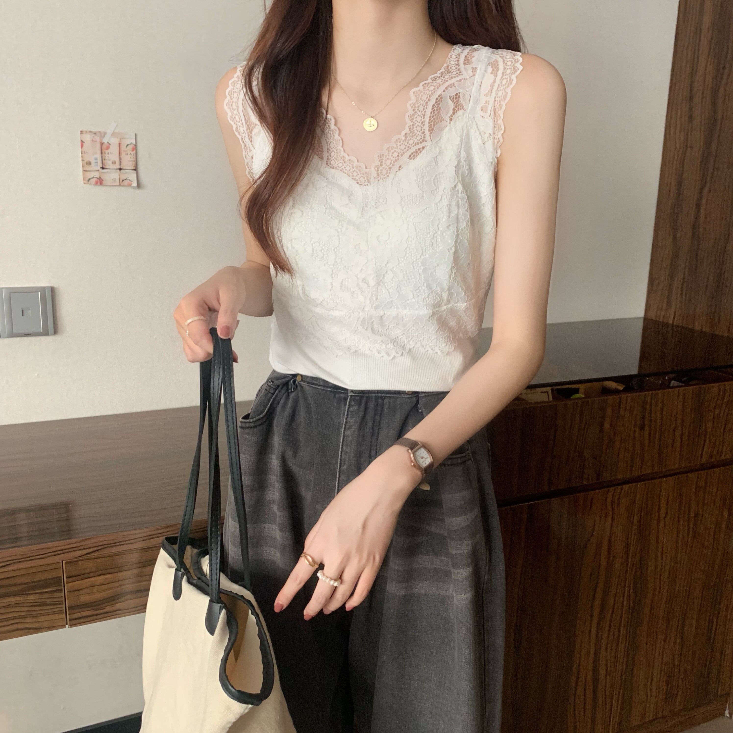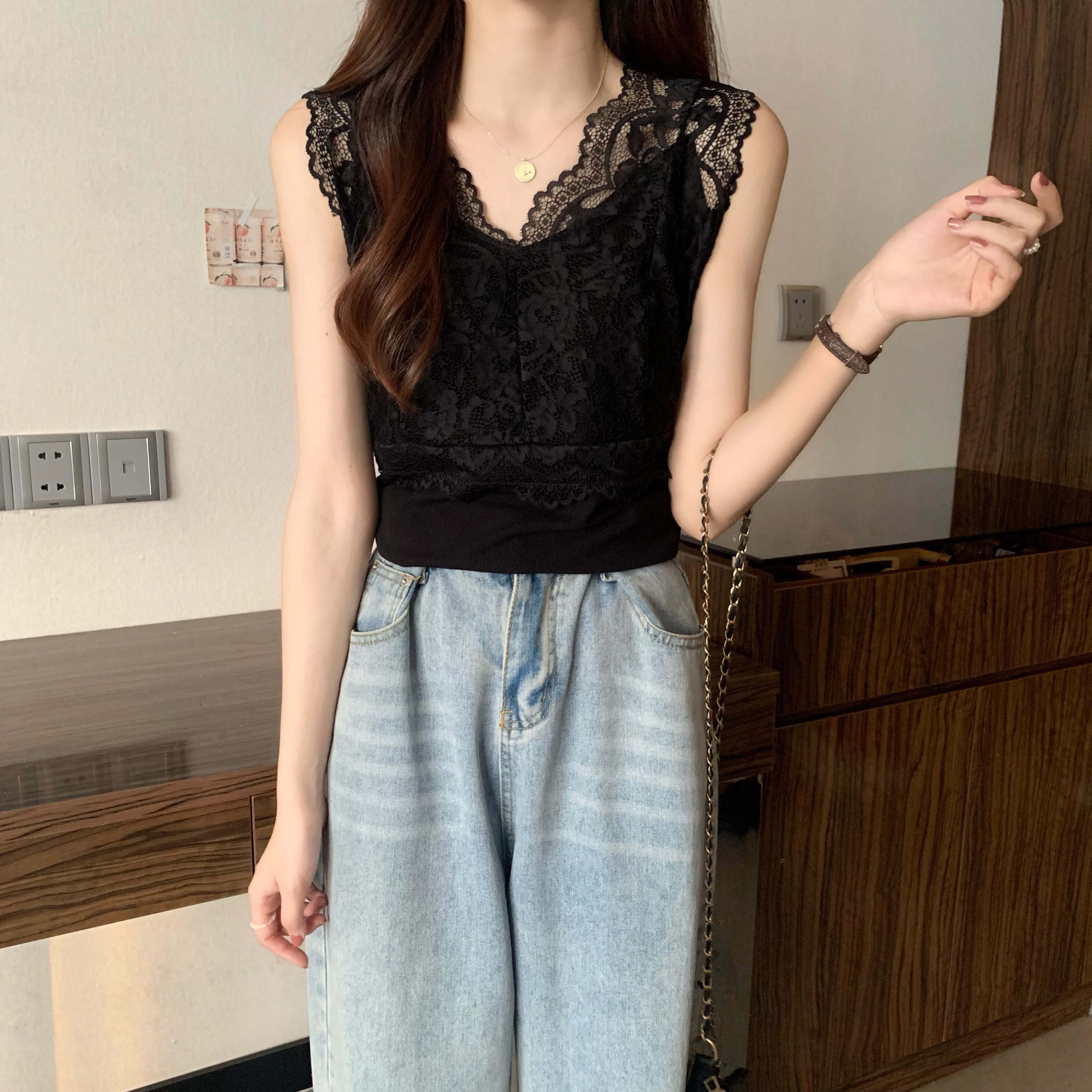 RM13951#大码夏季蕾丝拼接内搭吊带显瘦遮肚罗文纯色背心女
