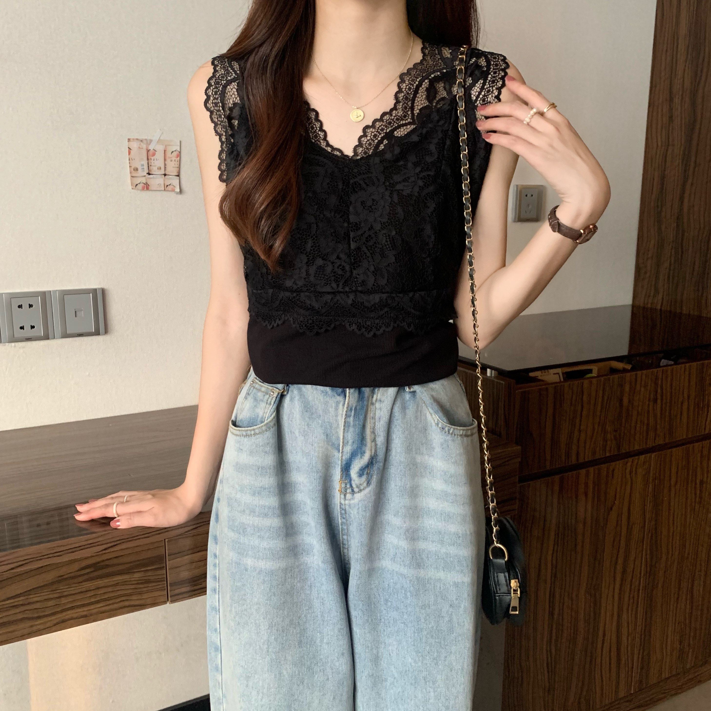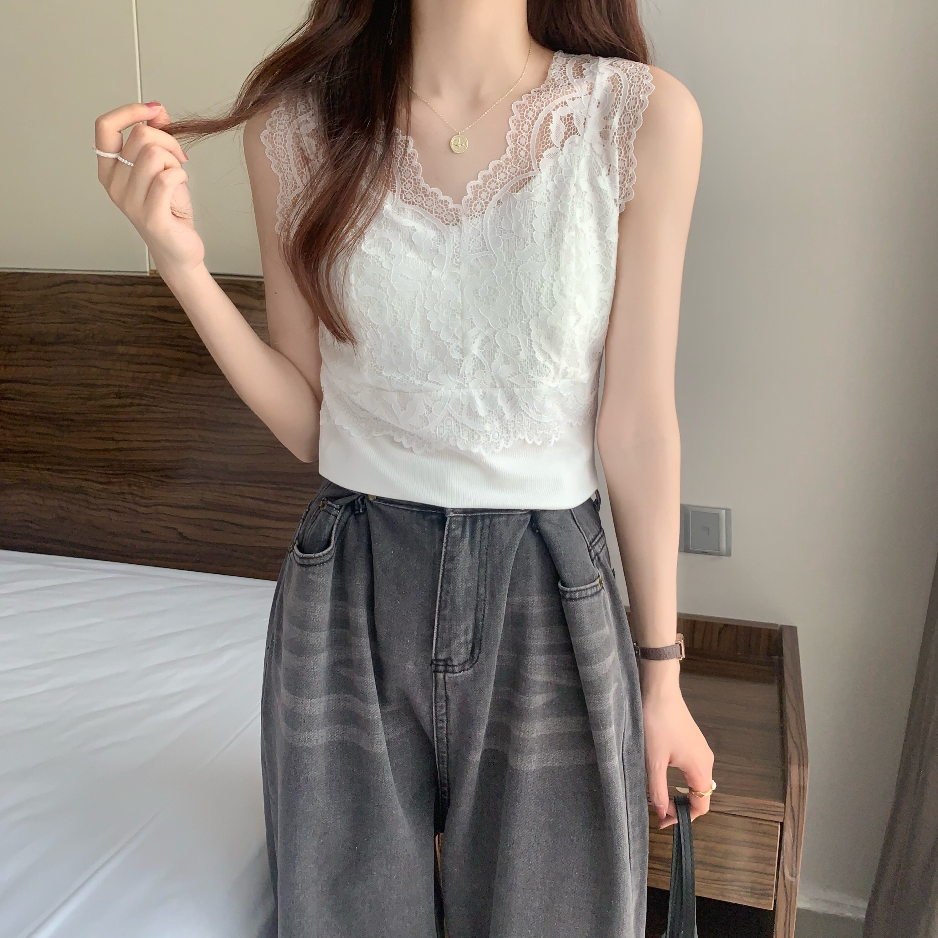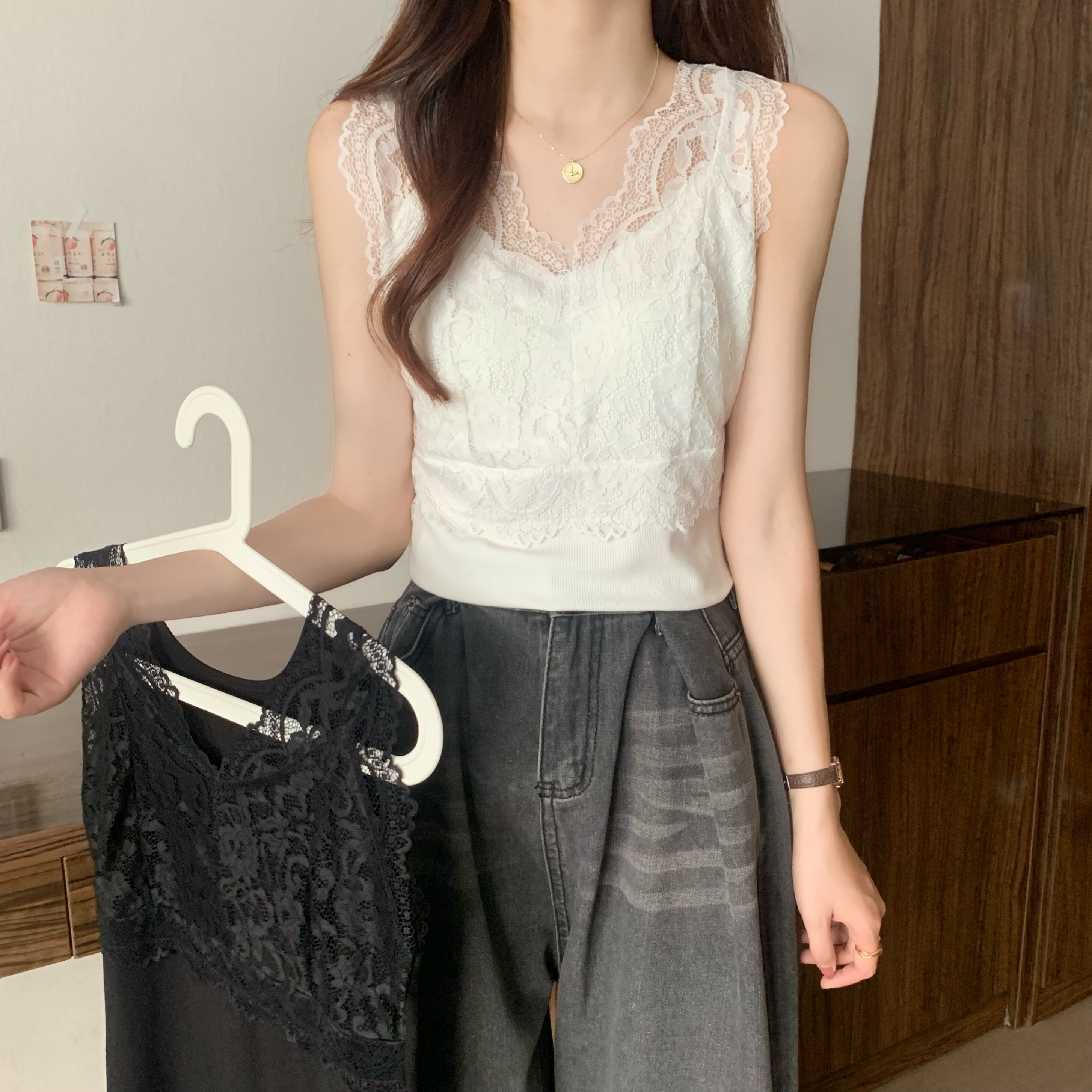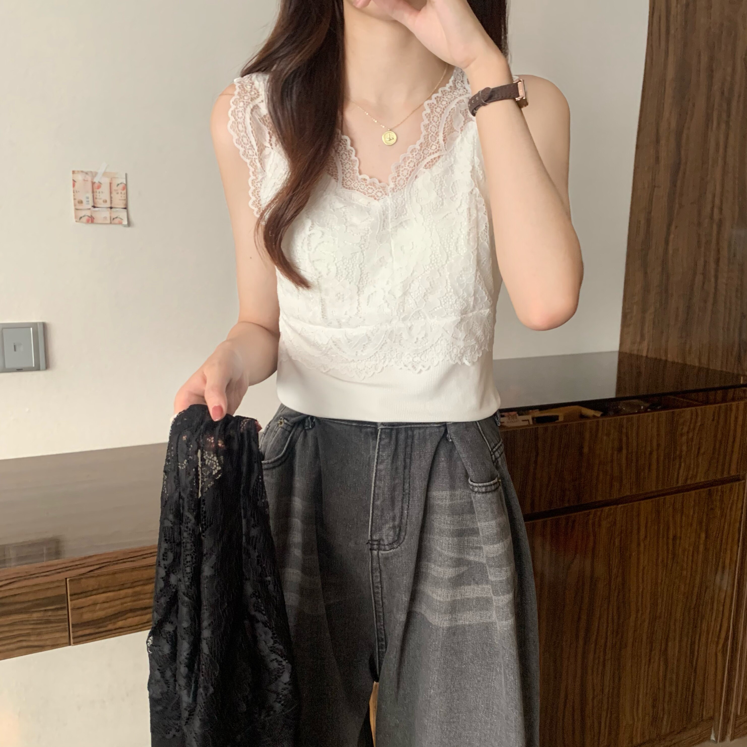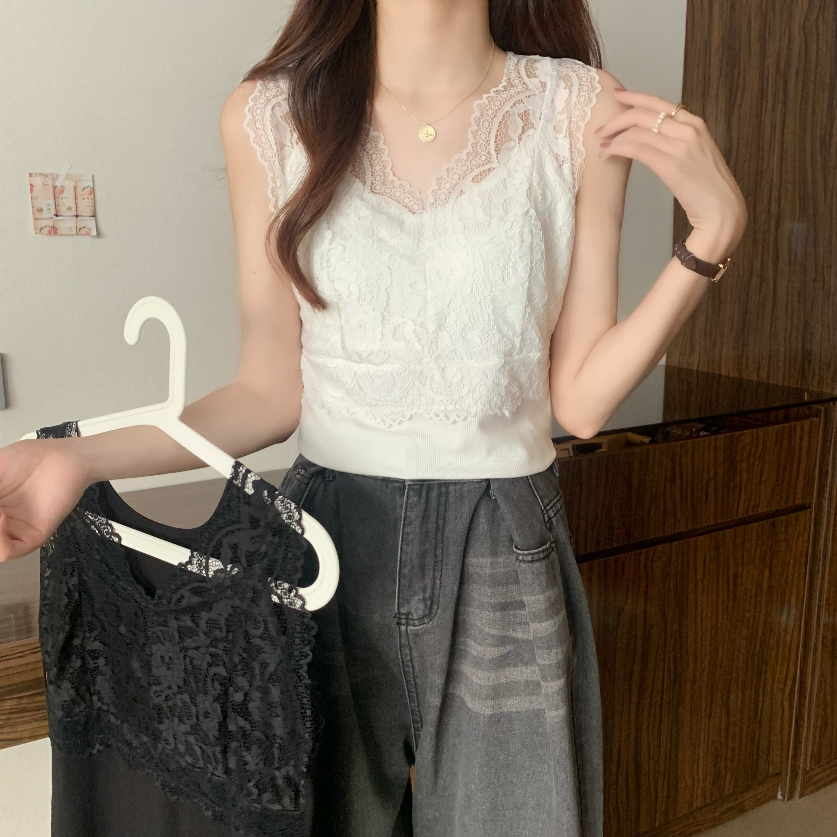 RM13951#大码夏季蕾丝拼接内搭吊带显瘦遮肚罗文纯色背心女