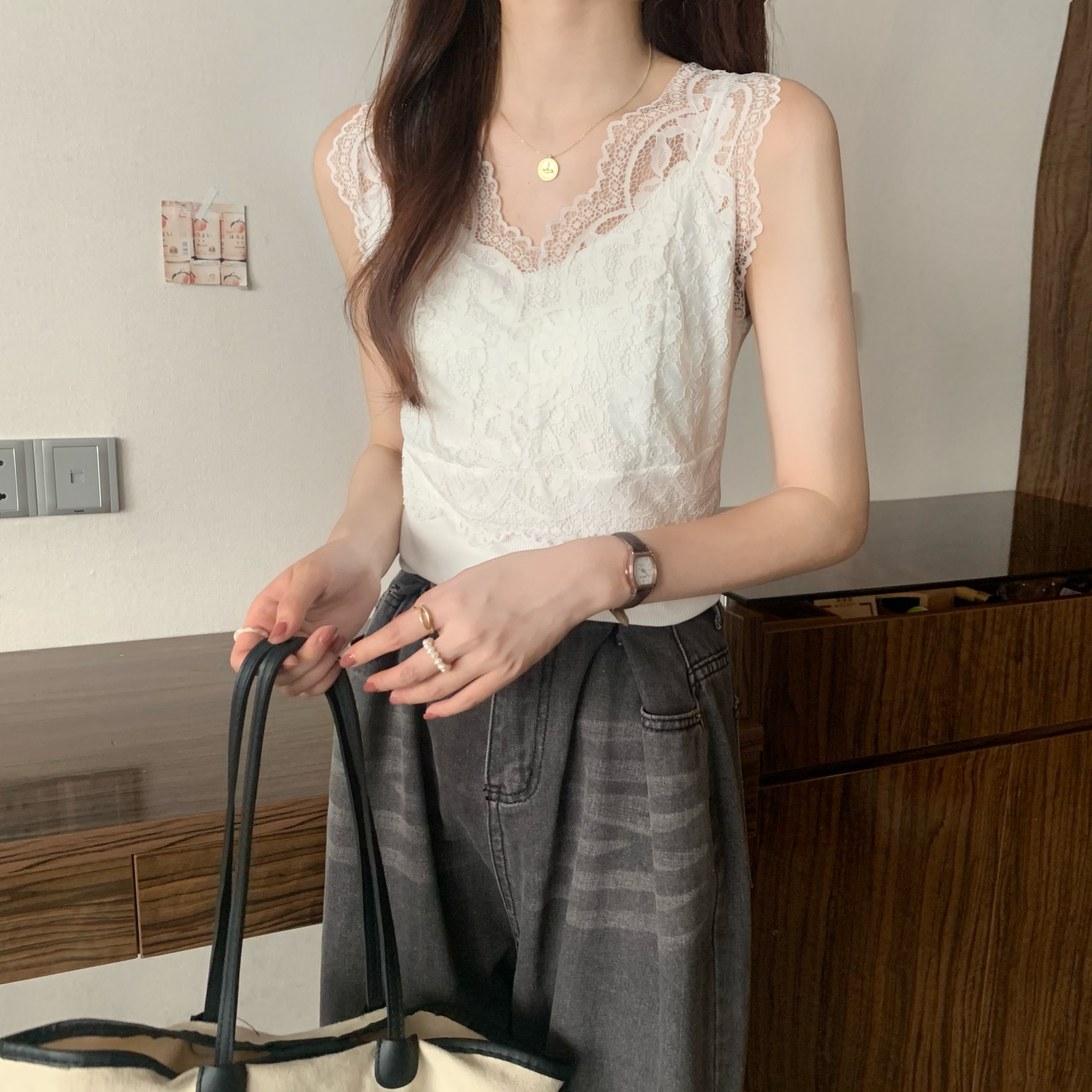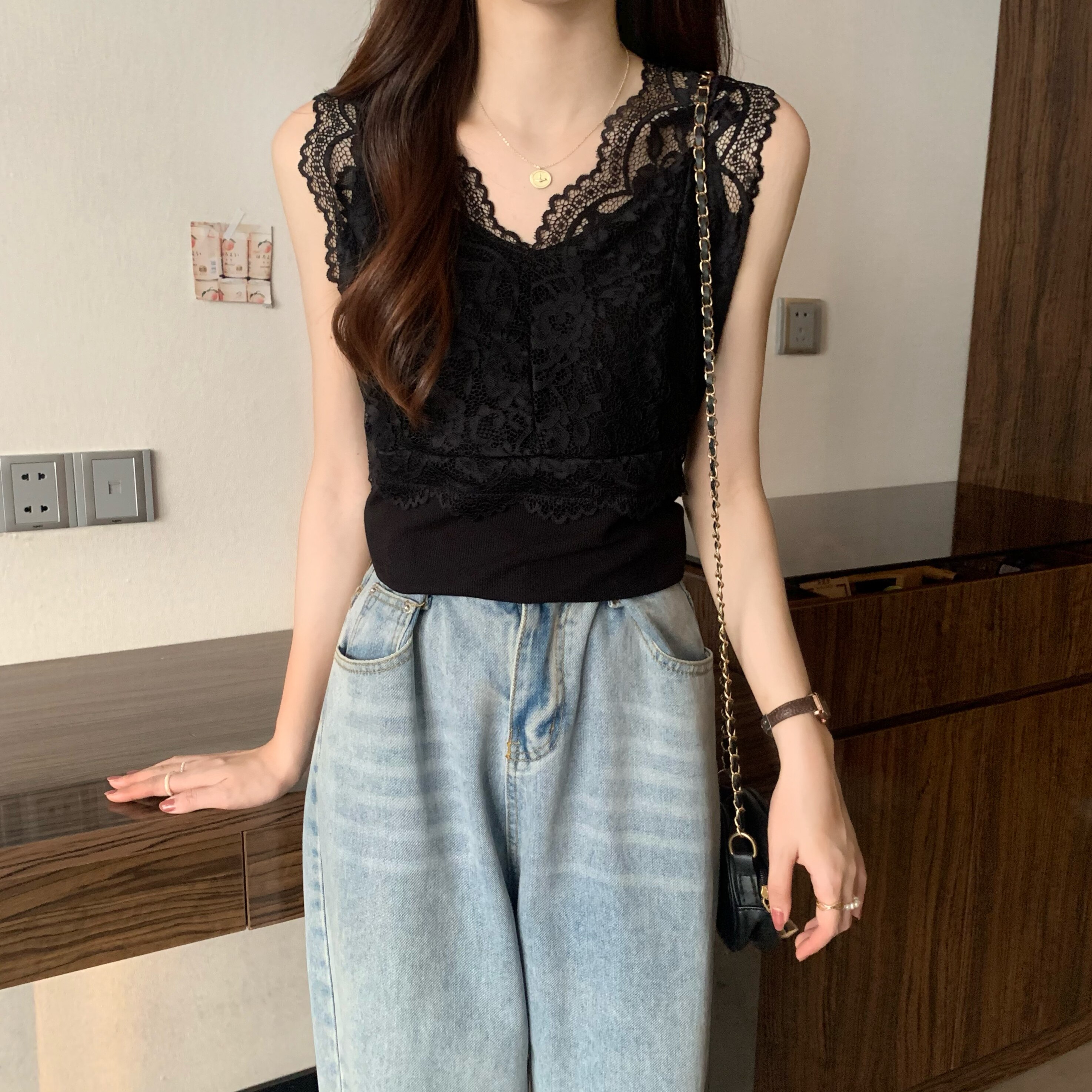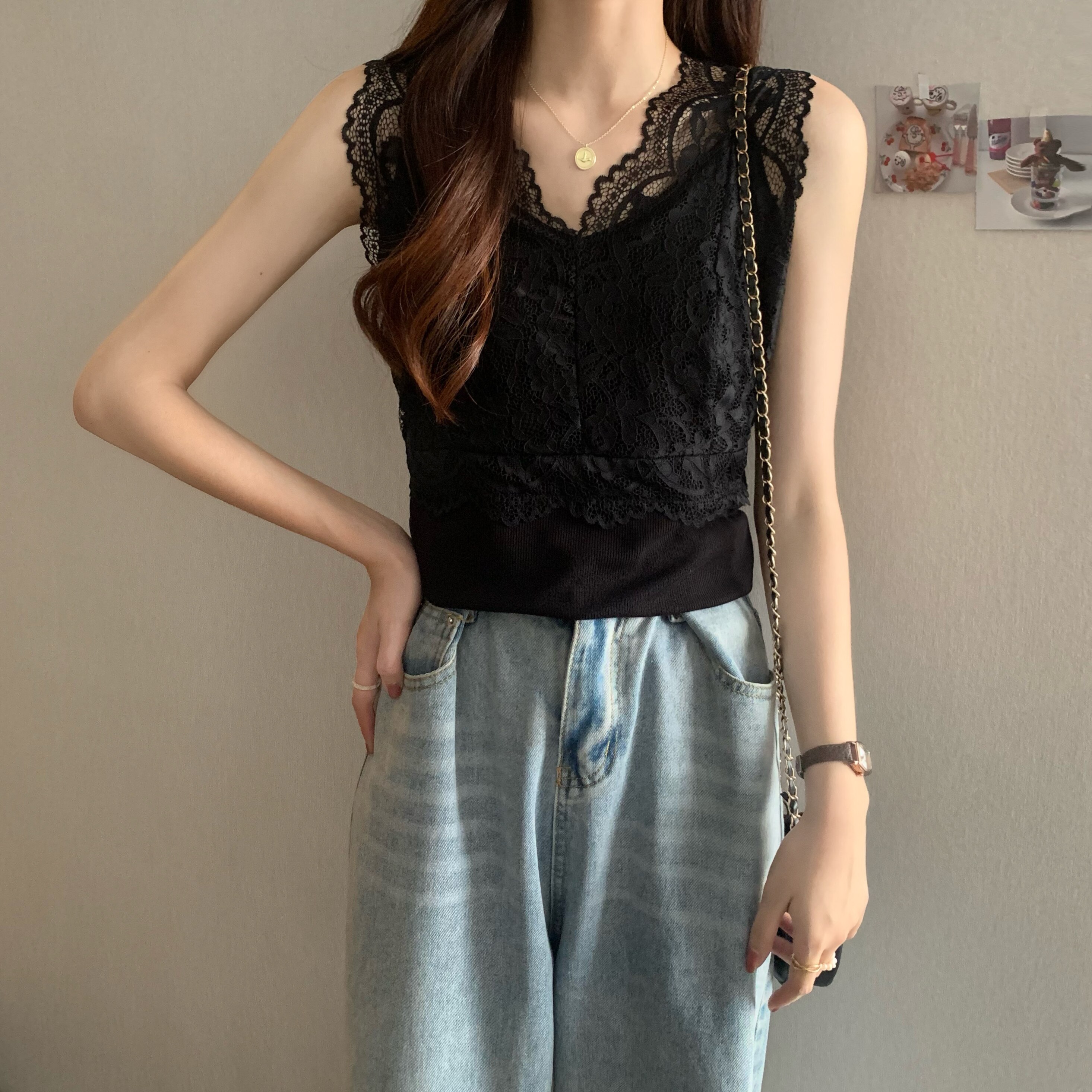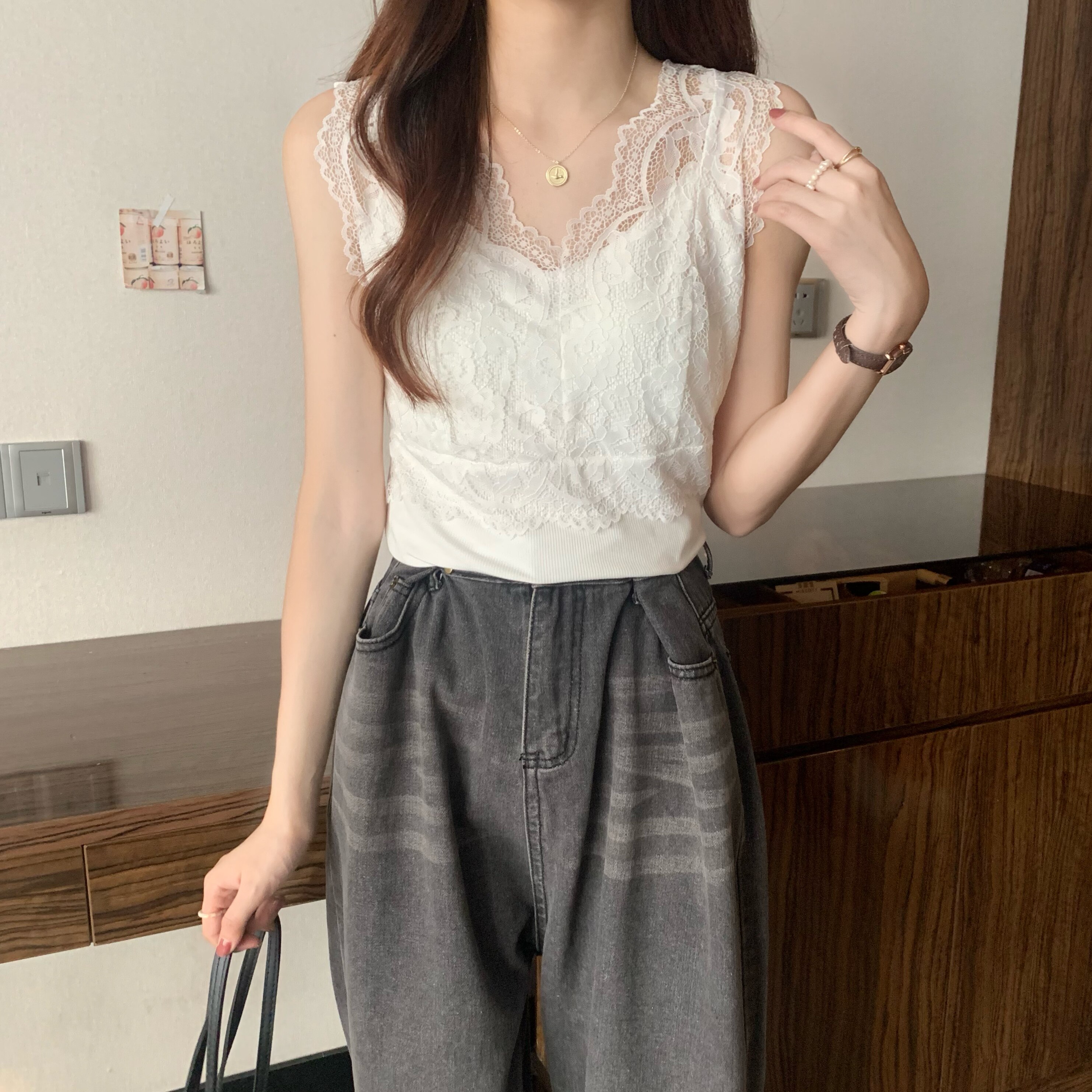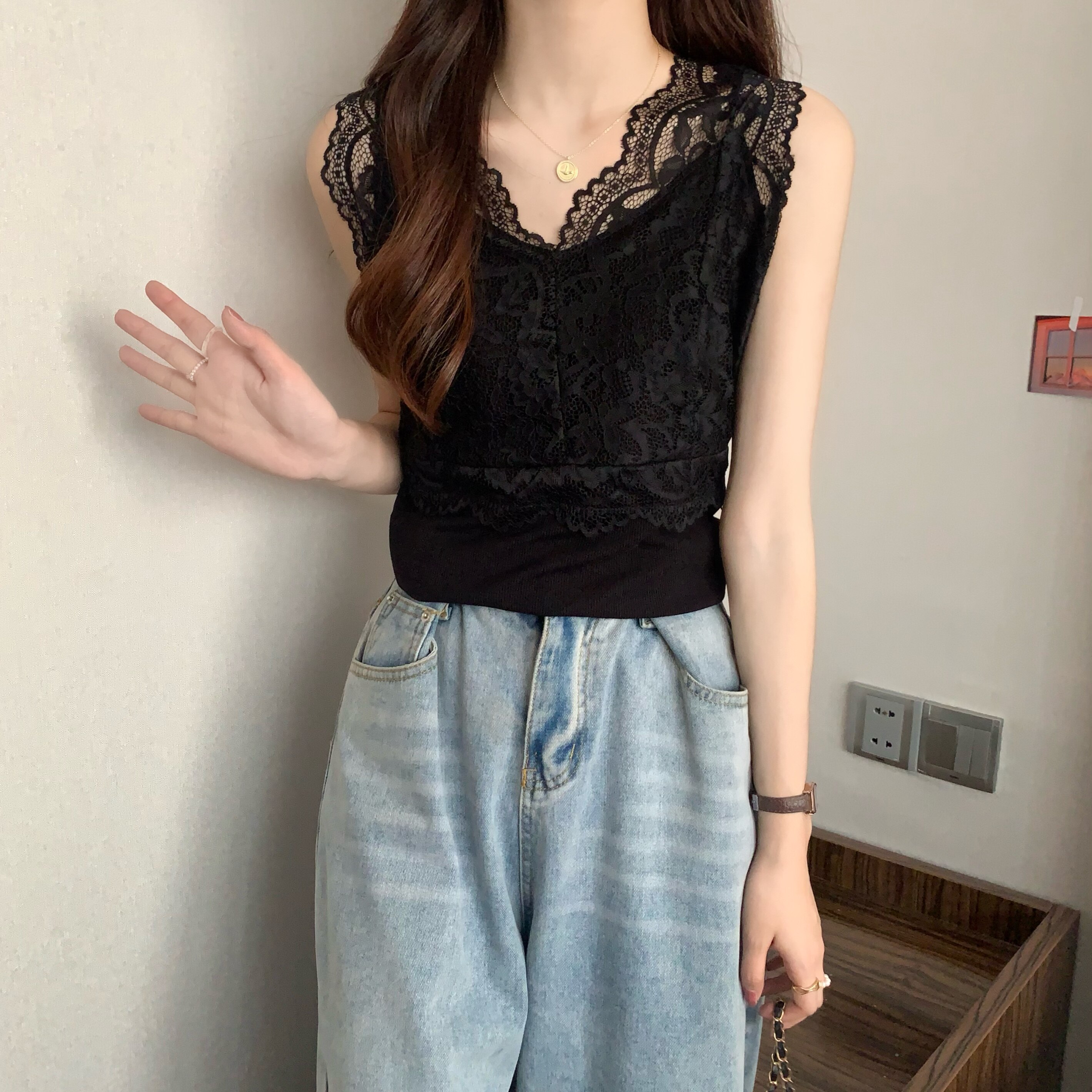RM13951#大码夏季蕾丝拼接内搭吊带显瘦遮肚罗文纯色背心女