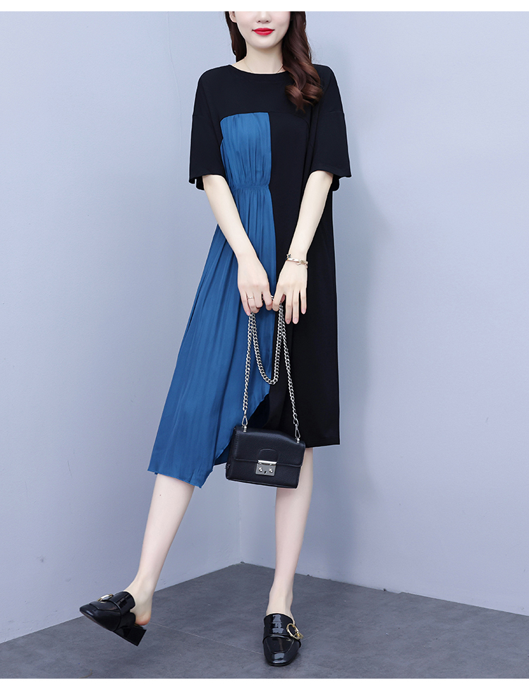 RM14059#大码女装2023夏季新款胖mm拼接撞色短袖修身显瘦中长款连衣裙