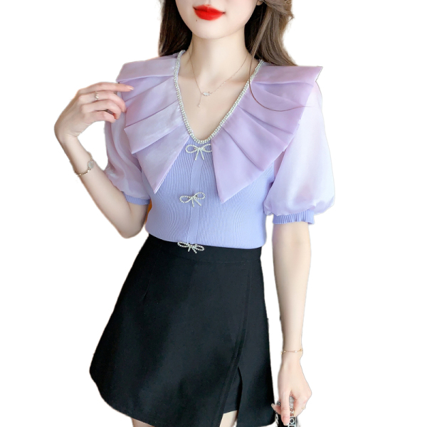RM14261#夏季韩版蝴蝶结甜美洋气泡泡袖T恤网纱针织上衣女