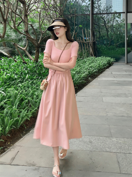 RM14385#越简越贵 连衣裙女夏轻芭蕾风气质法式方领珠光缎面A字长裙
