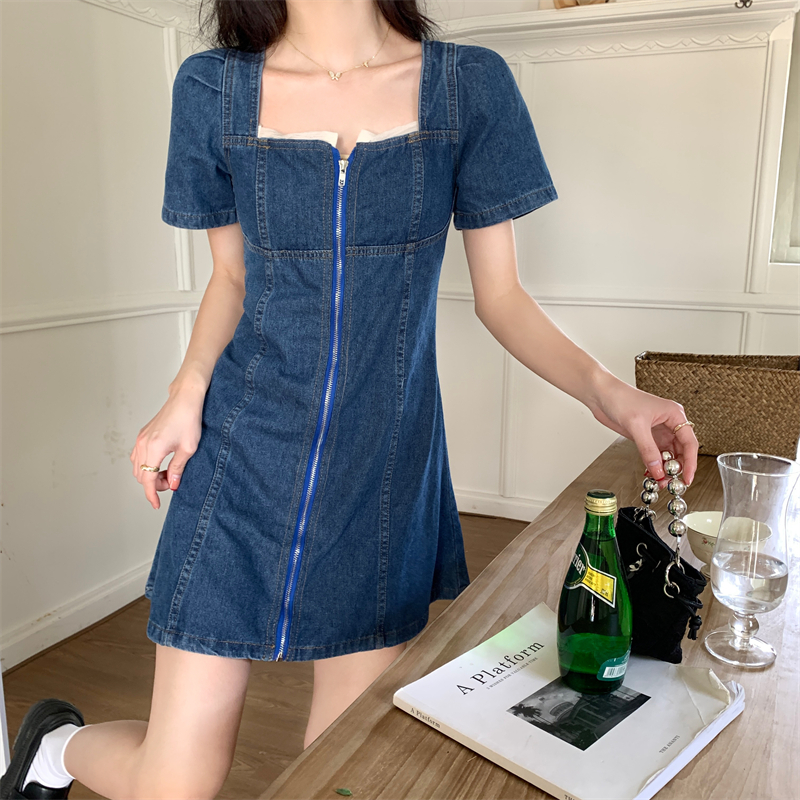 RM14683#夏季大码女装新款方领拉链牛仔短袖A字显瘦连衣裙S-5XL200斤