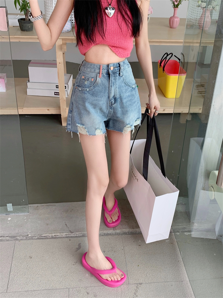 RM14752#大码女装刺绣口袋设计感牛仔短裤流苏遮肉磨破辣妹阔腿热裤