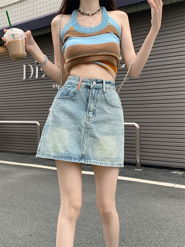 RM14753#大码女装撞色刺绣手工口袋牛仔半身裙韩版防走光a字包臀短裙