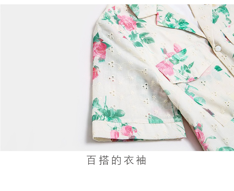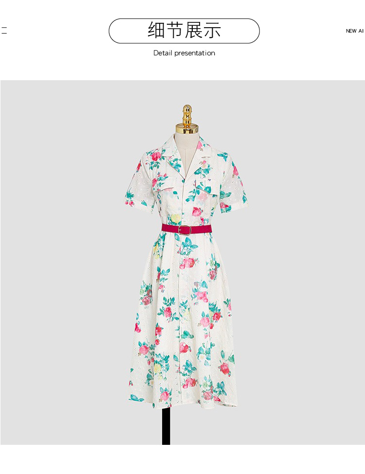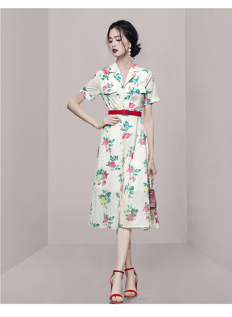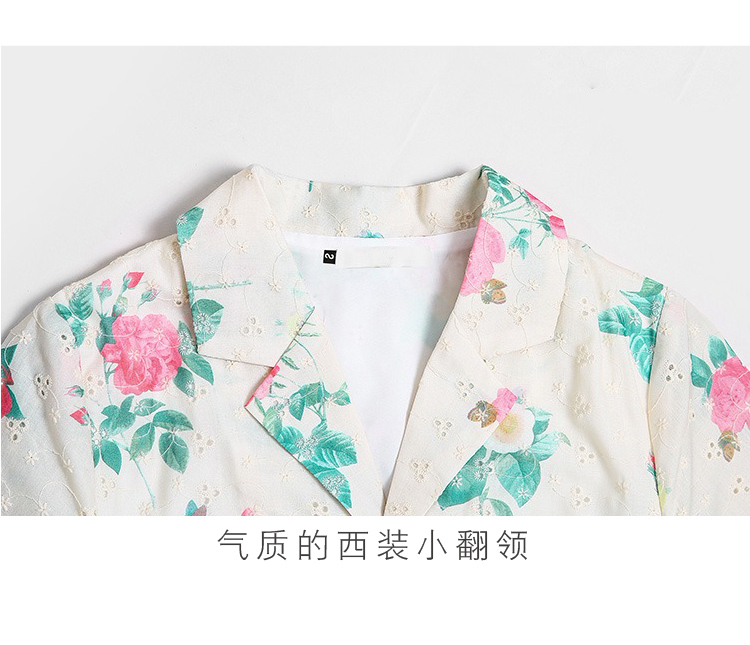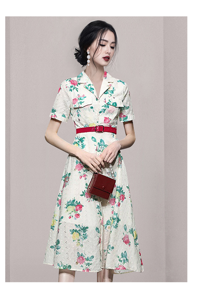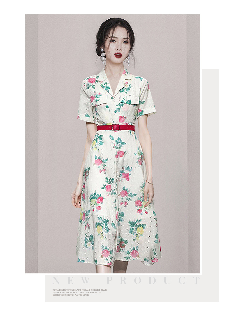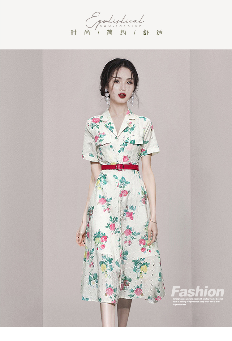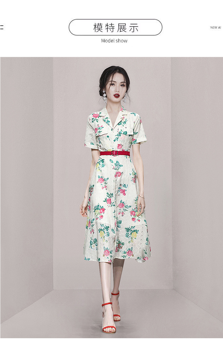 RM15087#夏季新款淑女小西装翻领短袖收腰复古印花气质茶歇连衣裙