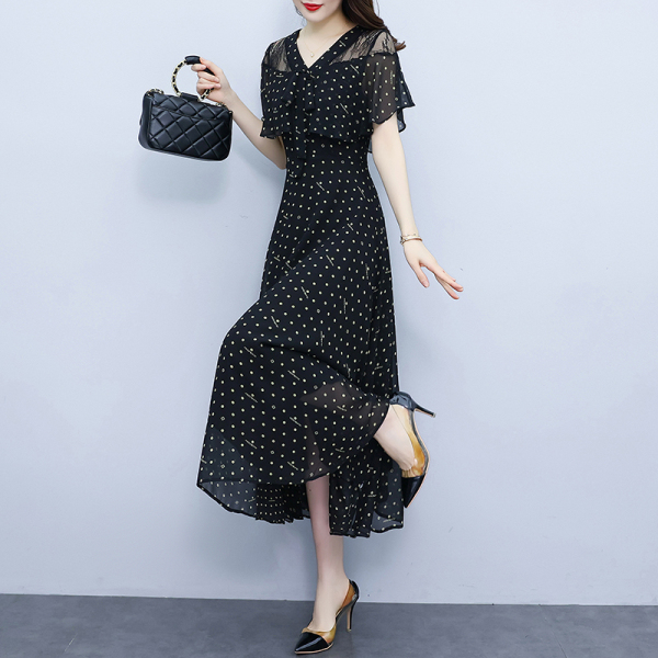 RM15106#夏季新款中袖拼接高腰长裙V领撞色印花大摆雪纺气质连