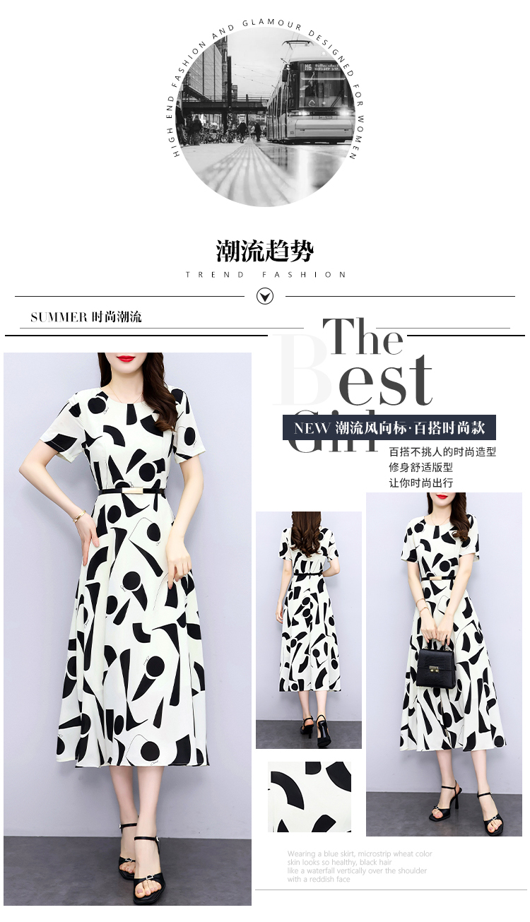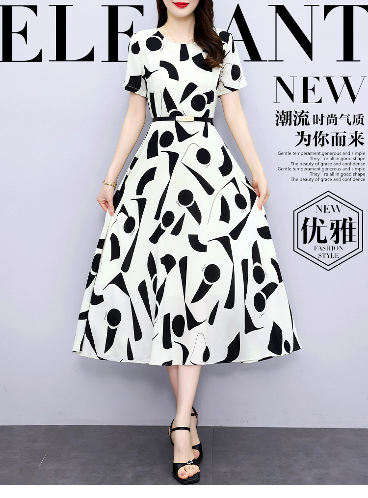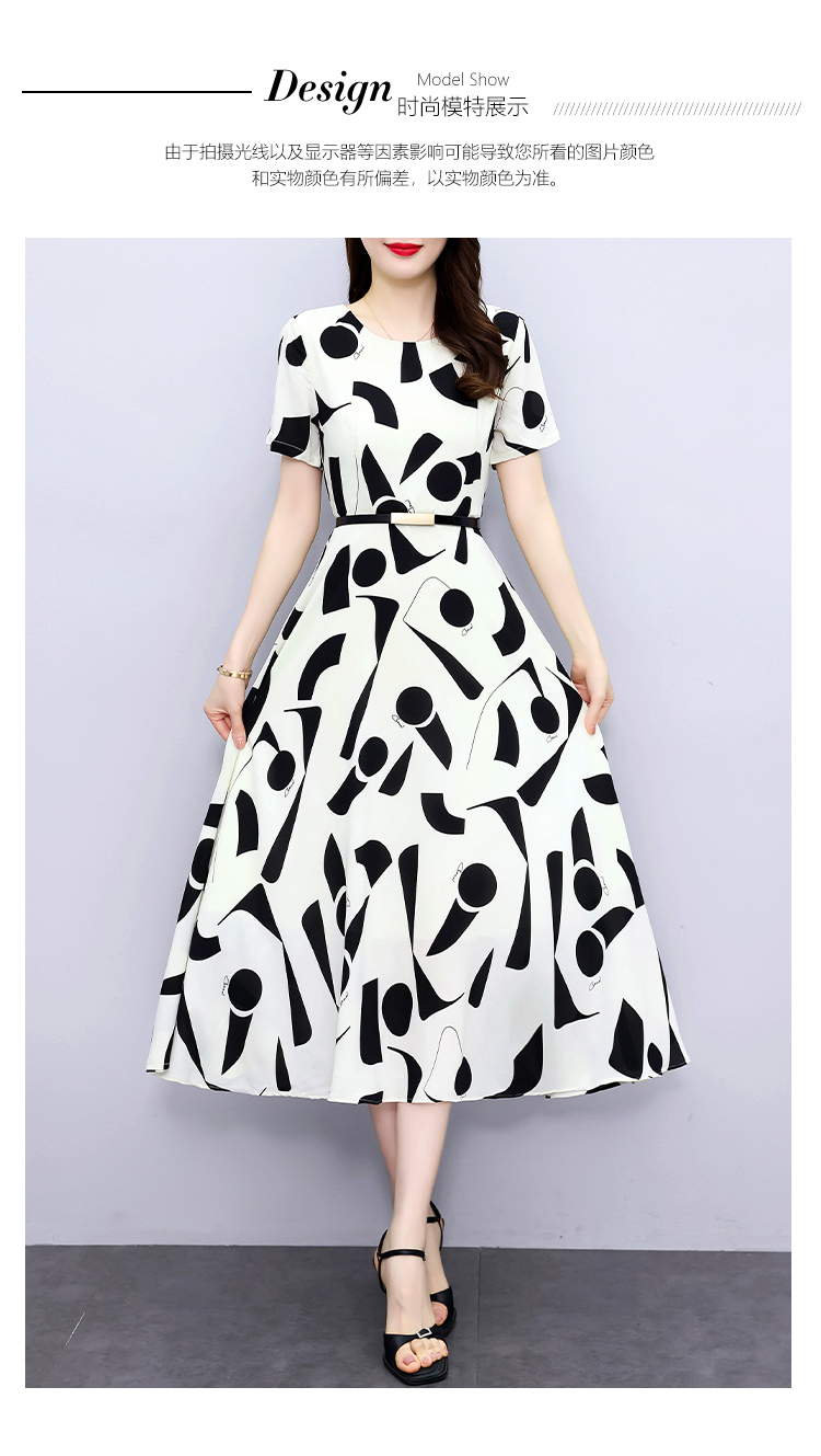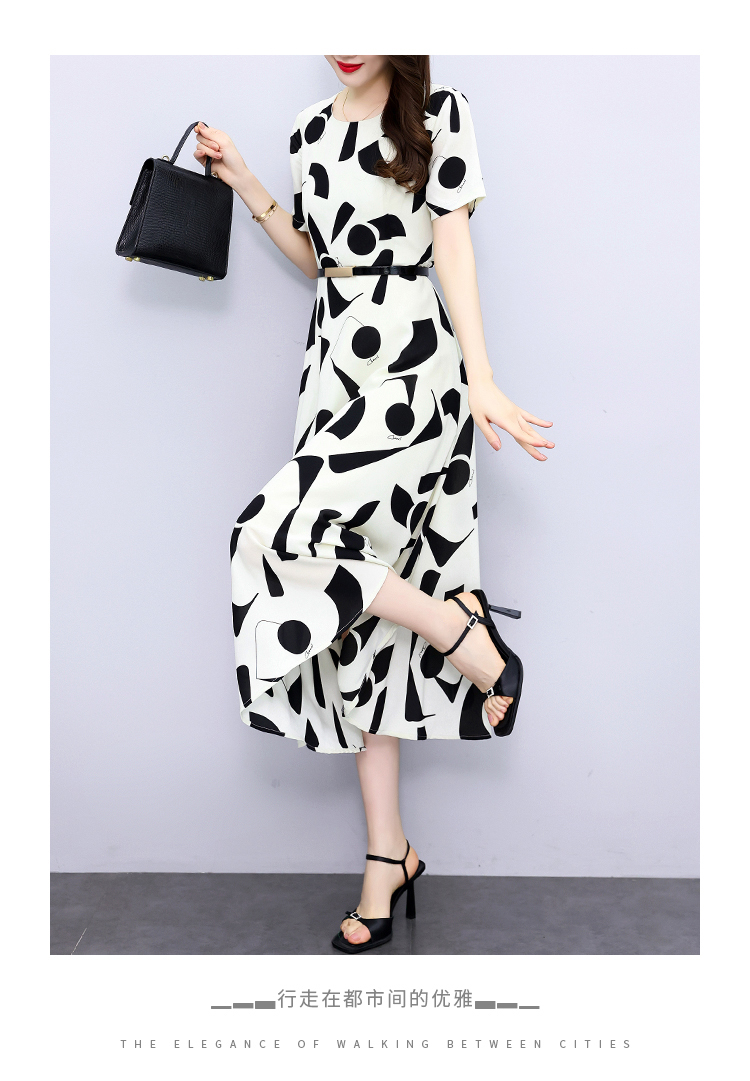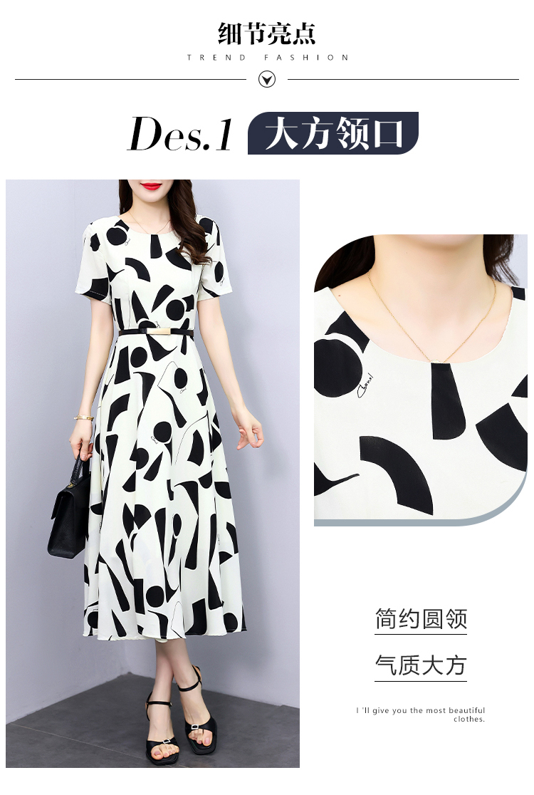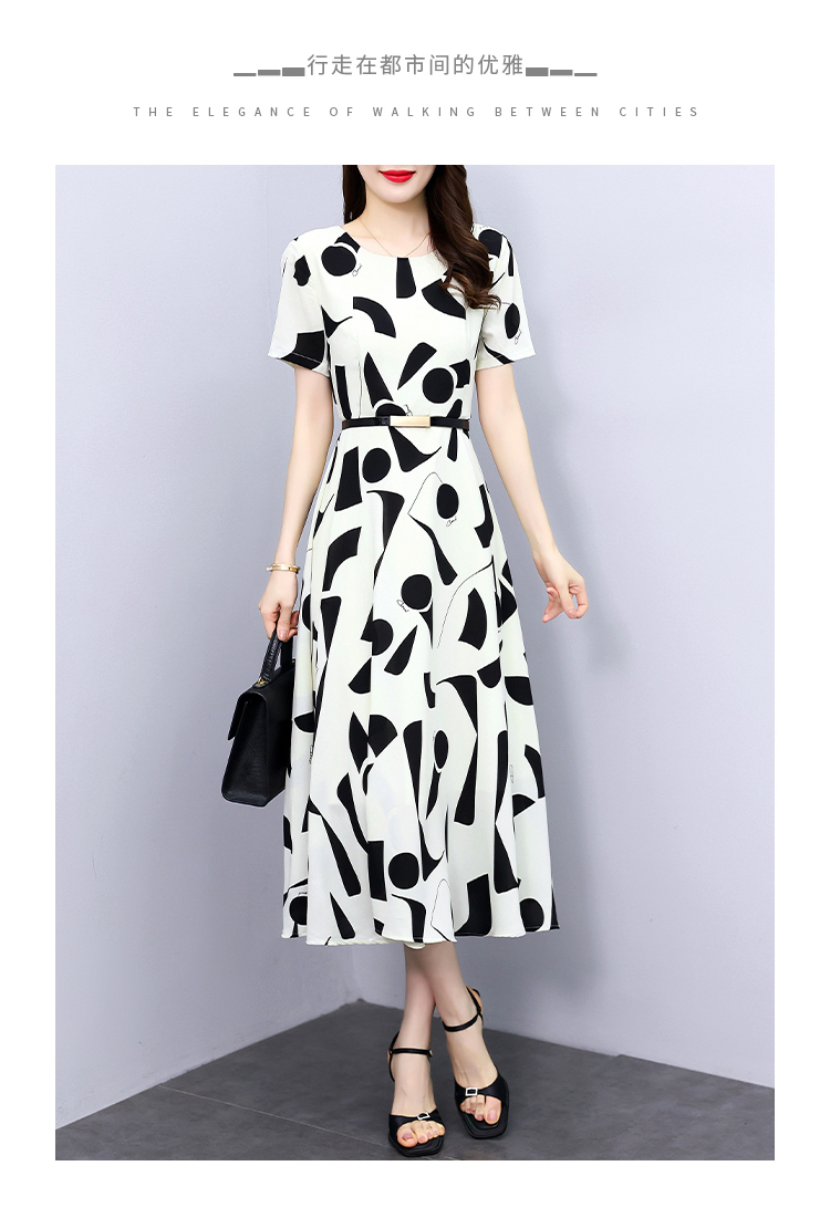 RM15108#气质雪纺印花连衣裙2023夏季新款显瘦收腰圆领减龄时尚长裙
