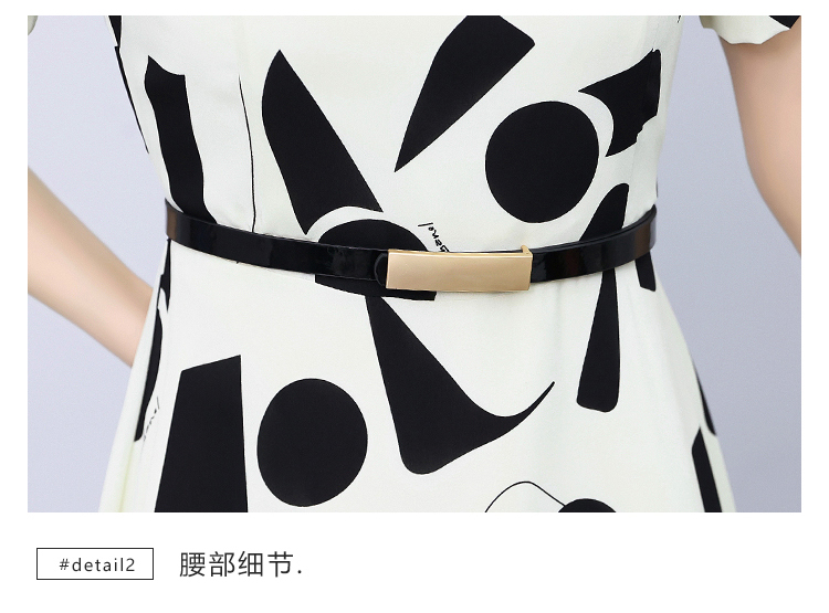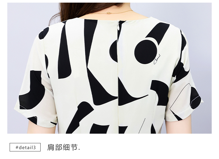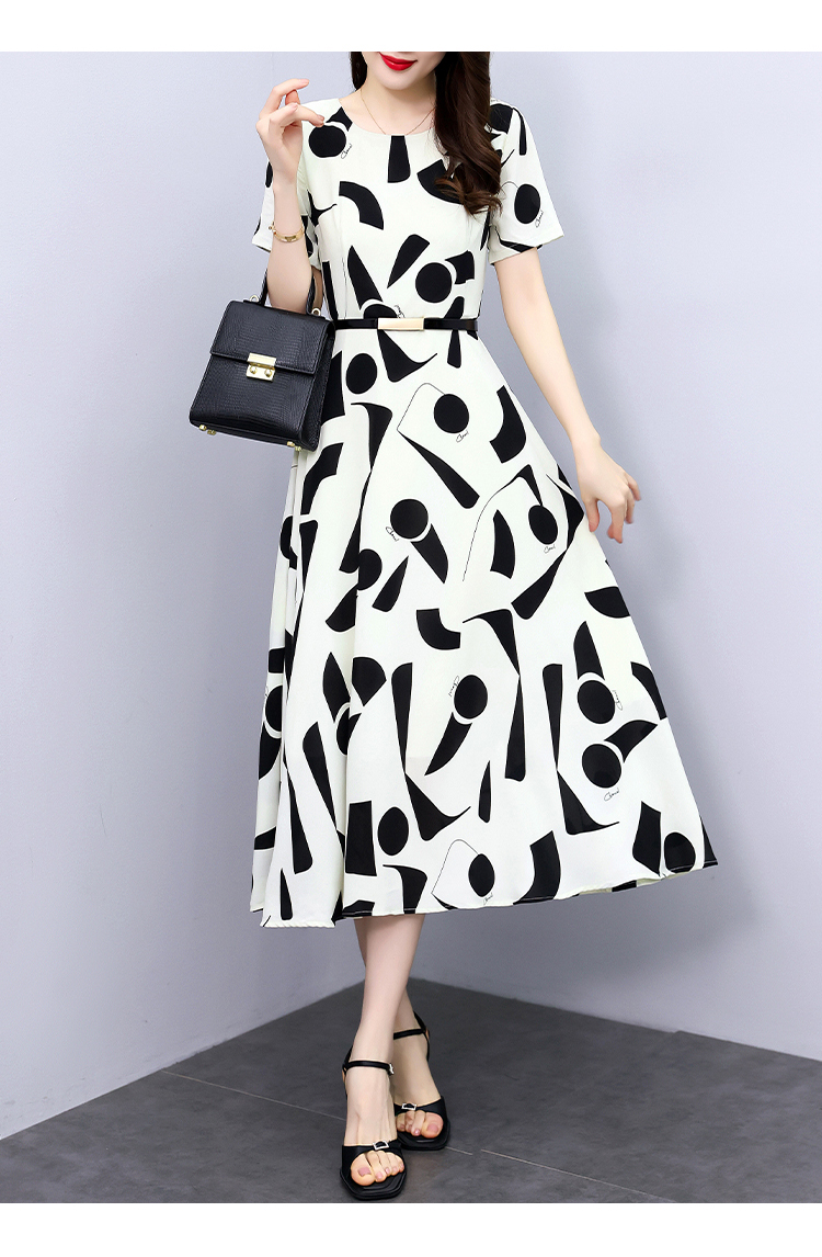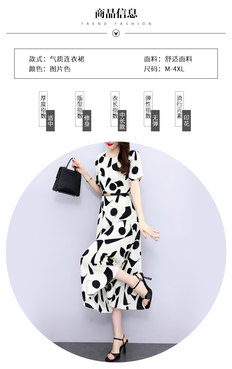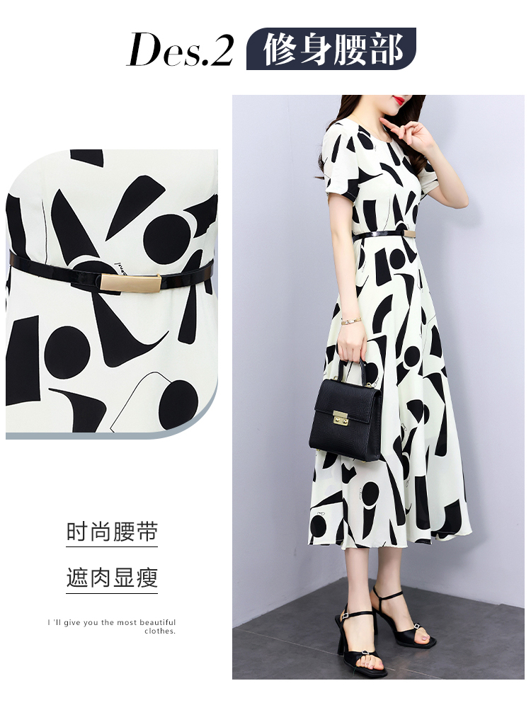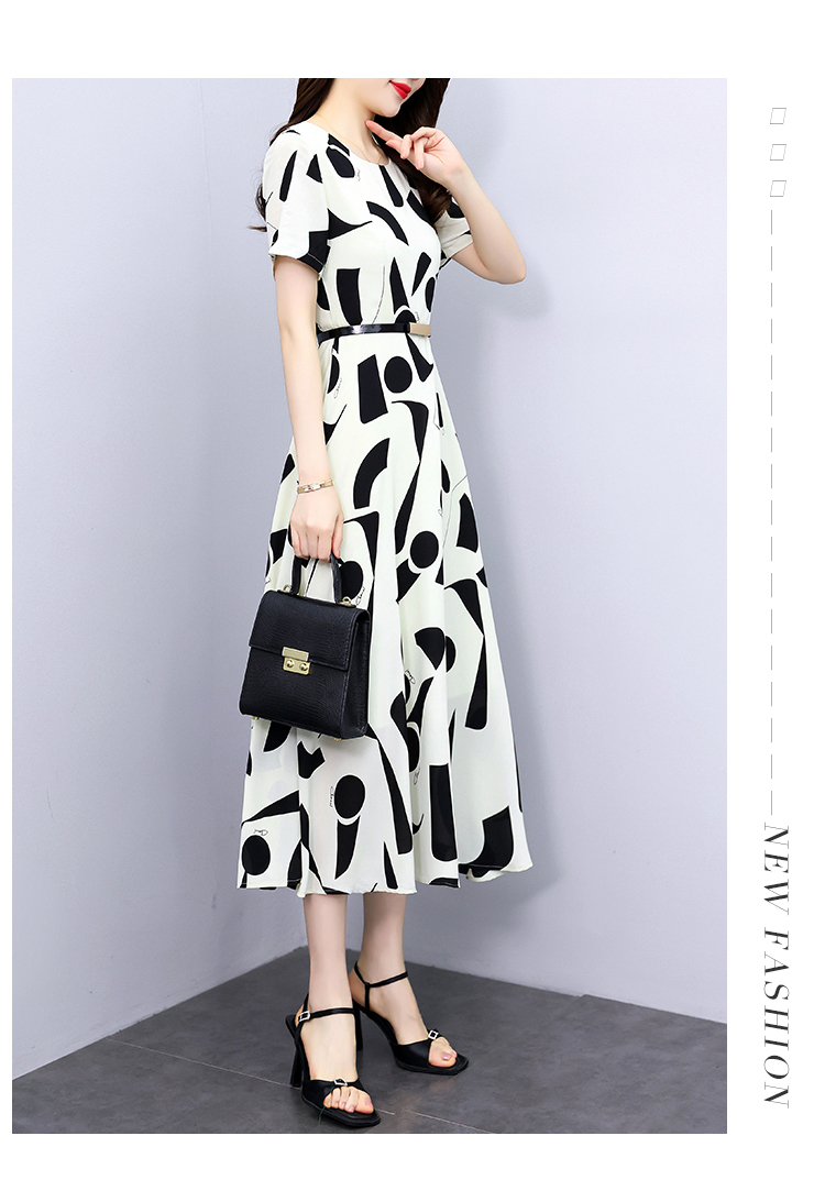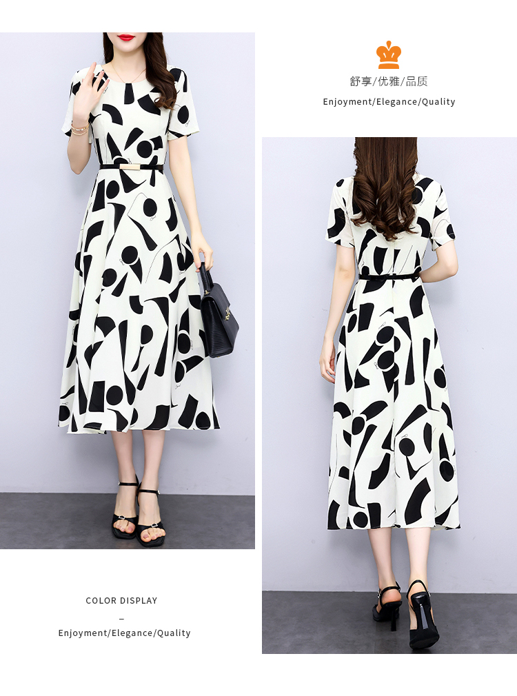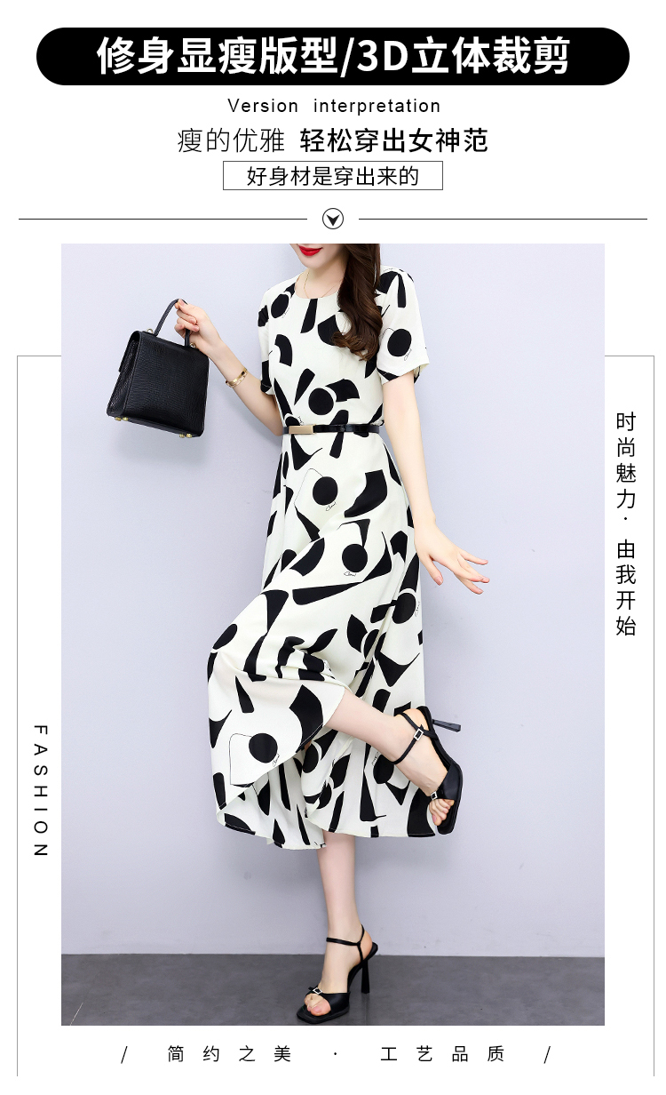 RM15108#气质雪纺印花连衣裙2023夏季新款显瘦收腰圆领减龄时尚长裙