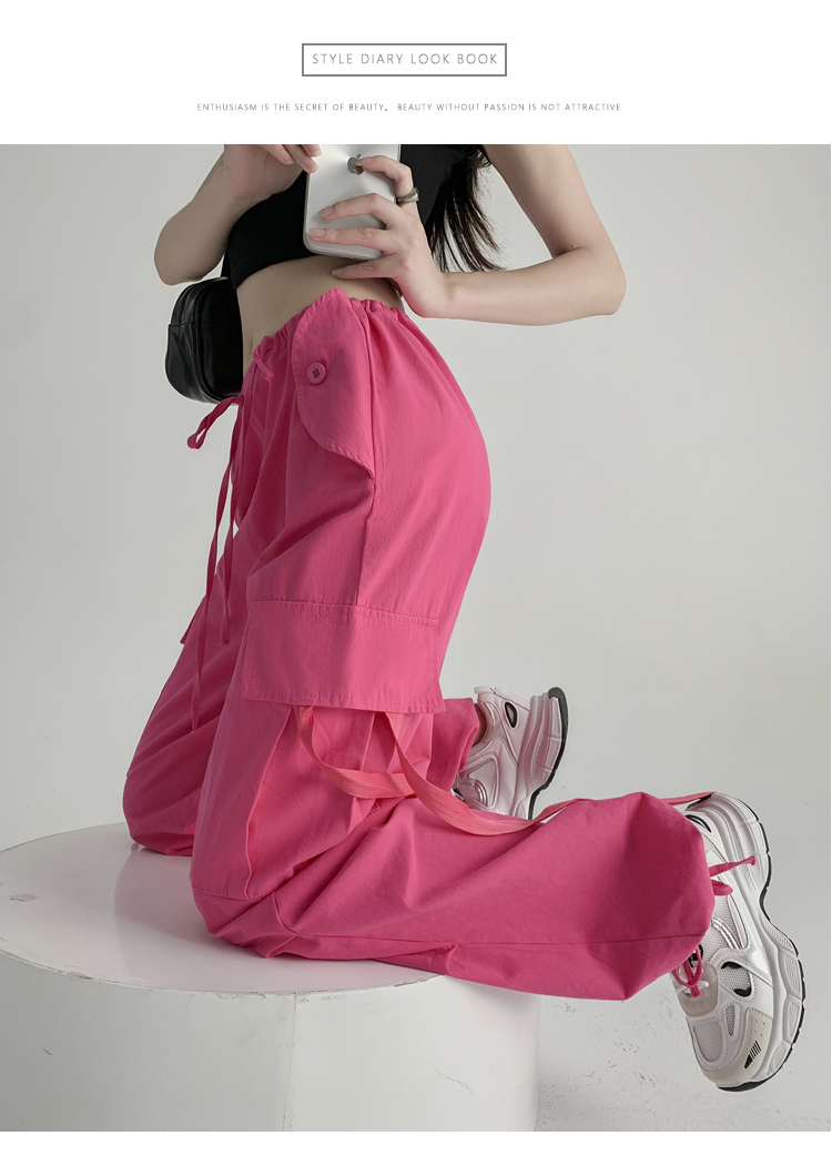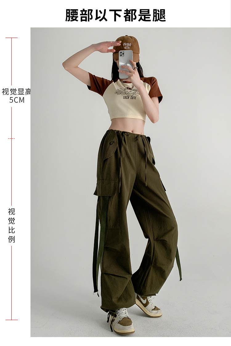 RM15624#美式复古工装裤2023夏薄款高腰抽绳大口袋直筒宽松长裤休闲阔腿裤