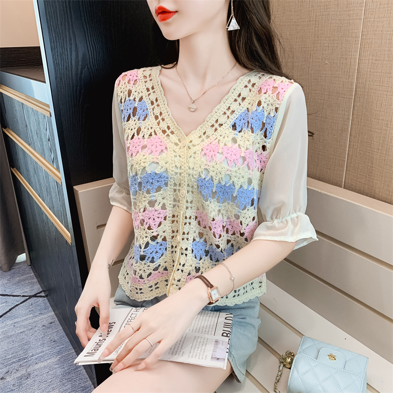 RM15858#夏季新款韩版气质V领镂空针织衫女单排扣宽松泡泡袖开衫上衣