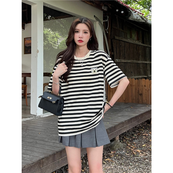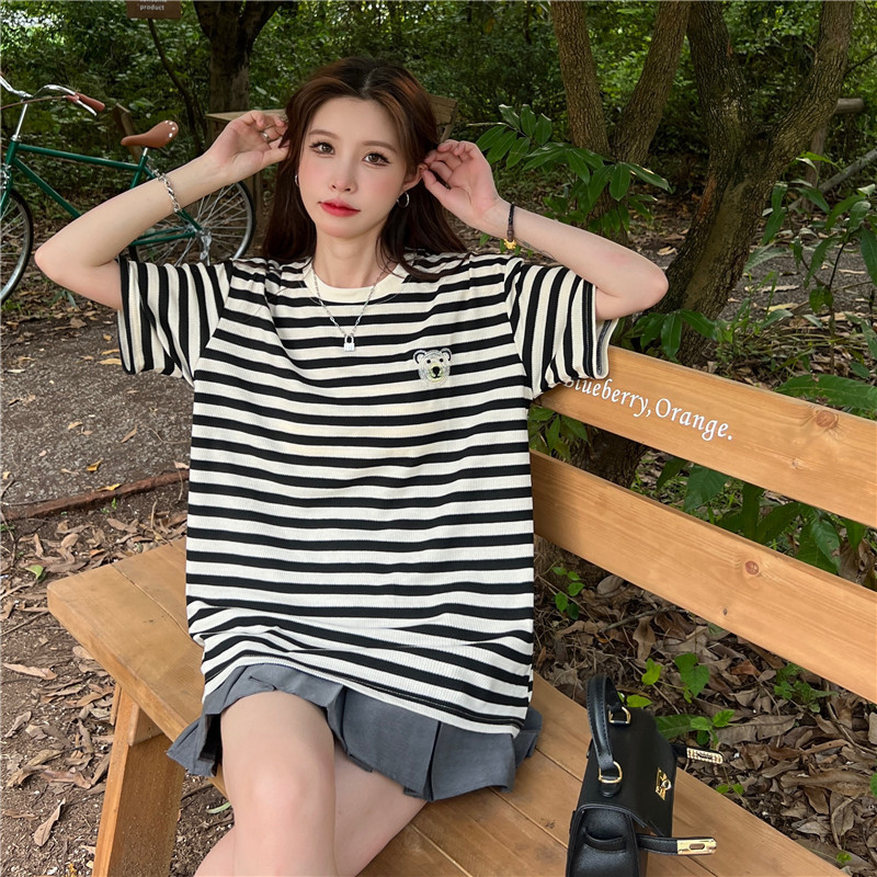 RM15893#夏季色织格新款条纹宽松短袖T恤女打底衫