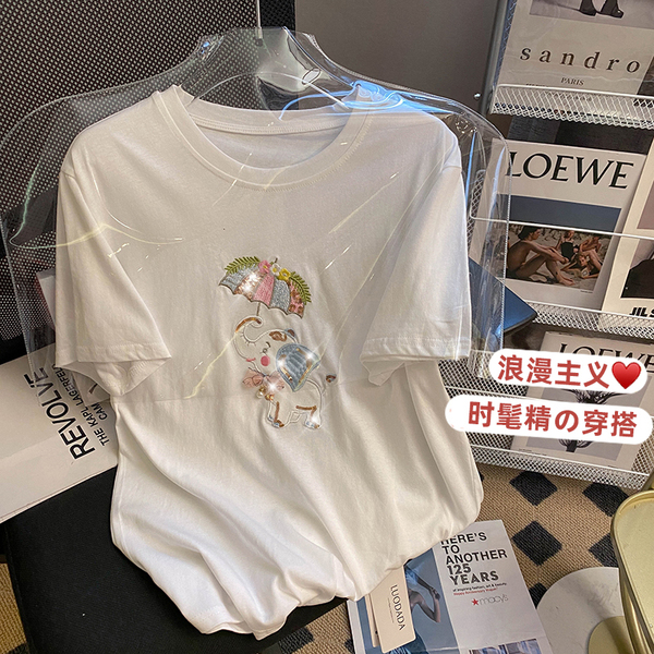 RM16099#T恤女2022夏季新款修身白色内搭ins潮珠片绣花纯棉短袖上衣
