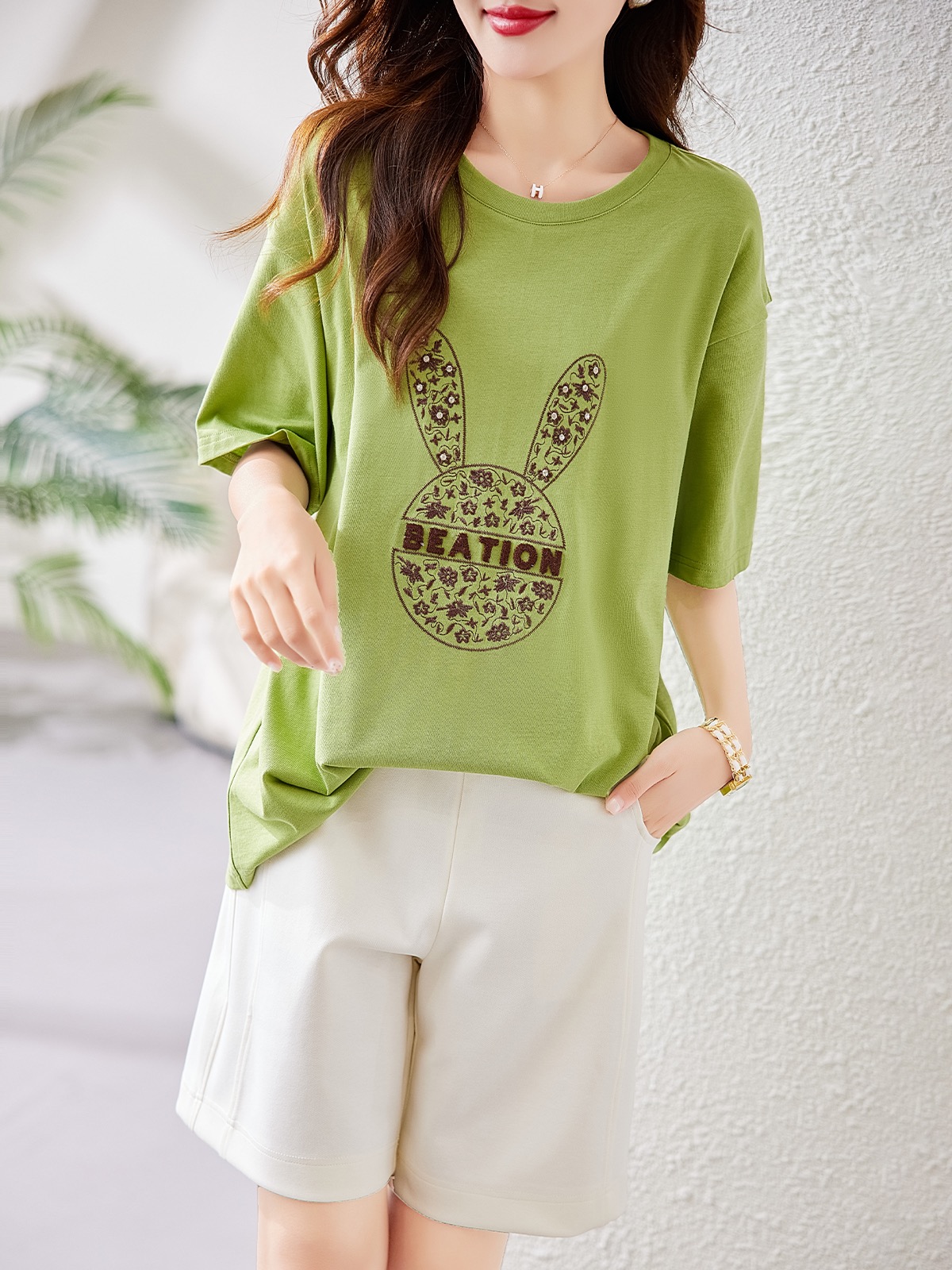 RM16206#绿色短袖T恤女2023新款欧货宽松半袖胖妹妹遮肚洋气减龄显瘦上衣