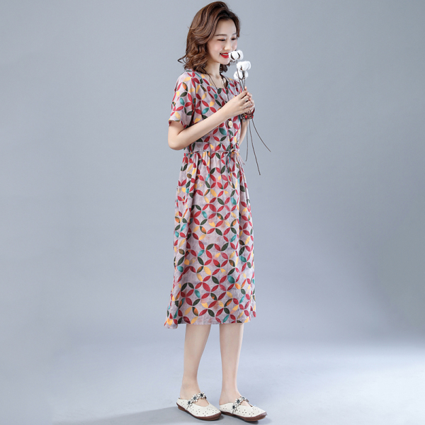 RM16233#棉麻夏季宽松印花显瘦短袖连衣裙