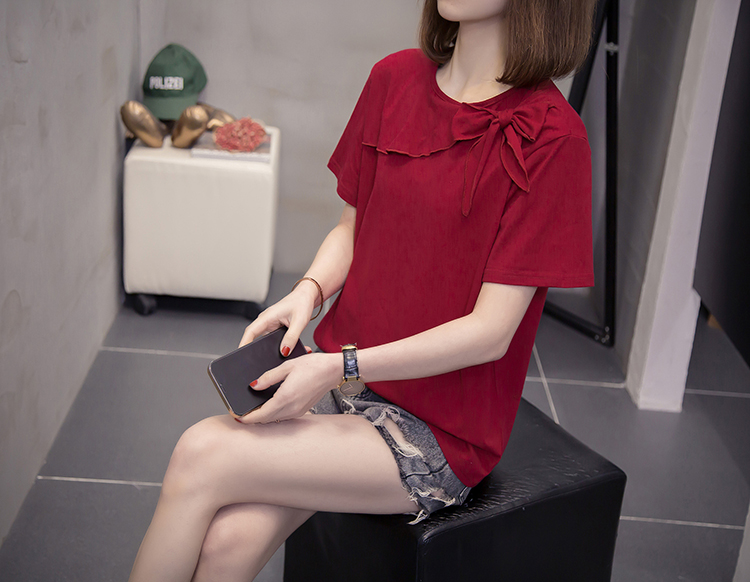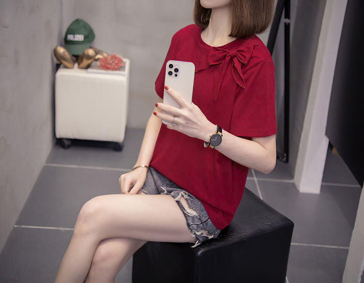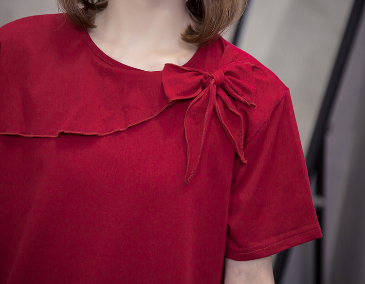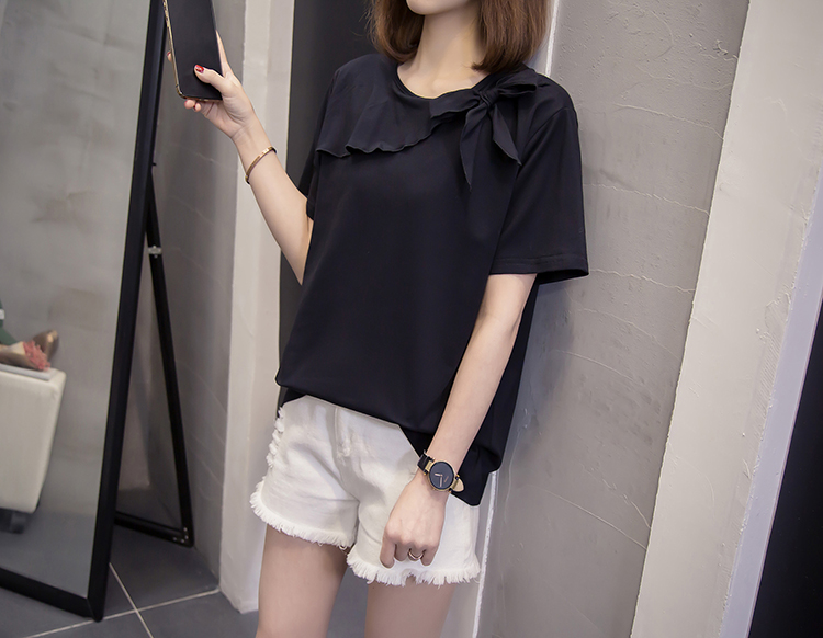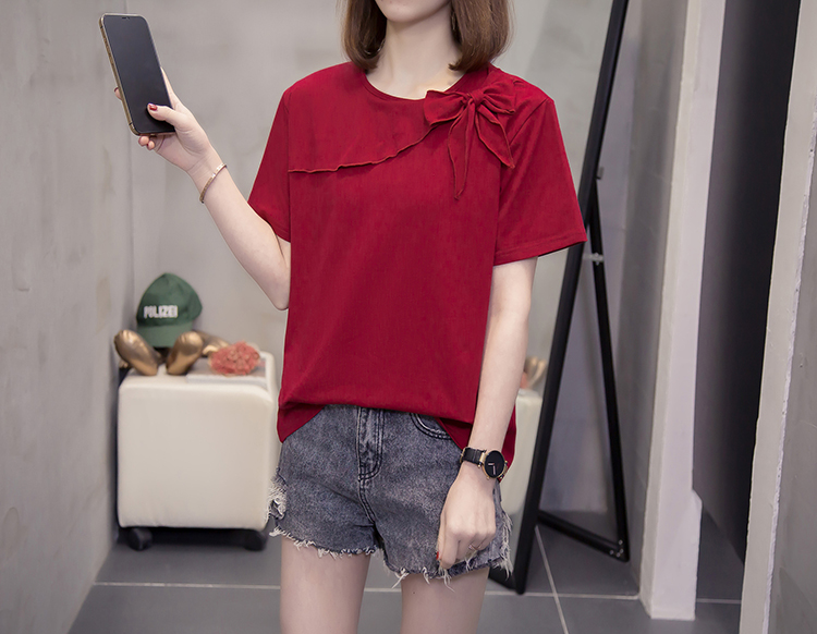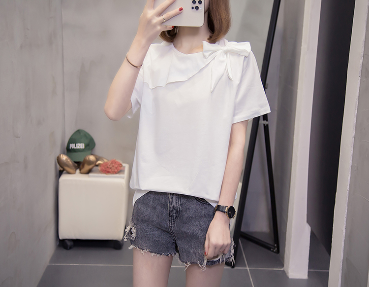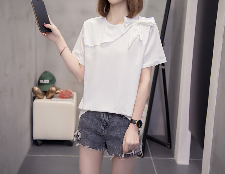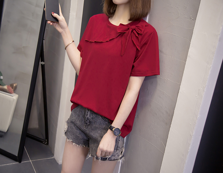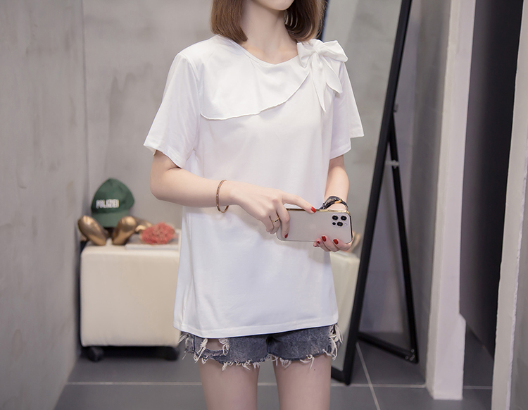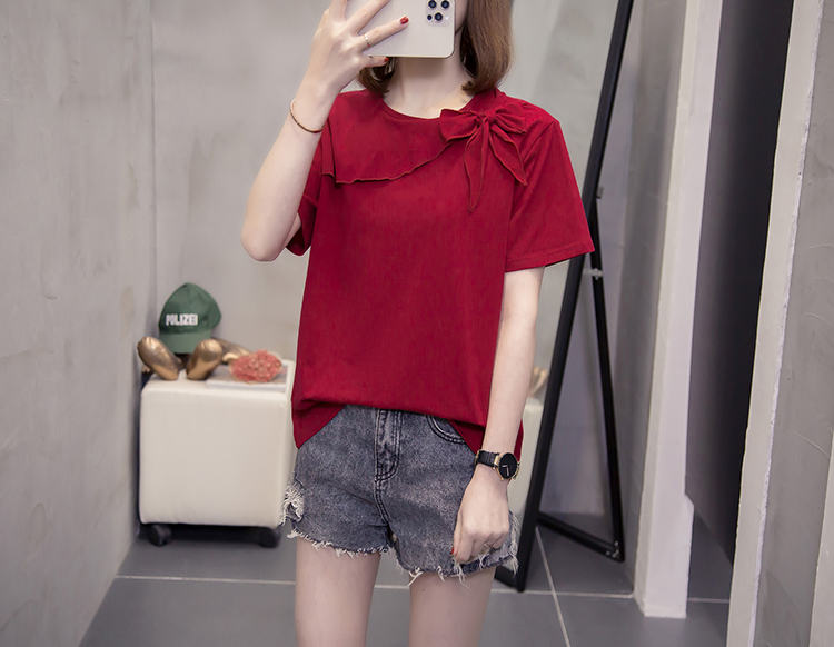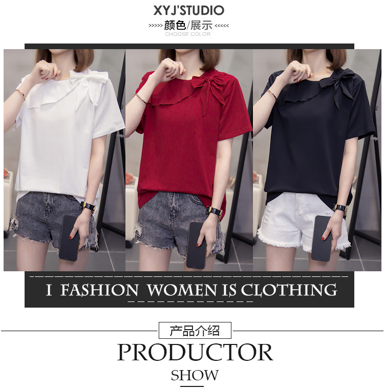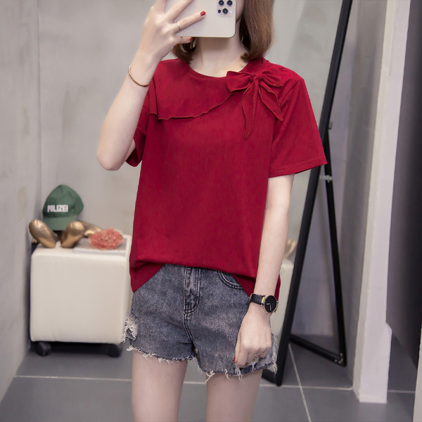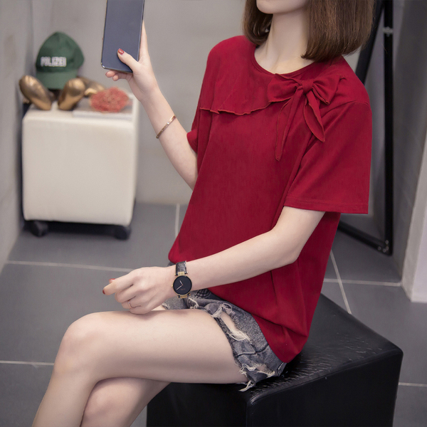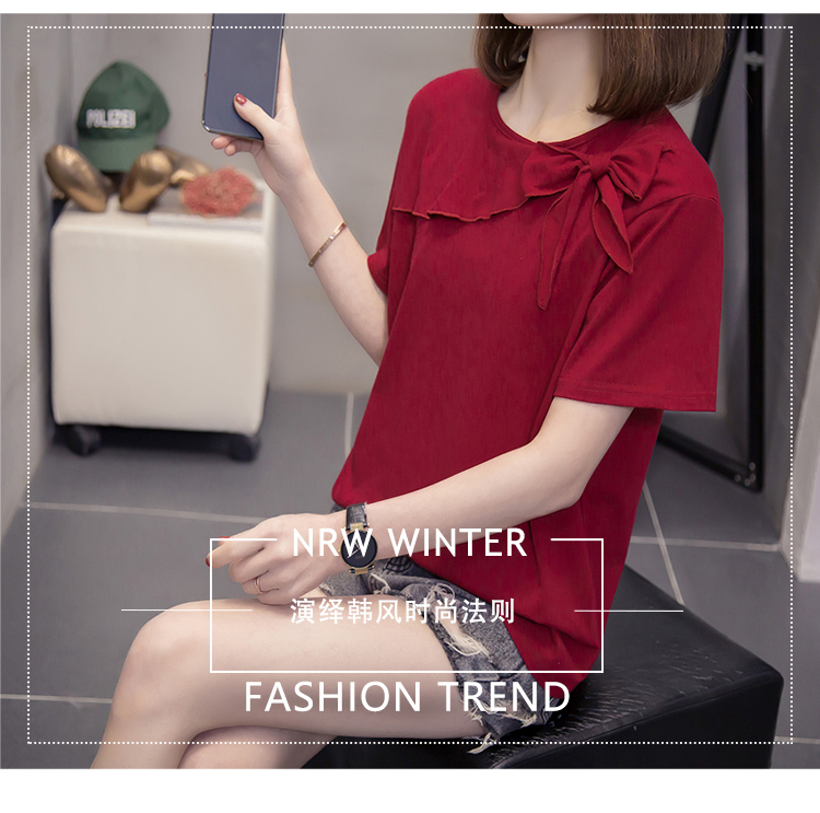 RM16464#夏装韩版加大码女宽松简约时尚百搭短袖T恤蝴蝶结系带女上衣