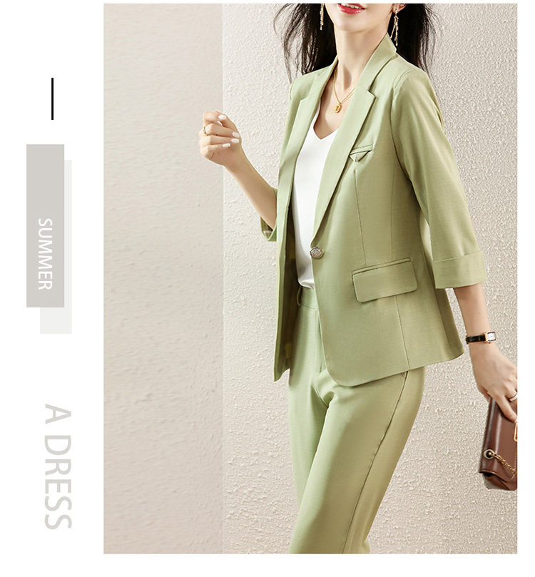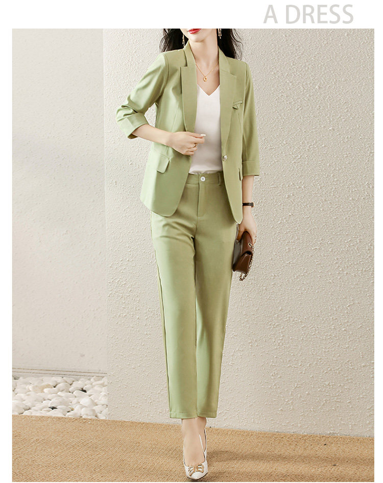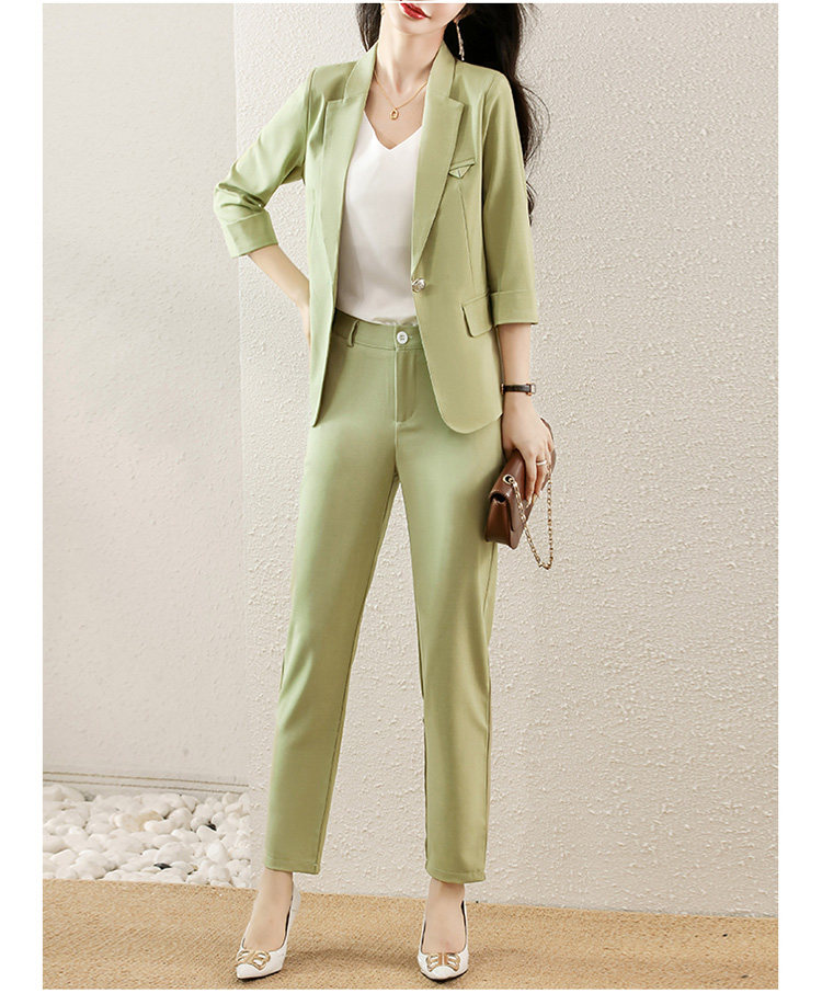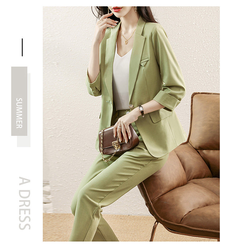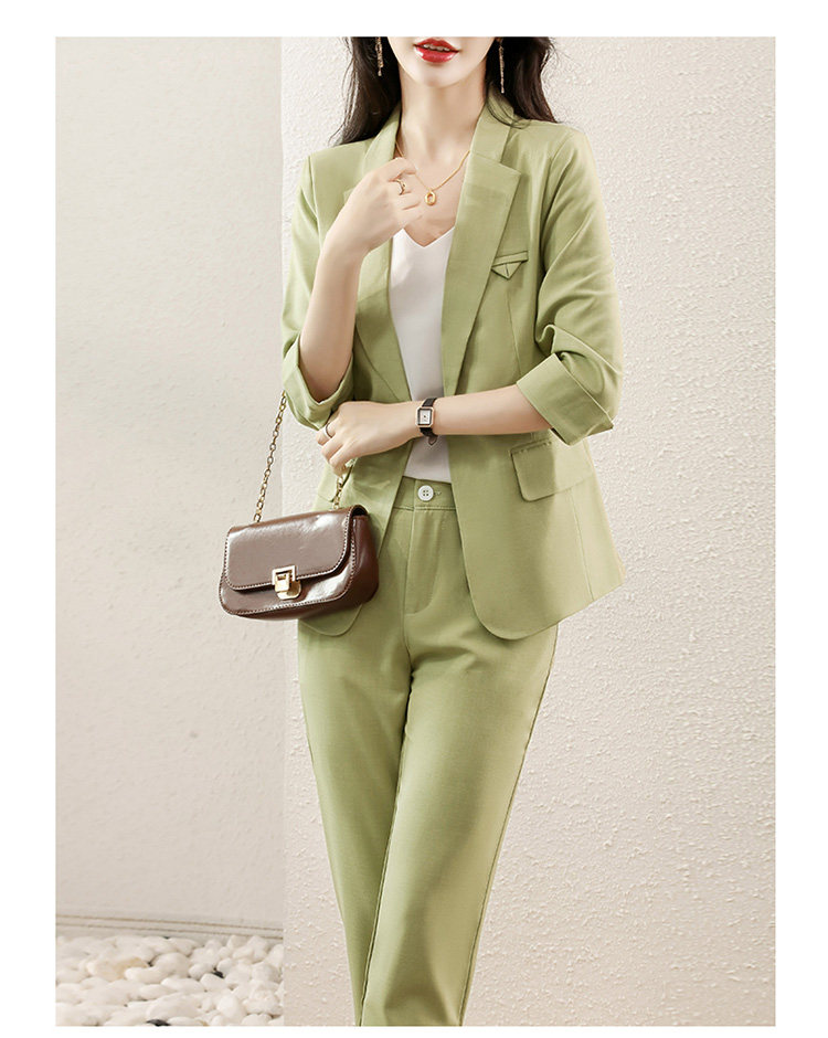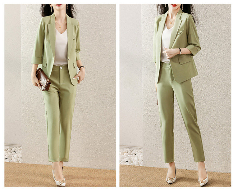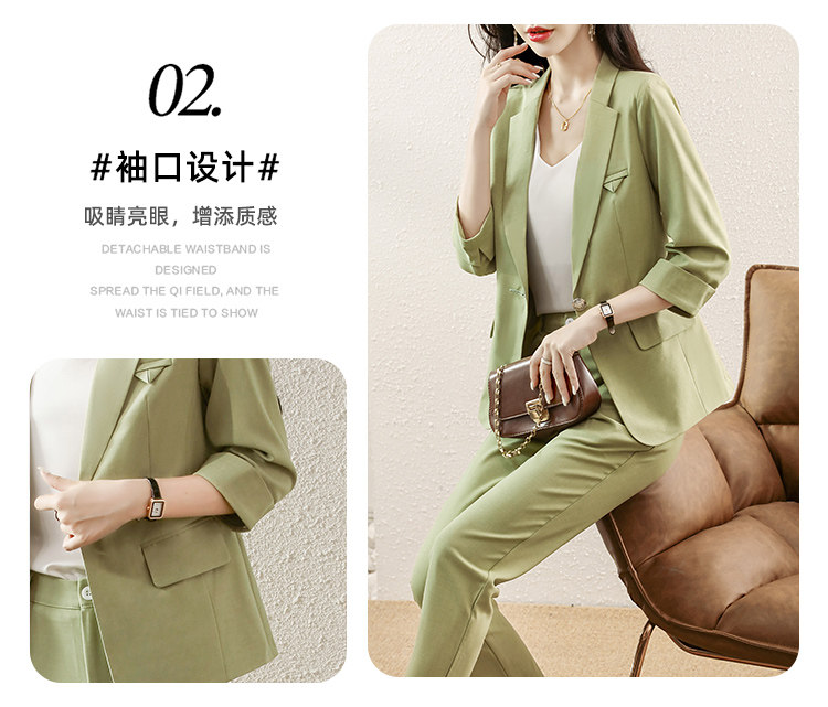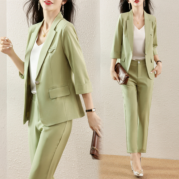 RM16636#职业套装女夏季薄款时尚气质女神范轻熟风绿色西装外套套裤工作服