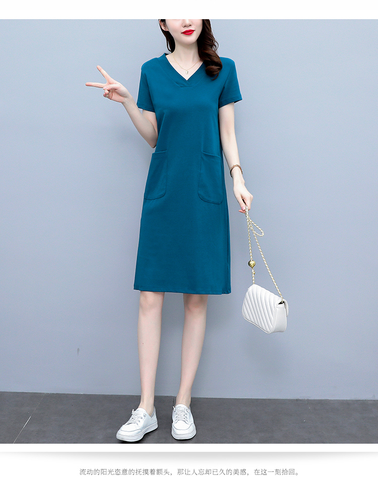 RM16719#纯棉大码短袖连衣裙女2023夏季中长款宽松V领胖mm显瘦遮肚裙子