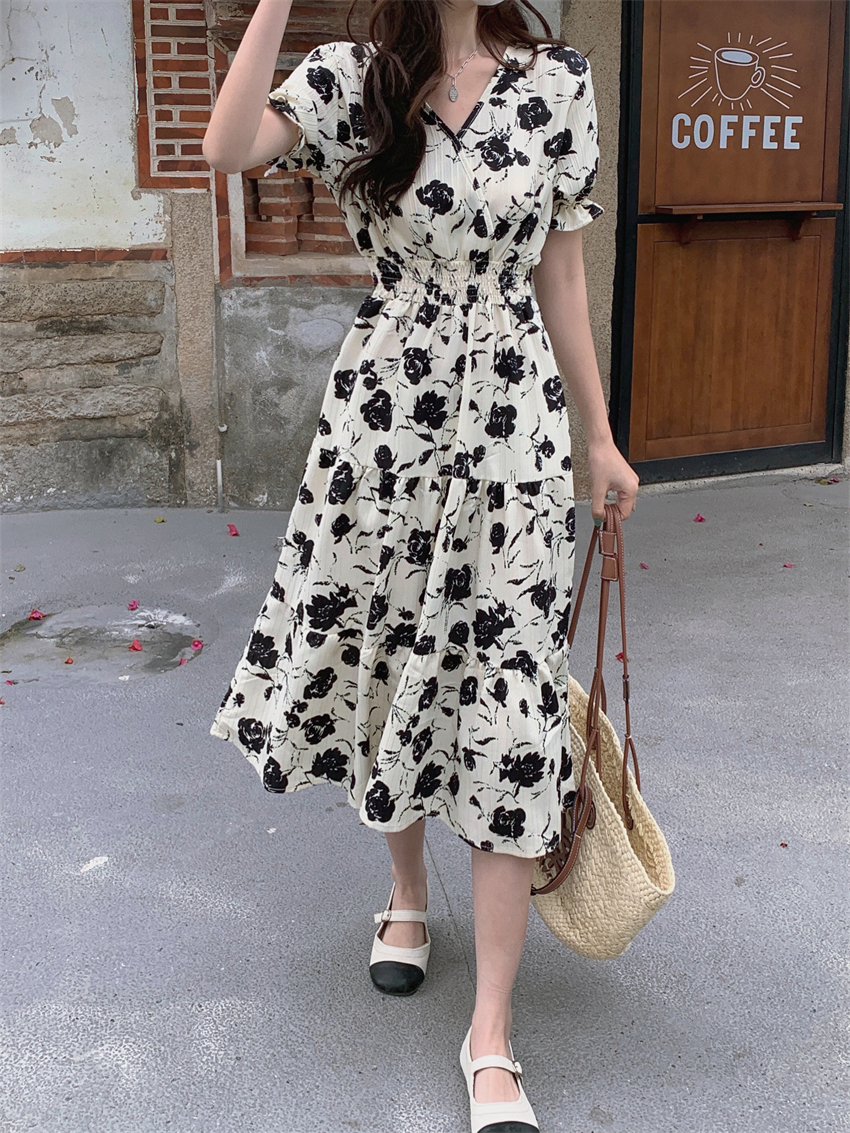 V领复古印花连衣裙,面料手感很顺滑