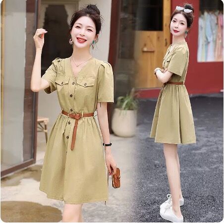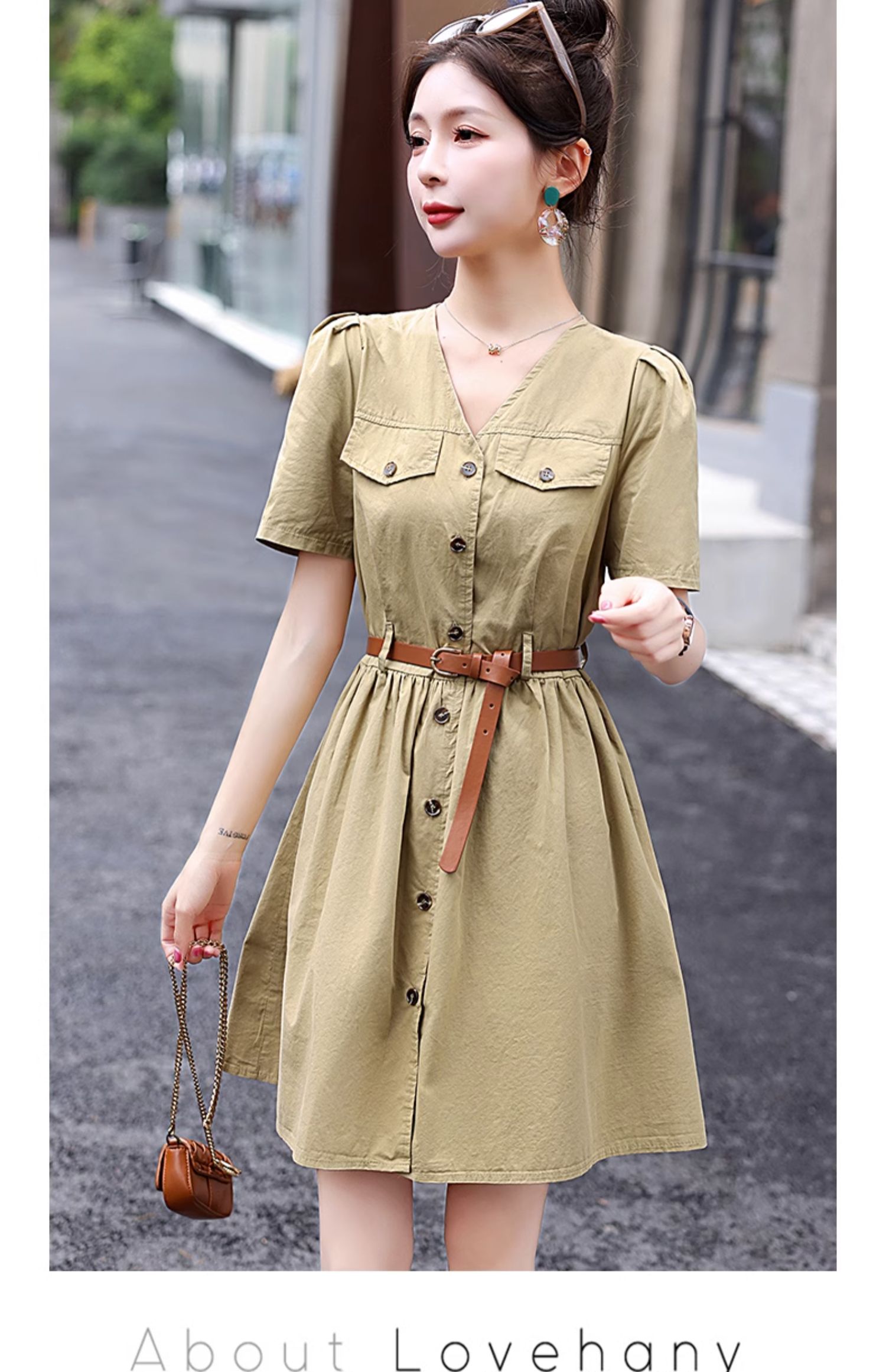 RM16785#夏天薄款小个子V领衬衫裙子女2023新款气质腰带收腰显瘦A字连衣裙