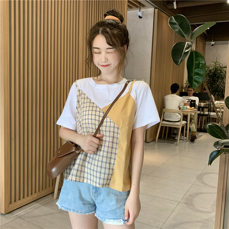 MY5120# 时尚百搭洋气休闲V领设计感假两件撞色短款短袖T恤女女裝貨源...