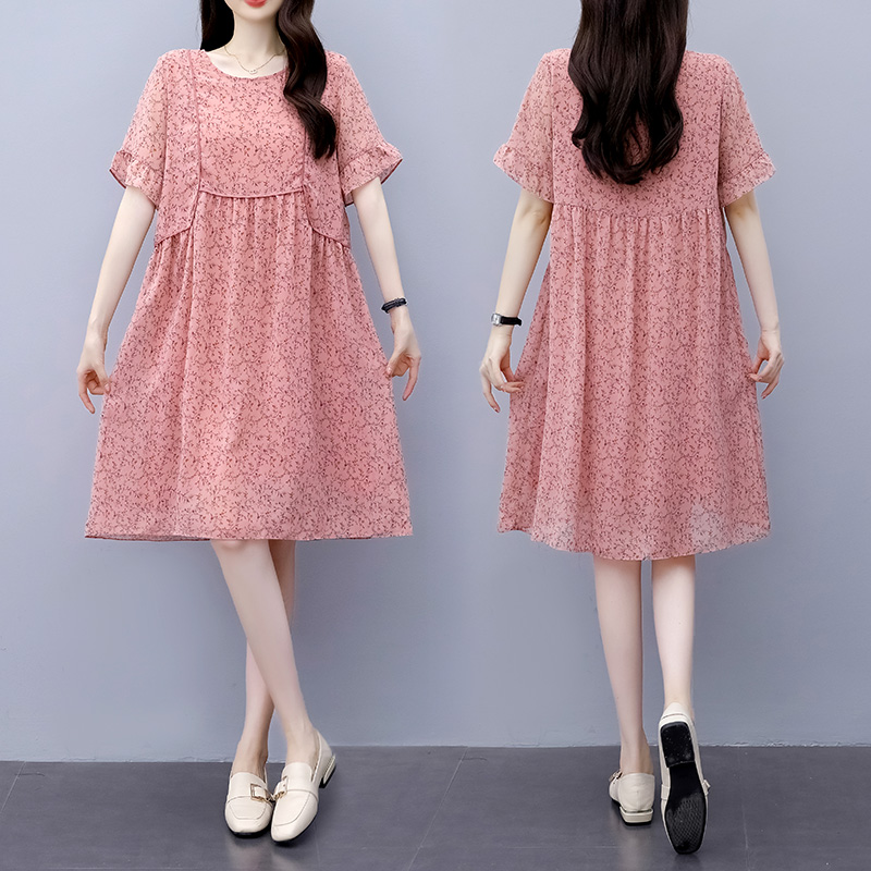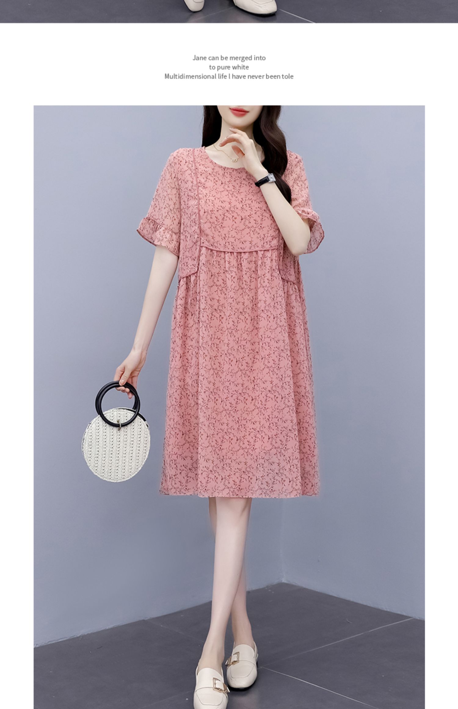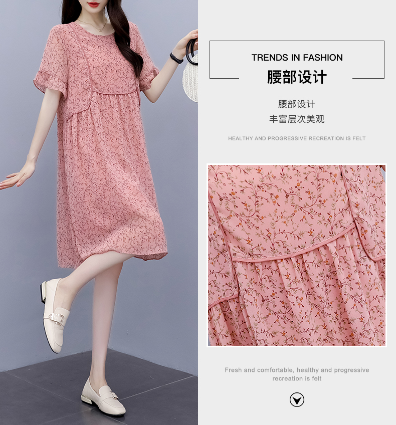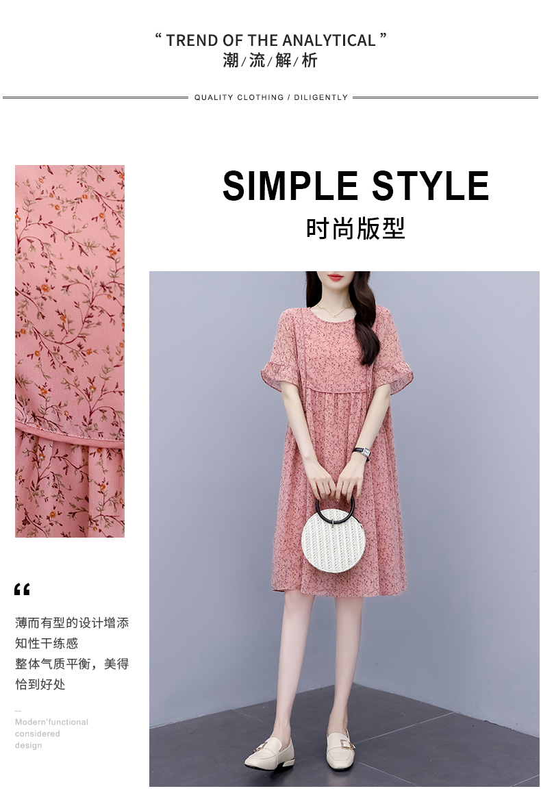 RM17041#夏季新款中长款宽松显瘦大码遮肚子雪纺印花a字连衣裙子