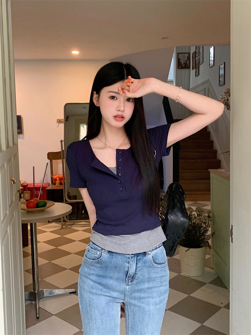 RM17067#大码胖MM千禧辣妹设计假两件深蓝色短袖T恤