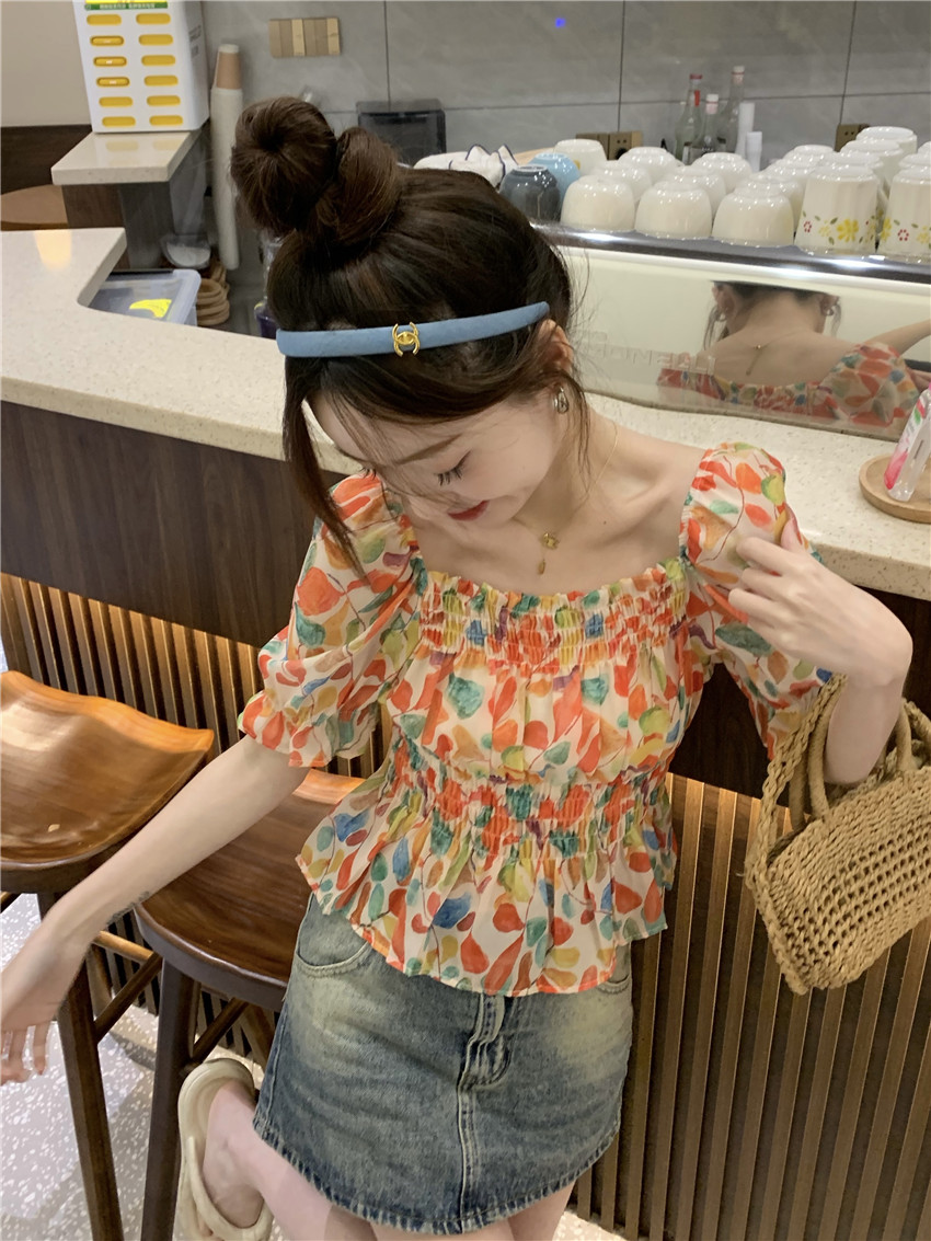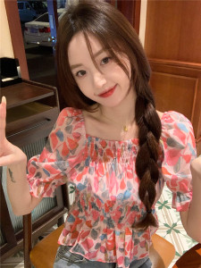 RM17308#法式甜美泡泡袖碎花雪纺衬衫女士夏季气质显瘦漂亮小衫上衣
