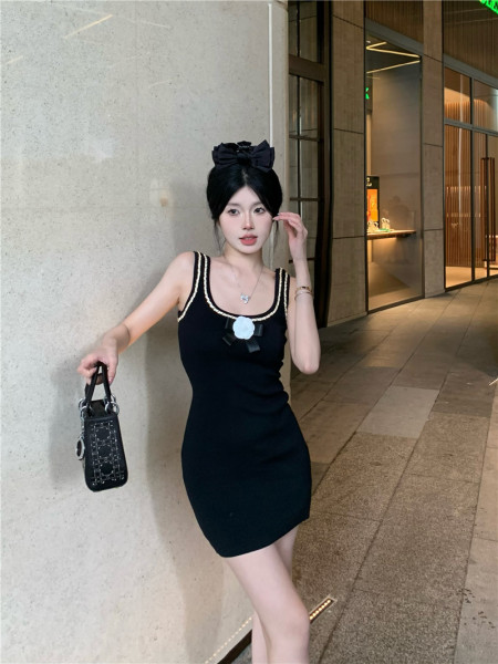 RM17478#夏季新山茶花链条连衣裙收腰针织背心包臀无袖显瘦短裙