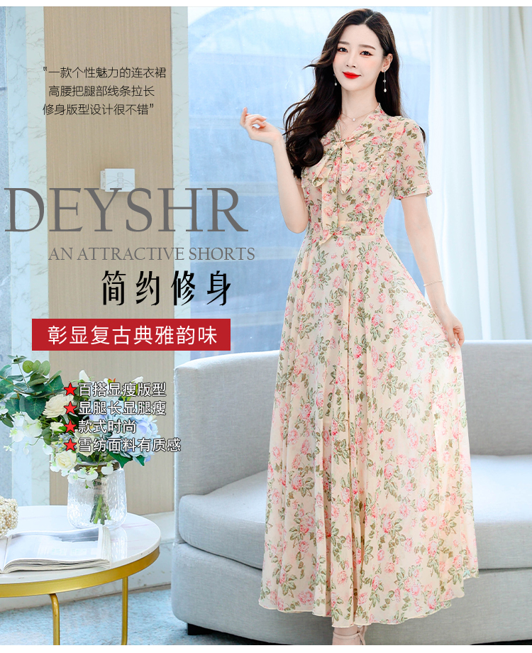 RM17488#新款印花花边蝴蝶结V领短袖收腰大摆海边雪纺过膝大码长裙
