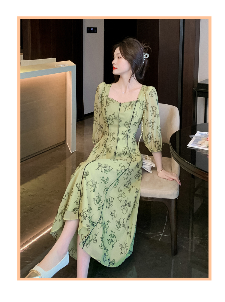RM17514#春夏重工撞色拉条简约印花五分袖长裙女钉珠碎花连衣裙
