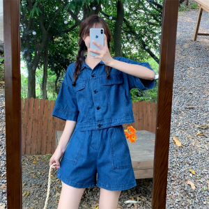 RM17566#夏装小个子洋气两件套宽松牛仔短外套搭阔腿短裤潮S-5XL200斤