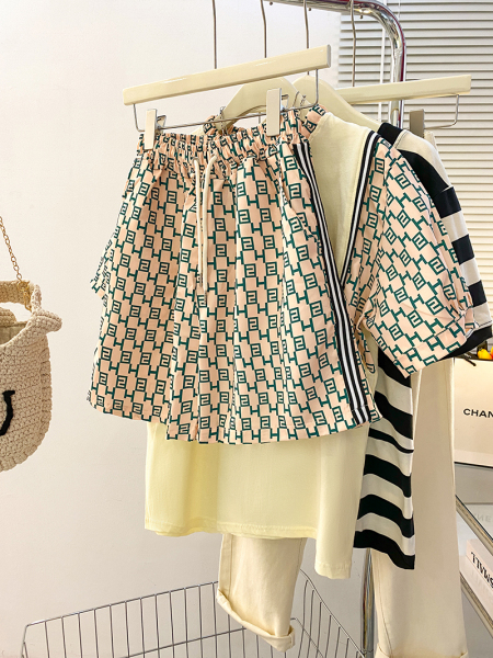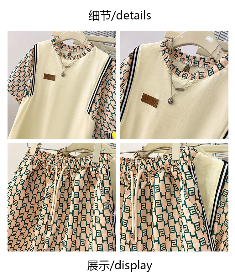 RM9626#大码女装2023夏季新款法式气质条纹拼接上衣+短裤两件套套装
