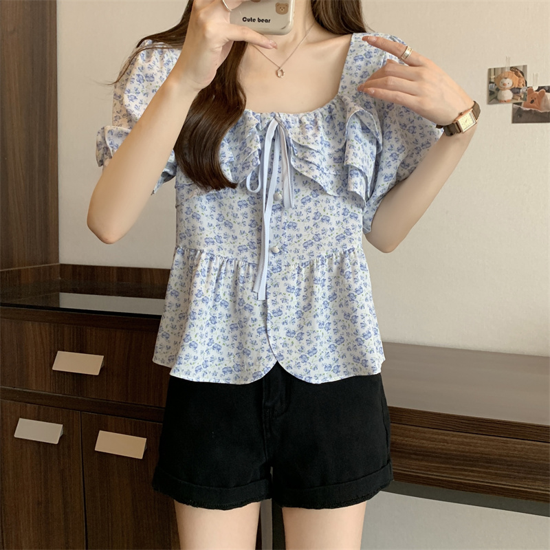 RM17778#大码女装胖MM设计感小清新碎花泡泡袖衬衫上衣女