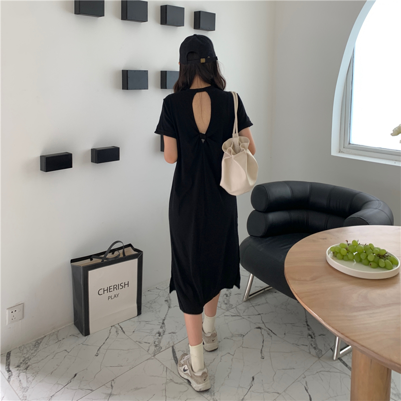 RM17808#夏季新款小心机露背长款连衣裙开叉过膝扭结