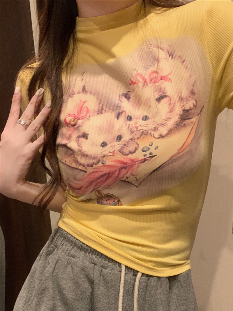RM18014#夏季新款修身显瘦辣妹卡通猫咪印花短袖T恤女上衣
