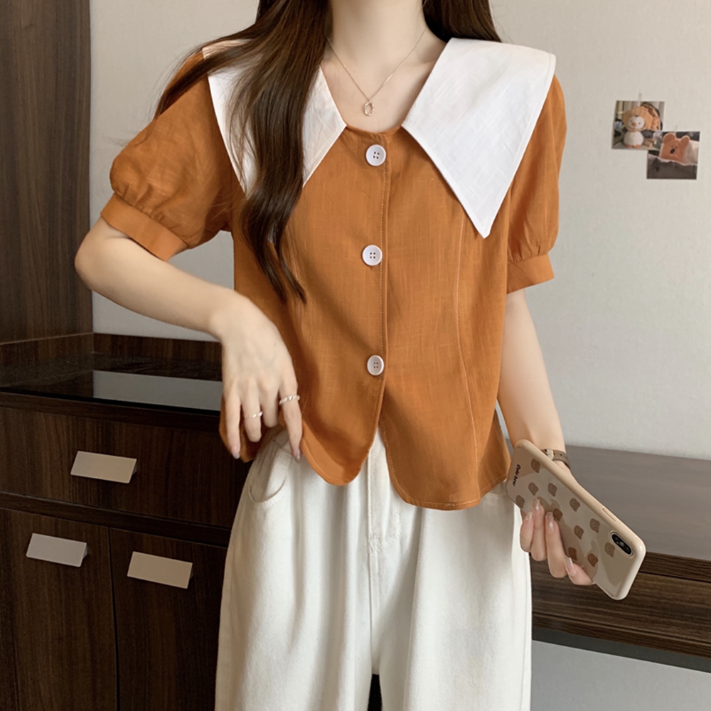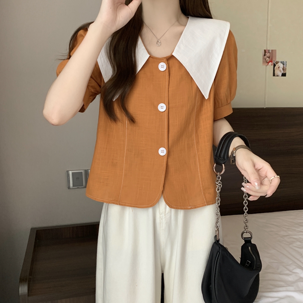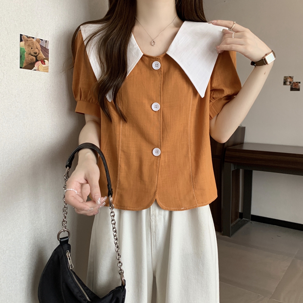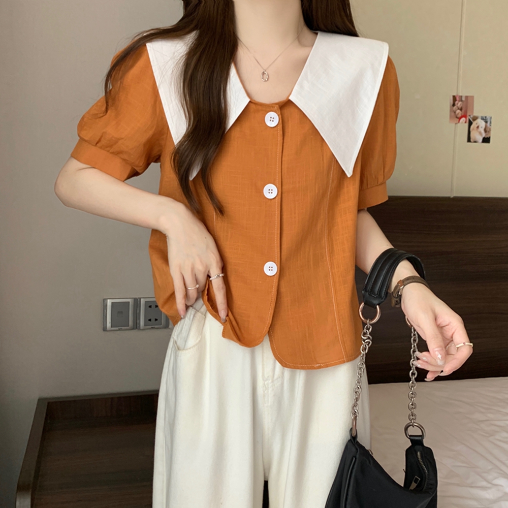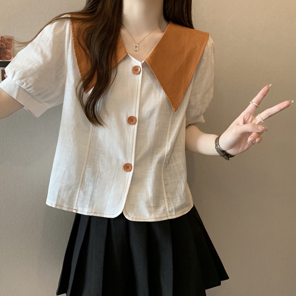 RM18065#夏装大码法式别致短款上衣泡泡袖衬衫娃娃领衬衣M-4XL200斤