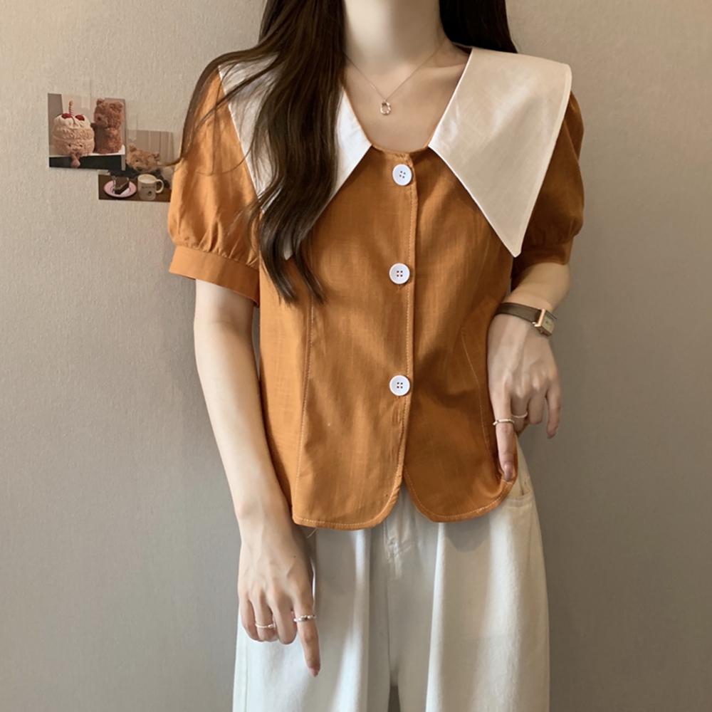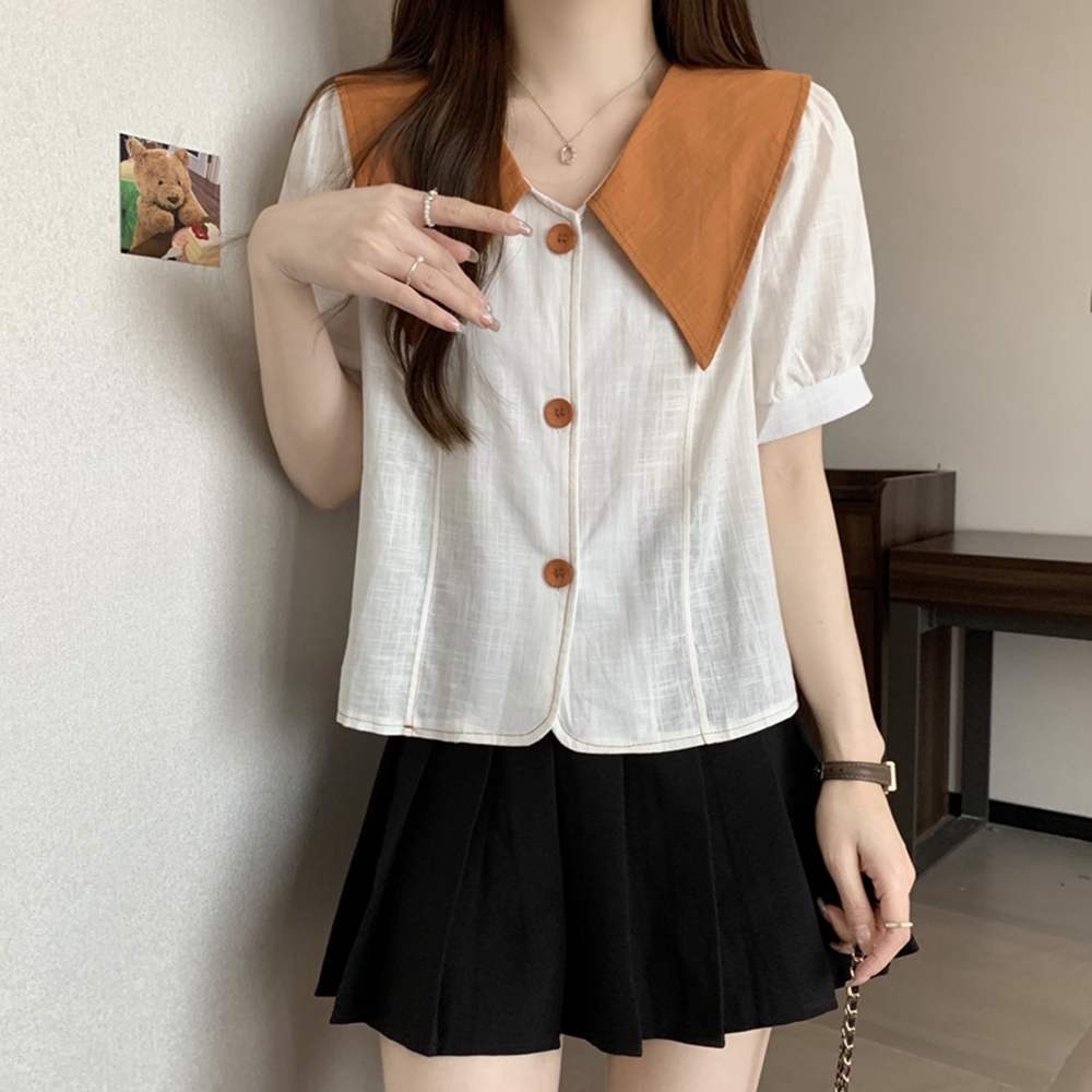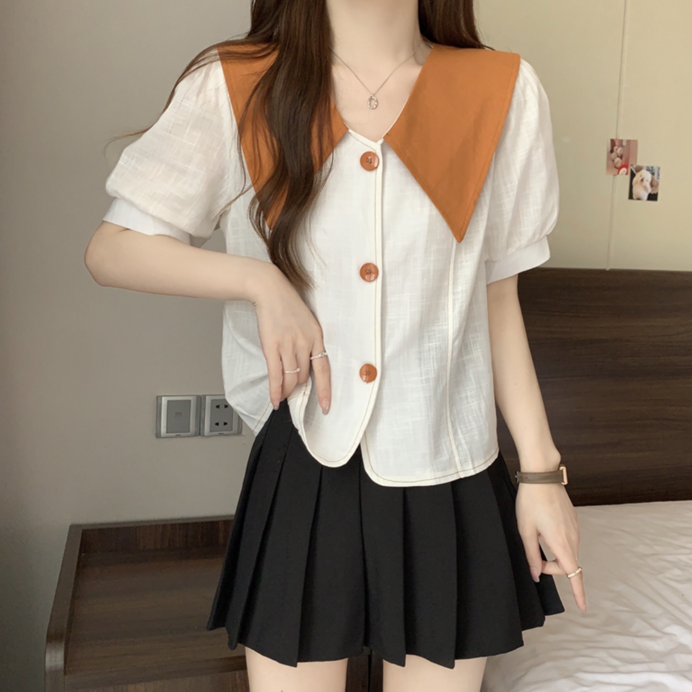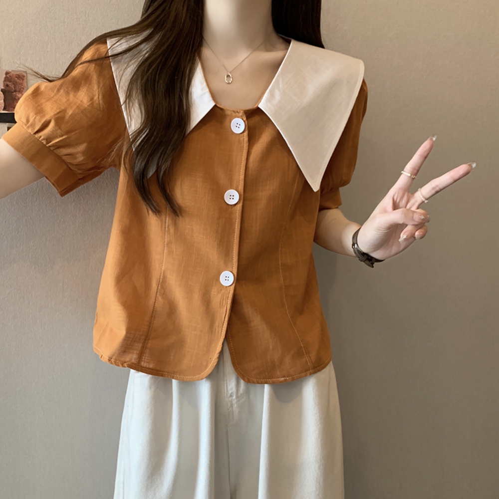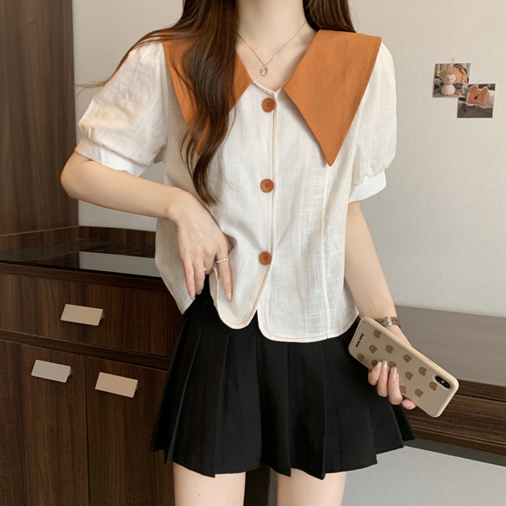 RM18065#夏装大码法式别致短款上衣泡泡袖衬衫娃娃领衬衣M-4XL200斤