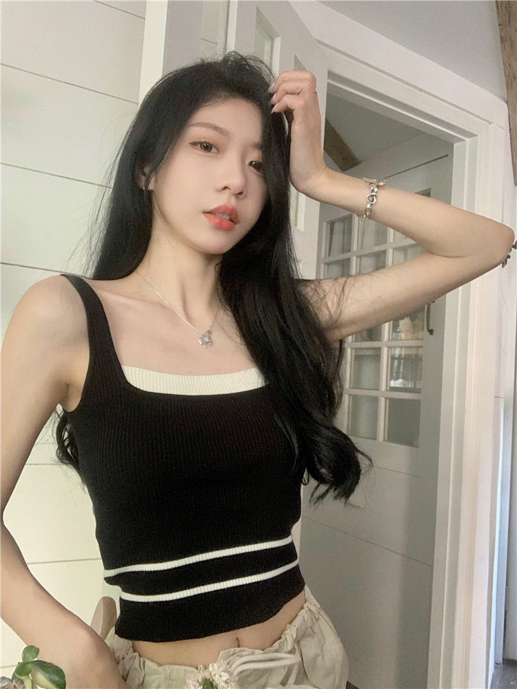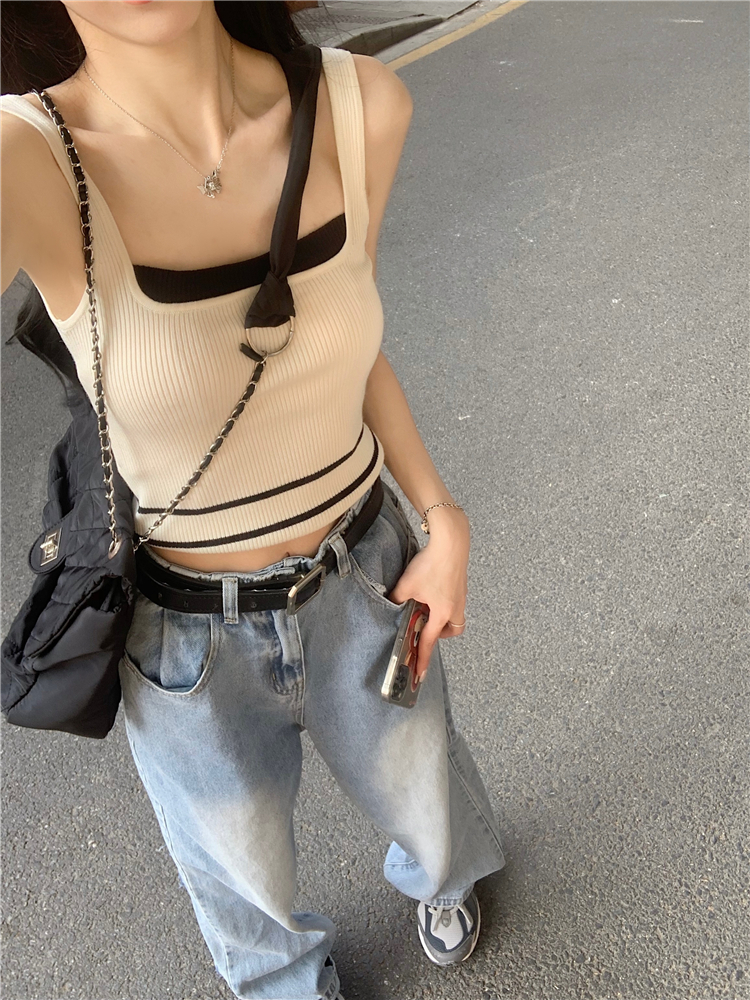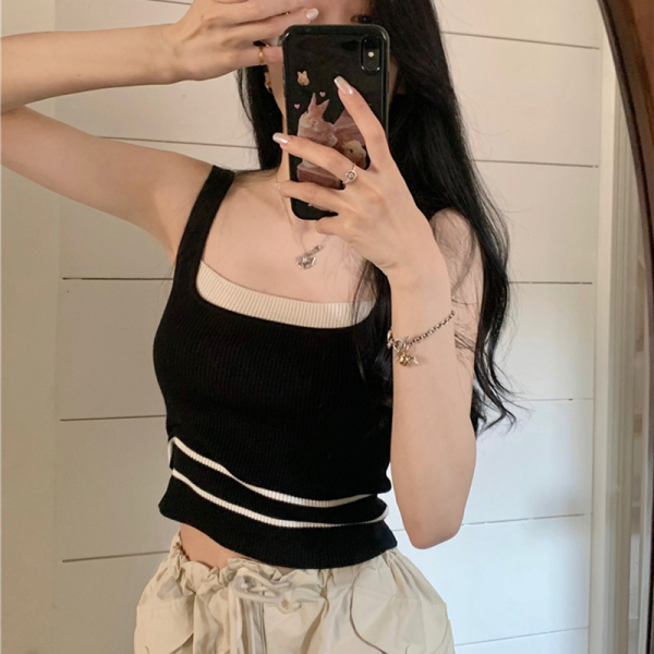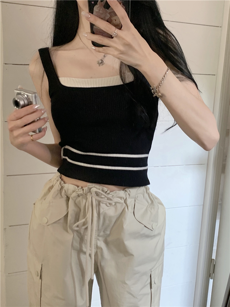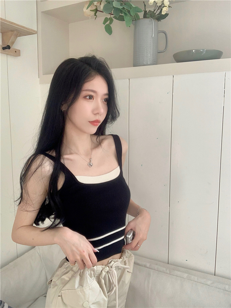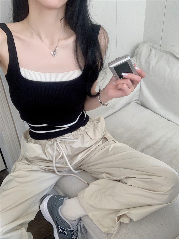 RM18066#冰丝假两件针织吊带背心女内搭夏季新款修身短款无袖辣妹上衣