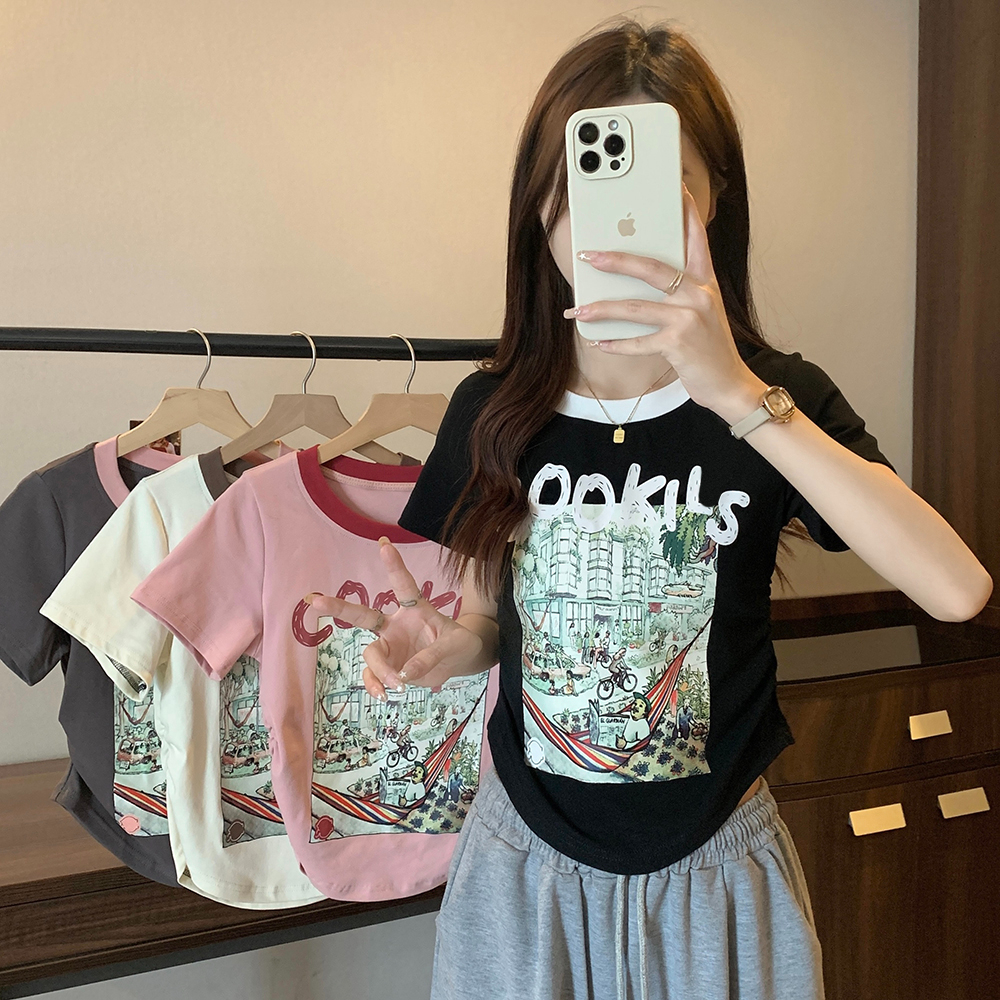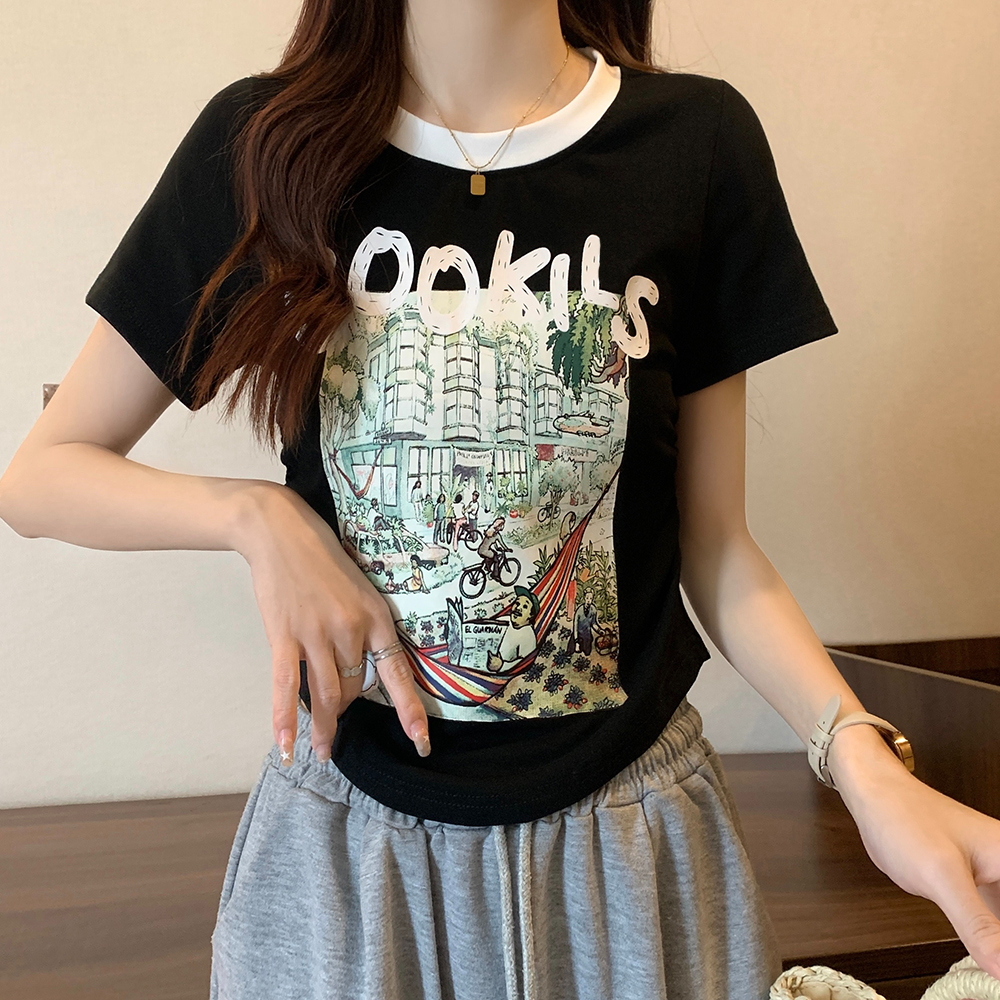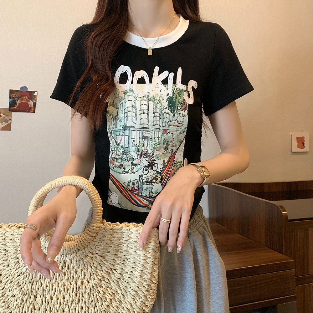 RM18068#大码胖mm夏女新款短袖印花艺术绘画圆领t恤正肩遮肉百搭显瘦上衣