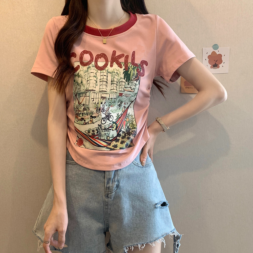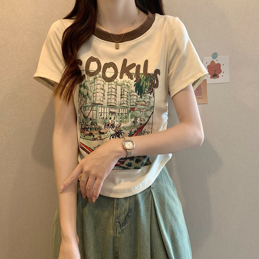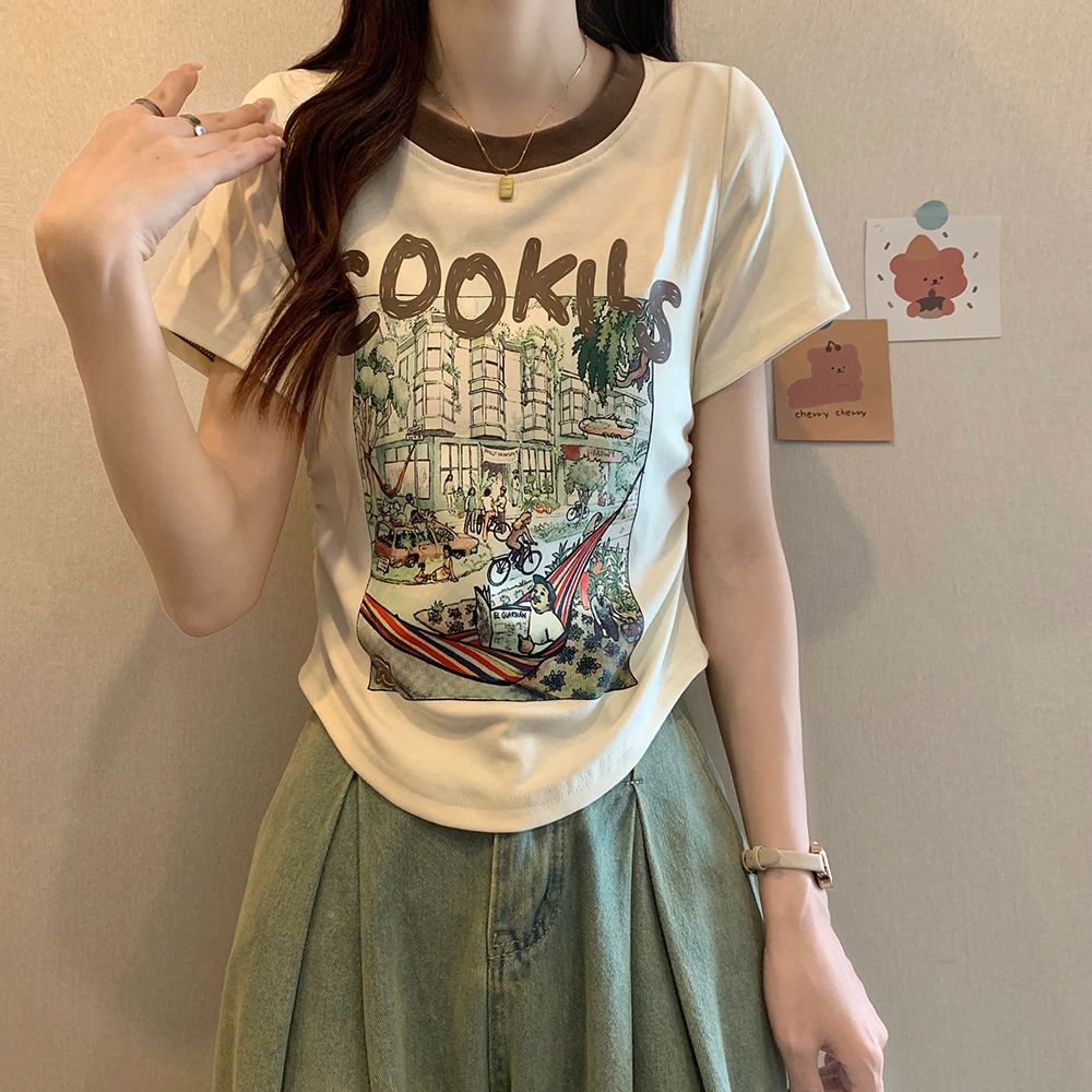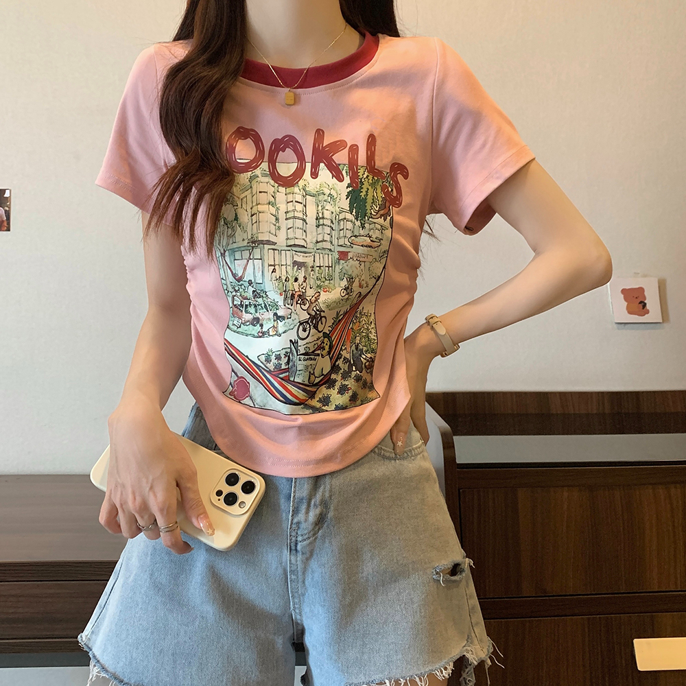 RM18068#大码胖mm夏女新款短袖印花艺术绘画圆领t恤正肩遮肉百搭显瘦上衣