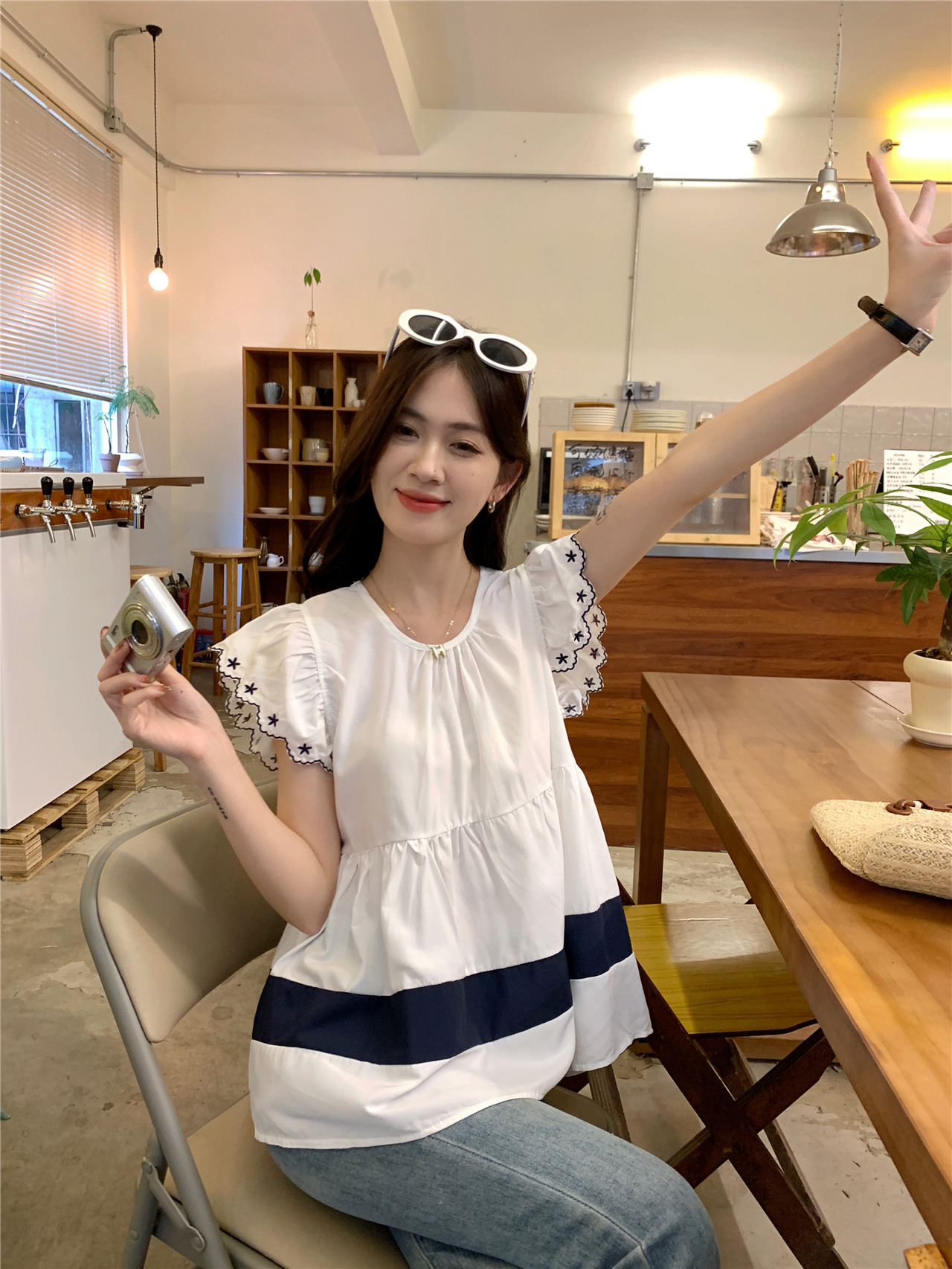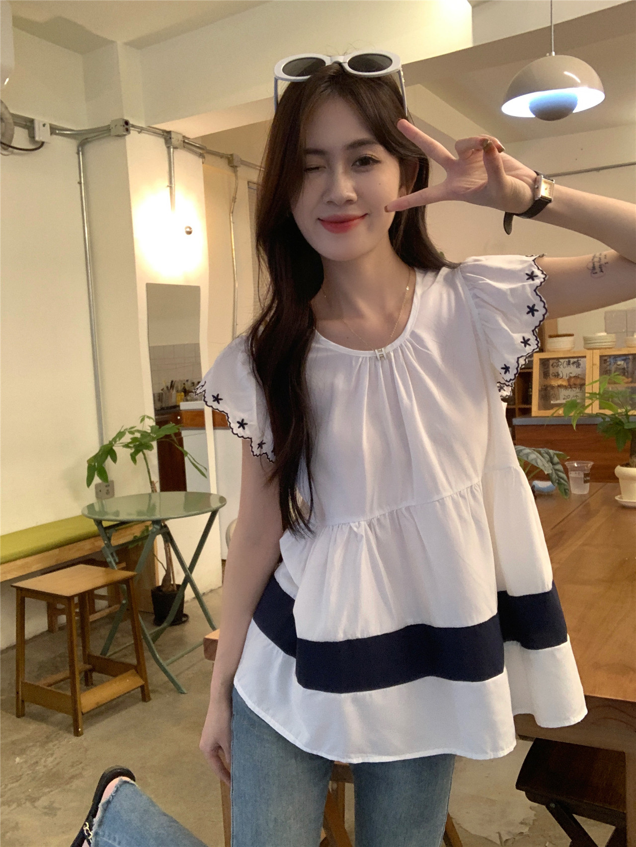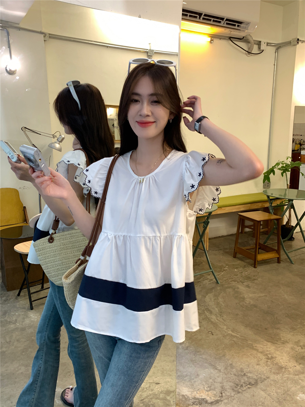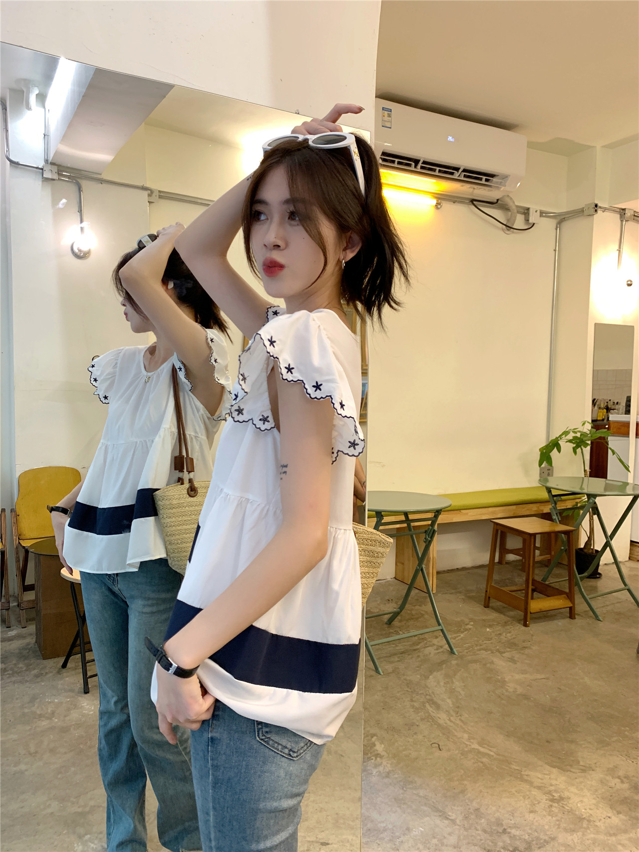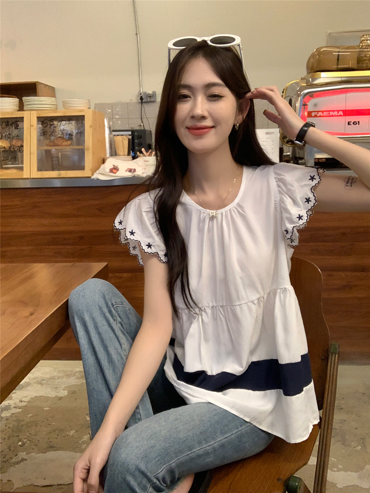RM18198#法式甜美风衬衫女夏季飞飞袖设计感绣花拼接宽松显瘦上衣